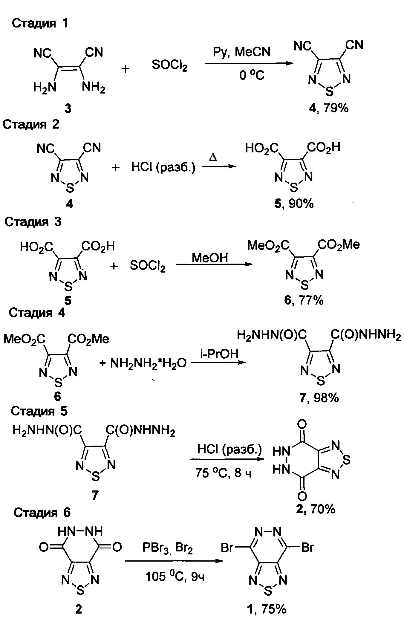 Предлагаемое изобретение относится к области органической химии, а именно, к способу получения неописанного в литературе 4,7-дибром[1,2,5]тиадиазоло[3,4-d]пиридазина (1), который может найти применение в качестве исходного соединения в синтезе органических солнечных ячеек с объемным гетеропереходом с повышенными значениями ширины запрещенной зоны, плотности тока короткого замыкания и коэффициентом заполнения, от которых напрямую зависит значение фотовольтаической эффективности солнечной ячейки -величины, которая характеризует производительность фотовольтаического устройства. Фотовольтаический метод преобразования солнечной энергии в электрическую, по мнению лауреата Нобелевской премии по физике академика Ж.И. Алферова, является одним из наиболее эффективных. Одной из наиболее перспективных альтернатив кремниевых и других неорганических преобразователей солнечной энергии являются солнечные батареи на основе органических фотосенсибилизаторов. Существует несколько типов органических фотовольтаических структур, среди которых можно выделить ячейки с объемным гетеропереходом, когда фрагменты донора и акцептора находятся в одном фотоактивном слое и формируют трехмерные взаимопроникающие наноразмерные сети из доменов с дырочной и электронной проводимостью, а также ячейки слоистого типа, в которых фотоактивные компоненты образуют отдельные слои. Фотовольтаические структуры с объемным гетеропереходом, как правило, содержат в качестве донора полисопряженные гетероциклические соединения, а в качестве акцептора производные фуллерена. Для увеличения эффективности преобразования света необходимо получать красители как с высокой плотностью тока короткого замыкания для увеличения ширины спектра поглощения, так и с высоким напряжением холостого хода для уменьшения ширины запрещенной зоны. Поэтому сегодня в мире широко исследуются новые компоненты для органических фотоактивных материалов, которые будут удовлетворять этим требованиям. Одной из наиболее перспективных групп такого рода соединений являются структуры полициклического характера, содержащие электронодефицитные гетероциклы в своей структуре. В литературе описаны соединения на основе 2,1,3-бензотиадиазолов (В. А. D. Neto, А. А. М. Lapis, Е. N. da Silva Известен способ получения 5,6-дигидро[1,2,5]тиадиазоло[3,4-d]пиридазин-4,7-диона (2) (I. Sekikawa, Oxidation of 5-Methyl-2,1,3-benzothiadiazole with Potassium Permanganate. Bull. Chem. Soc. Japan, 1960, 33, 1229). Известное соединение 2 является наиболее близким по структуре предлагаемому 1 и по способу получения. 5,6-Дигидро[1,2,5]тиадиазоло[3,4-d]пиридазин-4,7-дион получают путем нагревания 1,2,5-тиадиазол-3,4-дикарбогидразида в разбавленной соляной кислоте в течение 8 часов при 75°C с выходом 48%. В свою очередь 1,2,5-тиадиазол-3,4-дикарбогидразид, который не является коммерчески доступным реагентом, получают пятистадийным синтезом из коммерчески доступных диметилового эфира ацетилендикарбоновой кислоты и дихлорида дисеры. Всего общий способ получения 5,6-дигидро[1,2,5]тиадиазоло[3,4-d]пиридазин-4,7-диона 2 включает 6 стадий и заключается в обработке дихлорида дисеры хлором в четыреххлористом углероде с образованием дихлорида серы с выходом 100%, с последующей обработкой дихлорида серы газообразным аммиаком с образованием тетранитрида тетрасеры с 14%-ным выходом (М. Villena-Blanco, W. L. Jolly, Tetrasulfur tetranitride, S4N4