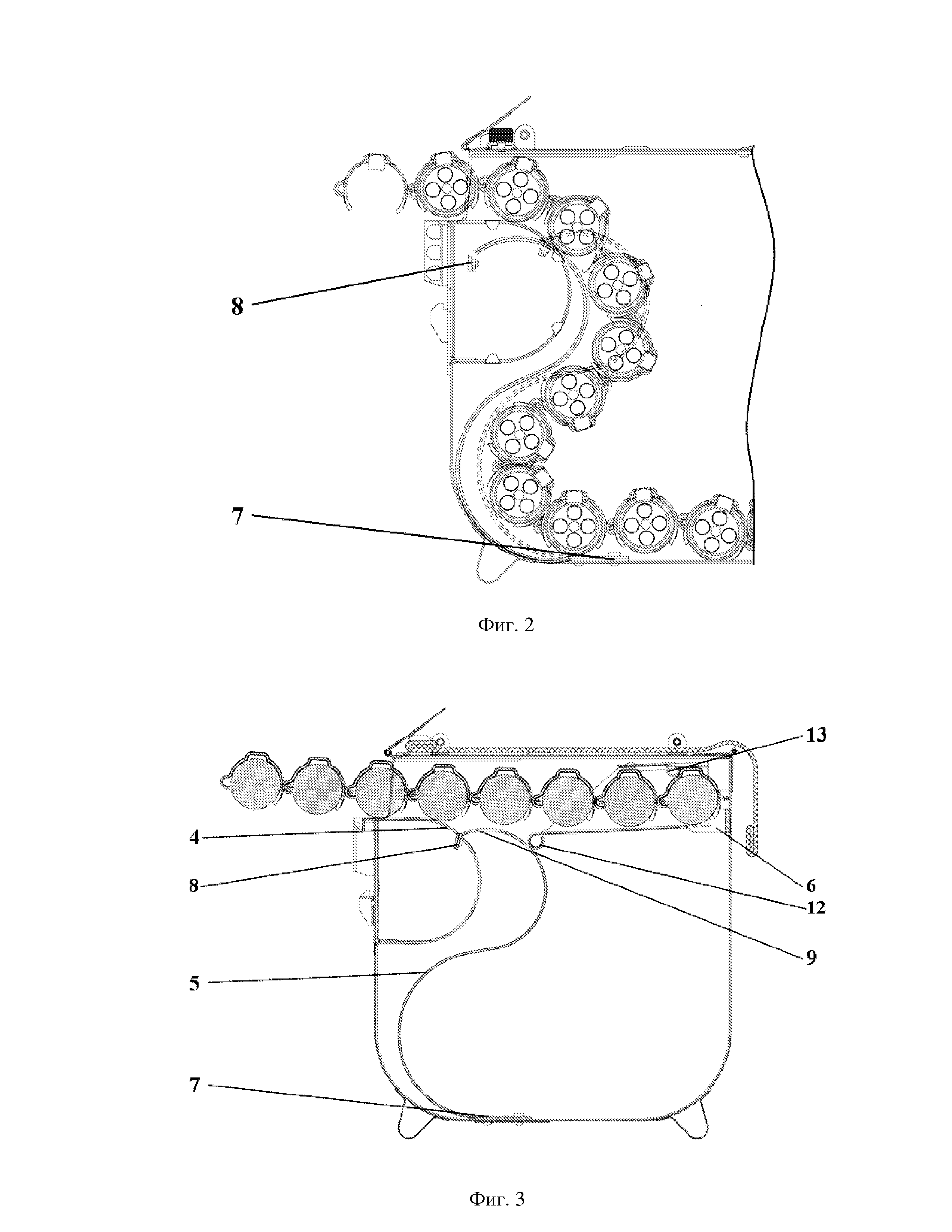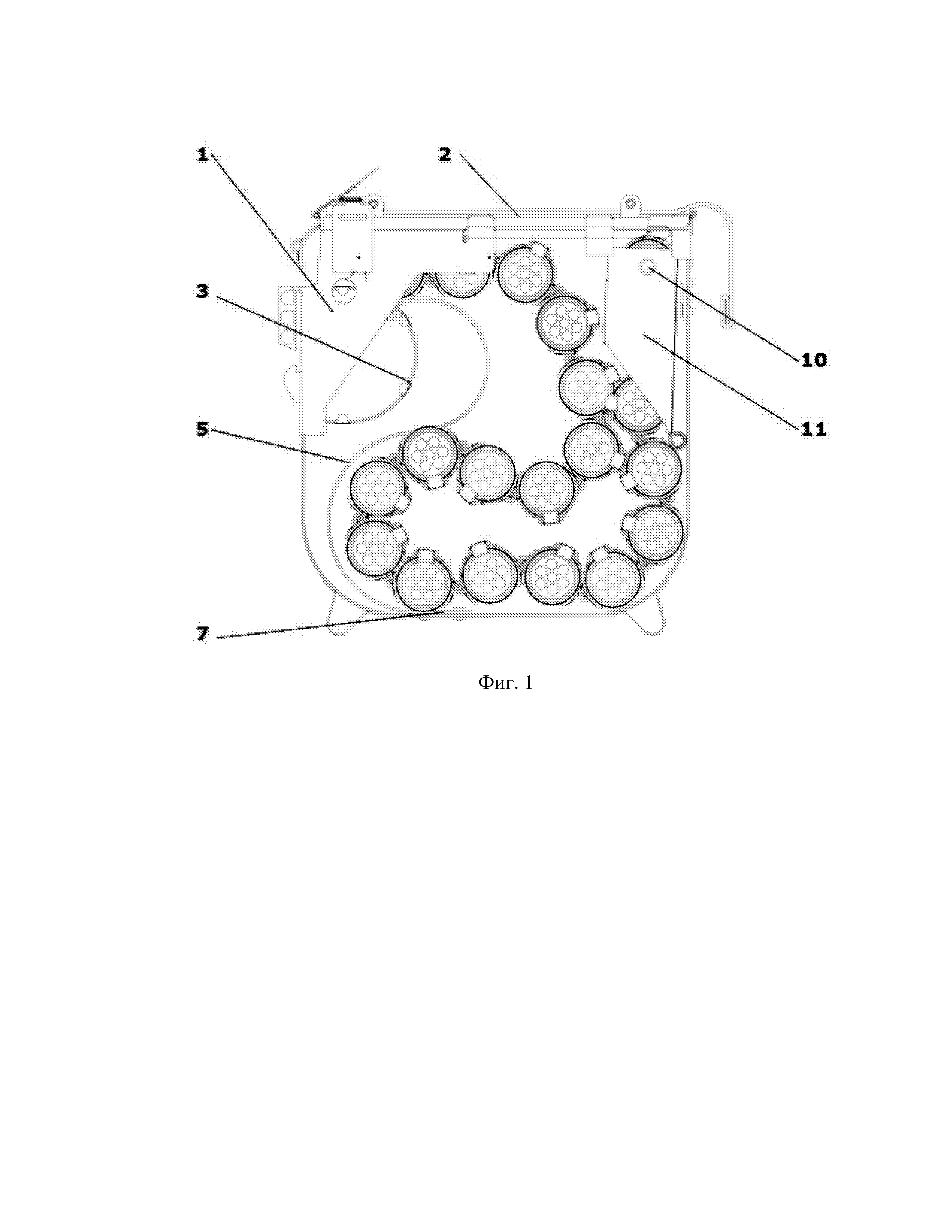 Изобретение относится к автоматическому оружию с ленточным питанием и может быть использовано в автоматическом стрелковом оружии. Известен магазин 30 мм автоматического гранатомета на станке АГС17 (см. Руководство по 30-мм автоматическому гранатомету на станке АГС-17, Министерство обороны СССР, Москва, 1982 г., http://forum.guns.ru/forummessage/18/140174.html), состоящий из коробки, в которую укладывается патронная лента. Лента помещается в коробку через горловину, продвигается через открытую створку по улитке, выполненной в коробке. После укладки ленты первое пустое звено надевается на выступ, и крышка и створка закрываются на защелки. Недостатками данной конструкции являются: - повышенное усилие подачи ленты из магазина и, как следствие, низкая надежность работы; - сложность снаряжения магазина; - длительное время снаряжения магазина. Известен магазин автоматического оружия (см. патент US 7,500,421 от 28.04.2005, F41A 9/61), выбранный в качестве ближайшего аналога, содержащий коробку для укладывания патронной ленты, направляющую патронной ленты. Коробка состоит из двух отсеков, соединенных закрытым рукавом. Направляющая патронной ленты подпружинена и при вытягивании ленты из первого отсека следит за свободной петлей ленты и поддерживает её под действием пружины. В коробке на оси расположена вращающаяся перегородка. При полностью снаряженном магазине перегородка предотвращает зацепление патронов в ленте друг за друга. При освобождении первого отсека перегородка под действием ленты поворачивается и прижимается к стенке корпуса. Недостатком данной конструкции является низкая надежность работы из-за большого количества деталей, осуществляющих подачу патронной ленты. Технической задачей заявляемого изобретения является повышение надежности работы. Технический результат заключается в обеспечении направления и демпфирования патронной ленты и стабилизации «хвоста» ленты в конце стрельбы для исключения самопроизвольного инерционного выпадения патрона из звена внутри магазина при стрельбе. Поставленная задача достигается тем, что магазин автоматического оружия с ленточным питанием содержит корпус для укладывания ленты, крышку, направляющую, демпфер. Демпфер выполнен в виде упругого элемента с возможностью деформации, при этом один конец упругого элемента закреплен в нижней части корпуса, а второй выполнен с возможностью перемещения, дополнительно на осях, выполненных в боковых стенках корпуса, с возможностью поворота установлена шторка прямоугольного профиля, в верхней части которой выполнен прижим, на задней стенке корпуса в верхней части расположена опора для конца ленты. Демпфер выполнен S-образной формы. Прижим может быть выполнен в виде упругого элемента или подпружиненным. Нижняя часть шторки выполнена с наружной отбортовкой в виде петли. Сущность изобретения поясняется чертежами, на которых изображено: на фиг.1 – общий вид магазина, магазин полностью снаряжен; на фиг.2 – общий вид магазина, положение демпфера при стрельбе; на фиг.3 – общий вид магазина, положение конца ленты при подаче. Магазин автоматического оружия содержит корпус 1 для укладывания патронной ленты. Корпус представляет собой прямоугольный металлический штампосварной ящик, сверху которого расположена крышка 2. Внутри корпуса 1 размещаются полукруглая направляющая 3 с о