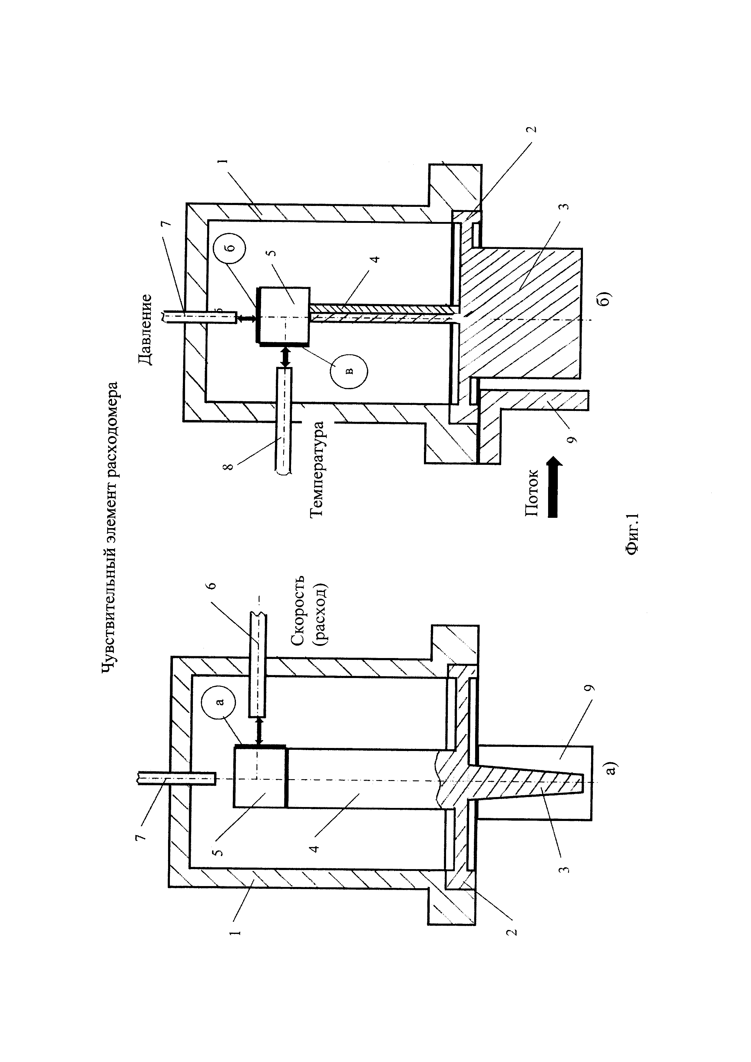 Заявляемое техническое решение относится к средствам измерения расхода и количества текучих сред, а именно - к вихревым расходомерам с плохообтекаемым телом, содержащим чувствительный элемент в виде выступающей в поток лопатки (крыла) с развитой поверхностью, перемещающейся под воздействием вихрей, срывающихся с плохообтекаемого тела. Известен чувствительный элемент вихревого расходомера (Патент США №6003384, МПК G01f 1/32, НКИ 73/861.22, опубл. 21 12.1999) [1], содержащий лопатку, расположенную вдоль потока и закрепленную в центре круглой упругой мембраны перпендикулярно ее плоскости, рычаг-противовес в виде гильзы, прикрепленный к другой стороне мембраны соосно с лопаткой, составляющий с ней одно целое и имеющий одинаковый с лопаткой геометрический момент инерции, и емкостной детектор перемещений рычага. Под воздействием переменного скоростного напора, создаваемого образующимися за телом обтекания вихрями, лопатка и связанный с ней рычаг совершают колебательное движение. Перемещение рычага преобразовывается с помощью детектора в переменный (близкий к синусоидальному) электрический сигнал, частота которого пропорциональна скорости потока (объемному расходу). Поскольку моменты инерции лопатки и рычага одинаковы, вибрации не влияют на работу чувствительного элемента. Недостаток вышеописанного чувствительного элемента состоит в том, что с его помощью возможно измерение расхода только жидких сред, плотность и вязкость которых слабо зависит от давления и температуры. При измерении расхода жидкости, вязкость которых сильно зависит от температуры, в состав расходомера вводят датчик температуры, позволяющий учитывать изменения вязкости, а при измерении расхода газообразных сред (вязкость и плотность которых сильно зависят от температуры и давления) в состав расходомера дополнительно включают датчик давления. Чувствительный элемент, датчики давления и температуры подключают к измерительно-вычислительному блоку, с помощью которого вводится поправка на изменения вязкости и вычисляется объемный расход, приведенный к нормальным условиям, или массовый расход. Указанное решение требует усложнения конструкции расходомера, а также увеличенных расходов на его техническое обслуживание из-за наличия отдельных датчиков температуры и расхода. Частично от указанного недостатка свободен наиболее близкий к заявляемому техническому решению чувствительный элемент вихревого расходомера, содержащий прочный корпус, прикрепленную к корпусу утолщенной периферической частью круглую упругую мембрану, закрепленную в центре мембраны перпендикулярно ее плоскости и расположенную вдоль потока жесткую лопатку с глухим отверстием, в котором установлен малогабаритный термодатчик, жесткий рычаг-противовес в виде гильзы, прикрепленный к другой стороне мембраны соосно с лопаткой, составляющий с ней одно целое и имеющий одинаковый с лопаткой геометрический момент инерции, и емкостной чувствительный элемент, образуемый рычагом-противовесом и охватывающим его изолированным цилиндрическим электродом (Патент США №6988418, МПК G01F 1/32, НКИ 73/861.22, опубл. 24.01.2006) [2]. Под воздействием переменного скоростного напора, создаваемого образующимися за телом обтекания вихрями, лопатка и связанный с ней рычаг-противовес совершают колебательное движение. Переме