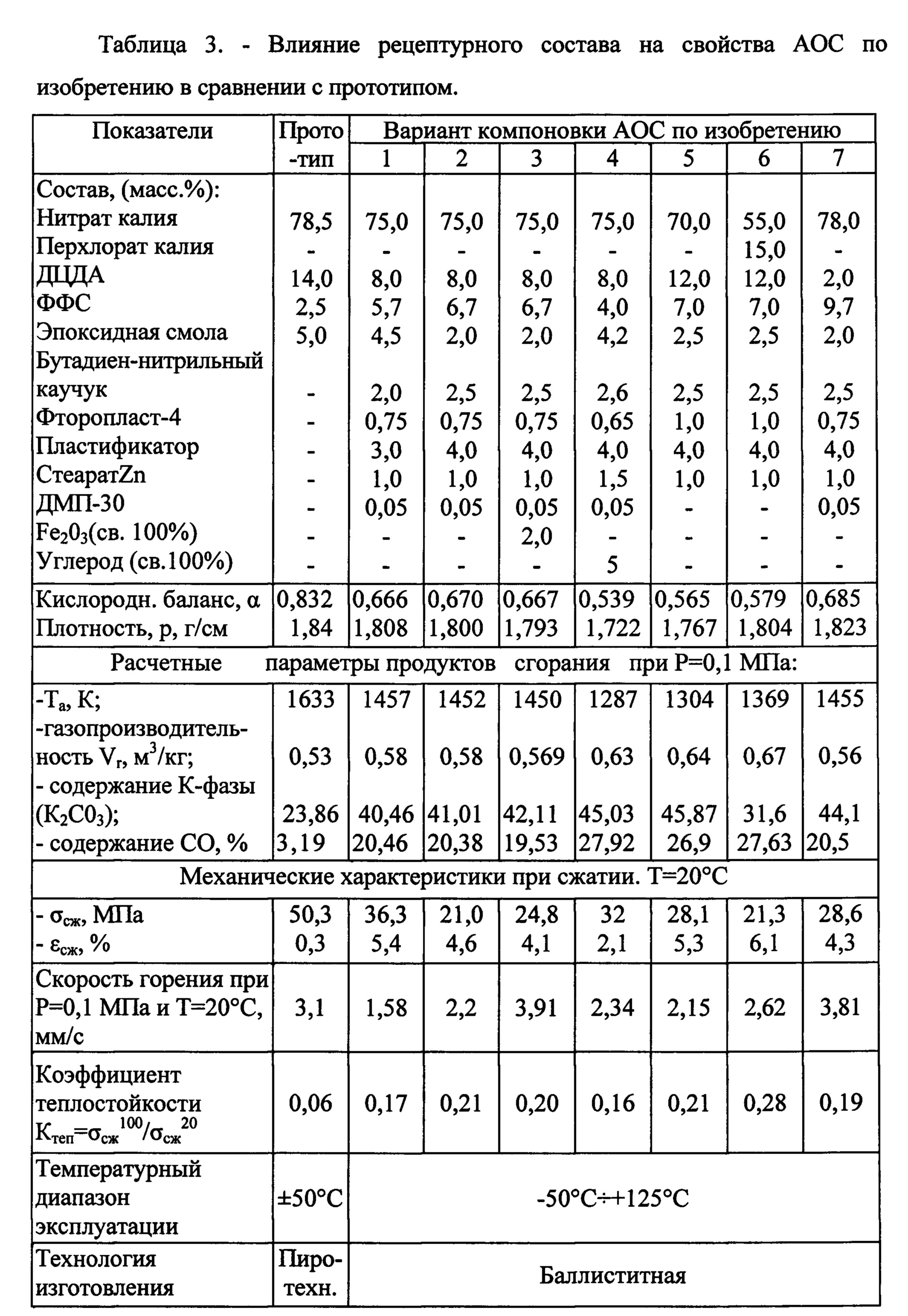 Изобретение относится к средствам тушения и предотвращения горения легковоспламеняющихся жидкостей, горючих веществ и материалов, а именно к области разработки аэрозолеобразующих огнетушащих составов (АОС). Аэрозолеобразующий огнетушащий состав с температурным диапазоном эксплуатации от -50°С до +125°С, изготавливаемый по баллиститной технологии, содержит 70-78% нитрата калия; 2-12% дициандиамида; 0,5-1,5% технологических добавок и 15-20% связующего, включающего идитол, эпоксидную смолу, термодинамически совместимый с ними пластификатор и высокомолекулярный полимер. Состав дополнительно может содержать до 5% (св. 100%) катализаторов и модификаторов горения. 4 з.п. ф-лы, 3 табл., 2 пр.