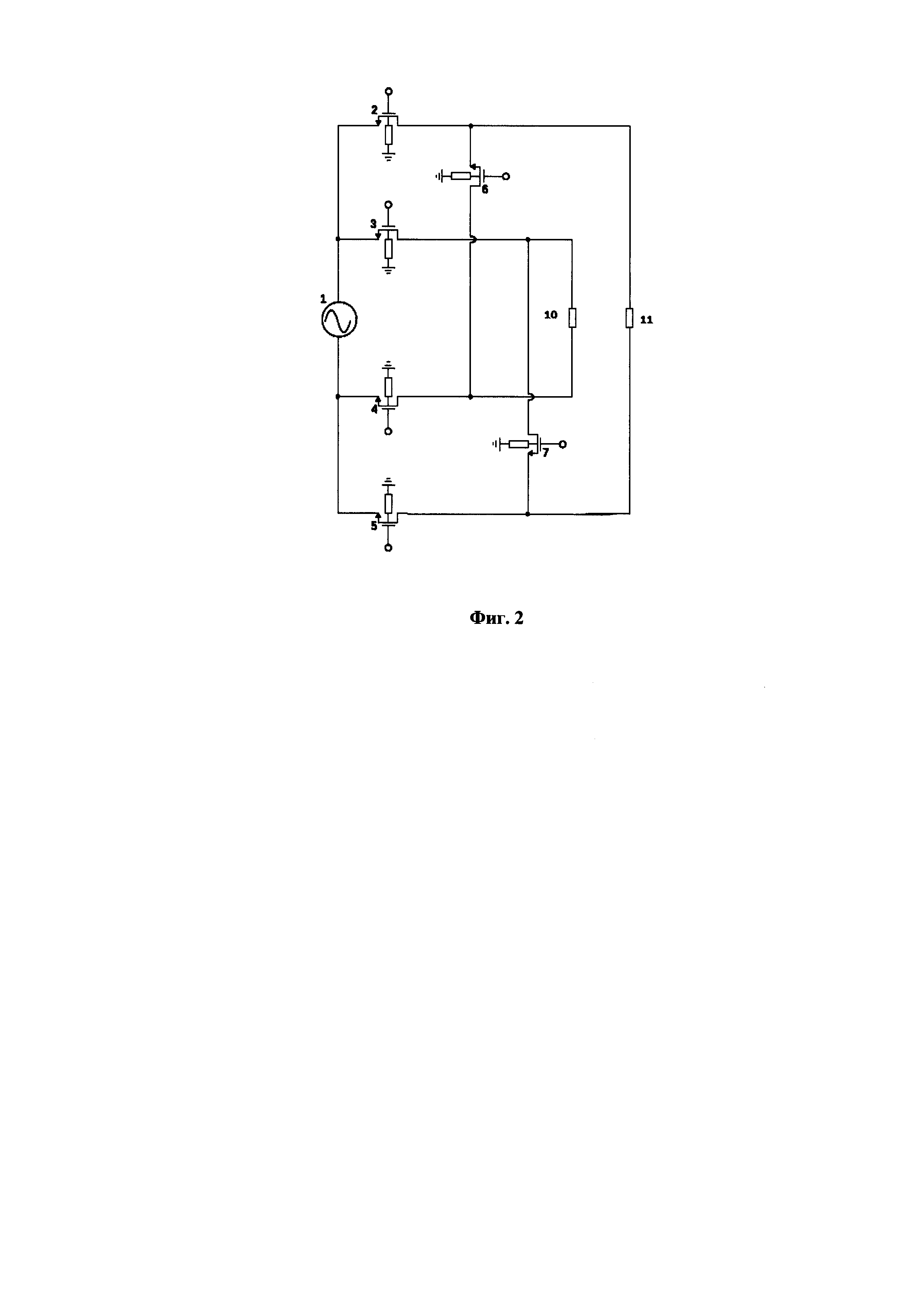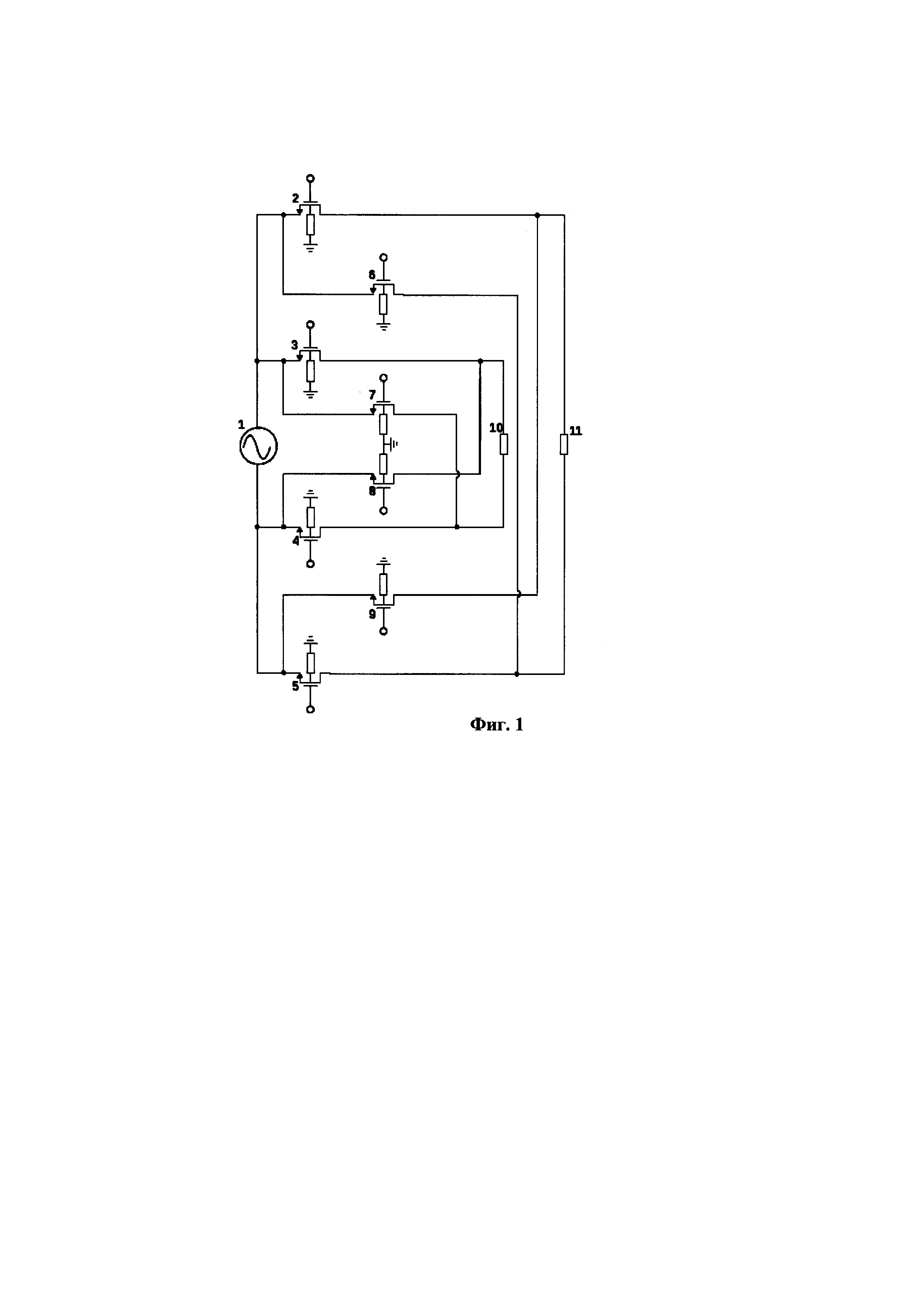 1. Переключатель с высокой изоляцией, включающий генератор дифференциального сигнала, МОП транзисторы, выходные порты, отличающийся тем, что две пары МОП транзисторов, коммутирующих сигнал (2-5), соединены напрямую с генератором, при этом пара МОП транзисторов 2, 5 соединена напрямую с выходным портом 11, а пара МОП транзисторов 3, 4 соединена напрямую с выходным портом 10; одна пара МОП транзисторов, компенсирующих сигнал 7, 6, соединена от неинвертирующего вывода генератора к инвертирующим выводам первого 10 и второго 11 выходных портов соответственно, а другая пара МОП транзисторов, компенсирующих сигнал 8, 9, от инвертирующего вывода генератора к неинвертирующим выводам первого 10 и второго 11 выходных портов соответственно, причем все МОП транзисторы выполнены с одинаковой шириной канала. 2. Переключатель с высокой изоляцией, включающий генератор дифференциального сигнала, МОП транзисторы, выходные порты, отличающийся тем, что две пары МОП транзисторов, коммутирующих сигнал (2-5), соединены напрямую с генератором, при этом пара МОП транзисторов 2, 5 соединена напрямую с выходным портом 11, а пара МОП транзисторов 3, 4 соединена напрямую с выходным портом 10, при этом они выполнены с одинаковой шириной канала, первый МОП транзистор компенсирующий сигнал 6, соединен перекрестно от неинвертирующего вывода выходного порта 11 к инвертирующему выводу выходного порта 10, второй МОП транзистор, компенсирующий сигнал 7, соединен от инвертирующего вывода выходного порта 11 к неинвертирующему выводу выходного порта 10, кроме того, МОП транзисторы, коммутирующие и компенсирующие сигналы, выполнены с различной между собой шириной канала.