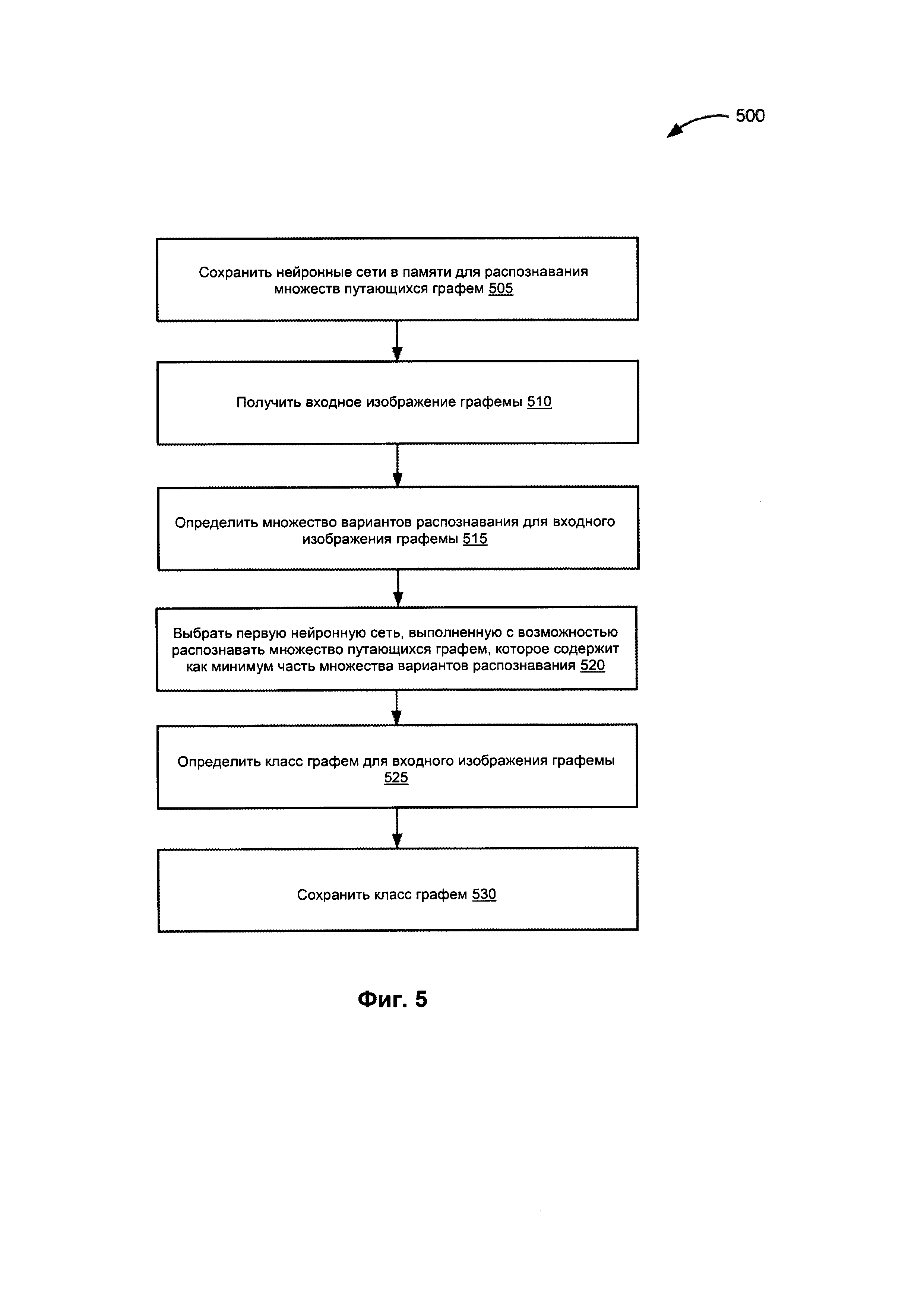 ОБЛАСТЬ ТЕХНИКИ [001] Настоящее изобретение в целом относится к вычислительным системам, а в частности - к системам и способам распознавания текста на изображении с помощью нейронных сетей. УРОВЕНЬ ТЕХНИКИ [002] Распознавание текста на изображении - это одна из важных операций в автоматической обработке изображений, содержащих тексты на естественном языке. Определение графем на изображении может выполняться с помощью глубоких нейронных сетей. Точное определение и классификация графем в изображениях документов, однако, могут быть затруднены нейронными сетями, которые включают большое количество слоев. Кроме того, каждый слой в таких нейронных сетях может быть вызван для анализа изображения, исходя из большого количества возможных целевых графем. Точное и своевременное извлечение информации может требовать значительных ресурсов. РАСКРЫТИЕ ИЗОБРЕТЕНИЯ [003] Варианты реализации настоящего изобретения описывают дифференциальную классификацию изображений графем с помощью нескольких нейронных сетей. Система классификации хранит в памяти несколько нейронных сетей, каждая из которых обучена распознавать множество из одного или более множеств путающихся графем, определенных в данных распознавания множества изображений документов, причем каждое множество из одного или более множеств путающихся графем включает множество различных графем, которые графически похожи одна на другую. Система классификации получает входное изображение графемы, связанное с изображением документа, содержащим множество графем, определяет множество вариантов распознавания входного изображения графемы, где множество вариантов распознавания включает множество целевых символов, сходных с входным изображением графемы, выбирает первую нейронную сеть из множества нейронных сетей, причем первая нейронная сеть обучена распознавать первое множество путающихся графем, причем первое множество графем содержит как минимум часть множества вариантов распознавания для входного изображения графемы и определяет класс графемы для входного изображения графемы с помощью выбранной первой нейронной сети. КРАТКОЕ ОПИСАНИЕ ЧЕРТЕЖЕЙ [004] Для более полного понимания настоящего изобретения ниже приводится подробное описание, в котором для примера, а не с целью ограничения, оно иллюстрируется со ссылкой на чертежи, на которых: [005] На Фиг. 1 приведена схема верхнего уровня для примера системы классификации в соответствии с одним или более вариантами реализации настоящего изобретения. [006] Фиг. 2 иллюстрирует пример вариантов распознавания входного изображения графемы, который может быть выполнен простым классификатором в соответствии с одним или более вариантами реализации настоящего изобретения. [007] Фиг. 3 иллюстрирует пример взвешенного графа, который может использоваться для определения множества путающихся графем в соответствии с одним или более вариантами реализации настоящего изобретения. [008] Фиг. 4 иллюстрирует пример множества путающих графем в соответствии с одним или более вариантами реализации настоящего изобретения. [009] На Фиг. 5 изображена блок-схема способа определения класса графемы с помощью нескольких сверточных нейронных сетей в соответствии с одним или более вариантами реализации настоящего изобретения. [0010] На Фиг. 6 изображена блок-с