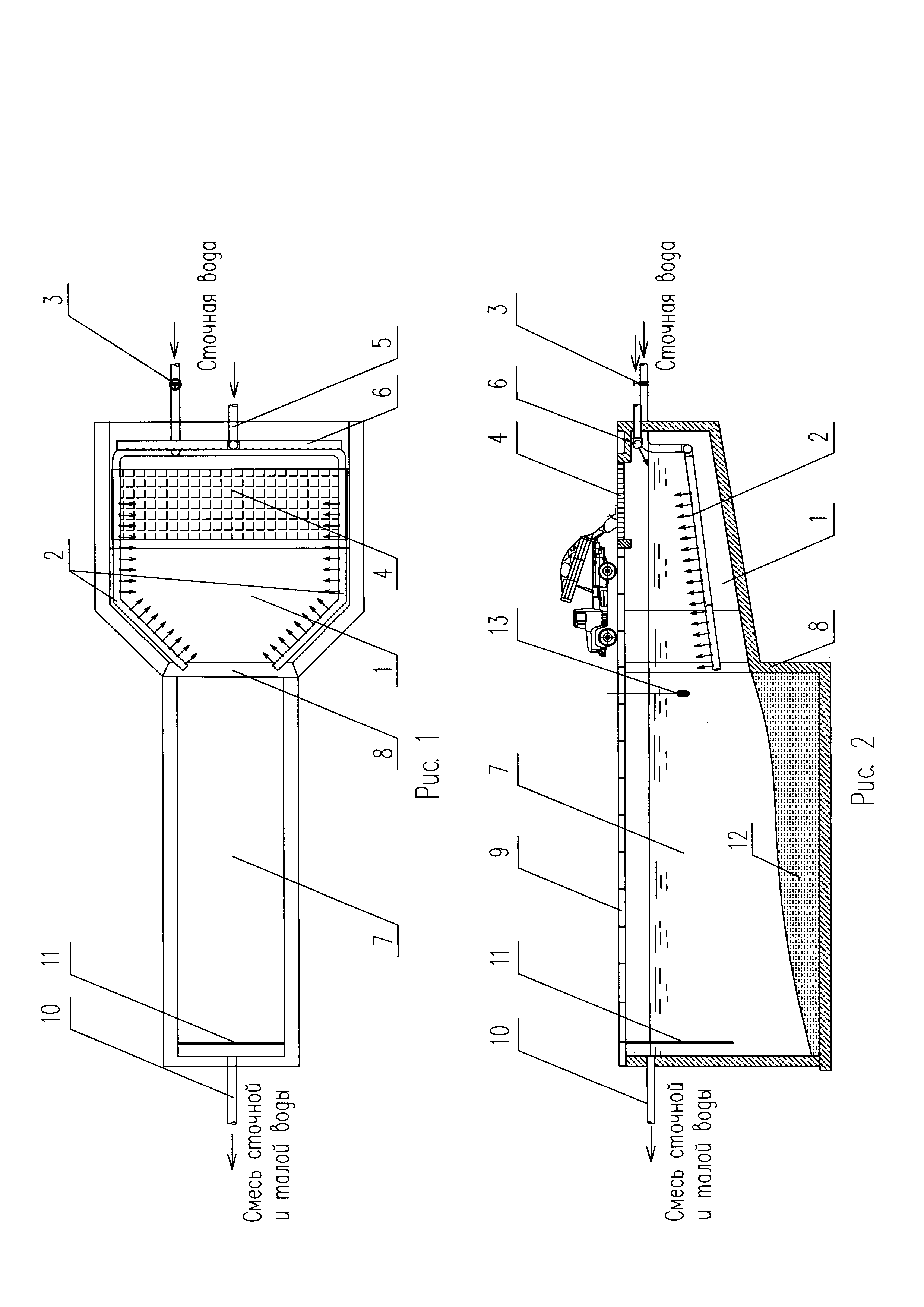 1. Снеготаялка, содержащая подземную снегоприемную камеру с загрузочным окном, перекрытым решеткой, трубопровод для отвода талой воды и интенсификатор таяния снега, выполненный в виде коллектора с оросительными трубами, присоединенного к магистрали сточных вод, снегоплавильный канал, сообщенный с камерой, с установленным над каналом съемным перекрытием и расположенным в канале средством для задержания твердых плавающих загрязнений, отличающаяся тем, что вдоль внутренней поверхности стен снегоприемной камеры располагается затопленный трубопровод с отверстиями для подачи теплой сточной воды, оснащенный задвижкой, установленной перед вводом трубопровода в снеготаялку, при этом дно снегоприемной камеры, возвышающееся над дном снегоплавильного канала, выполнено наклонным в его сторону и сопрягается с дном снегоплавильного канала ступенькой. 2. Снеготаялка по п. 1, отличающаяся тем, что затопленный трубопровод с отверстиями для подачи теплой сточной воды оснащен автоматической задвижкой, связанной с датчиком температуры воды, расположенным на входе в снегоплавильный канал.