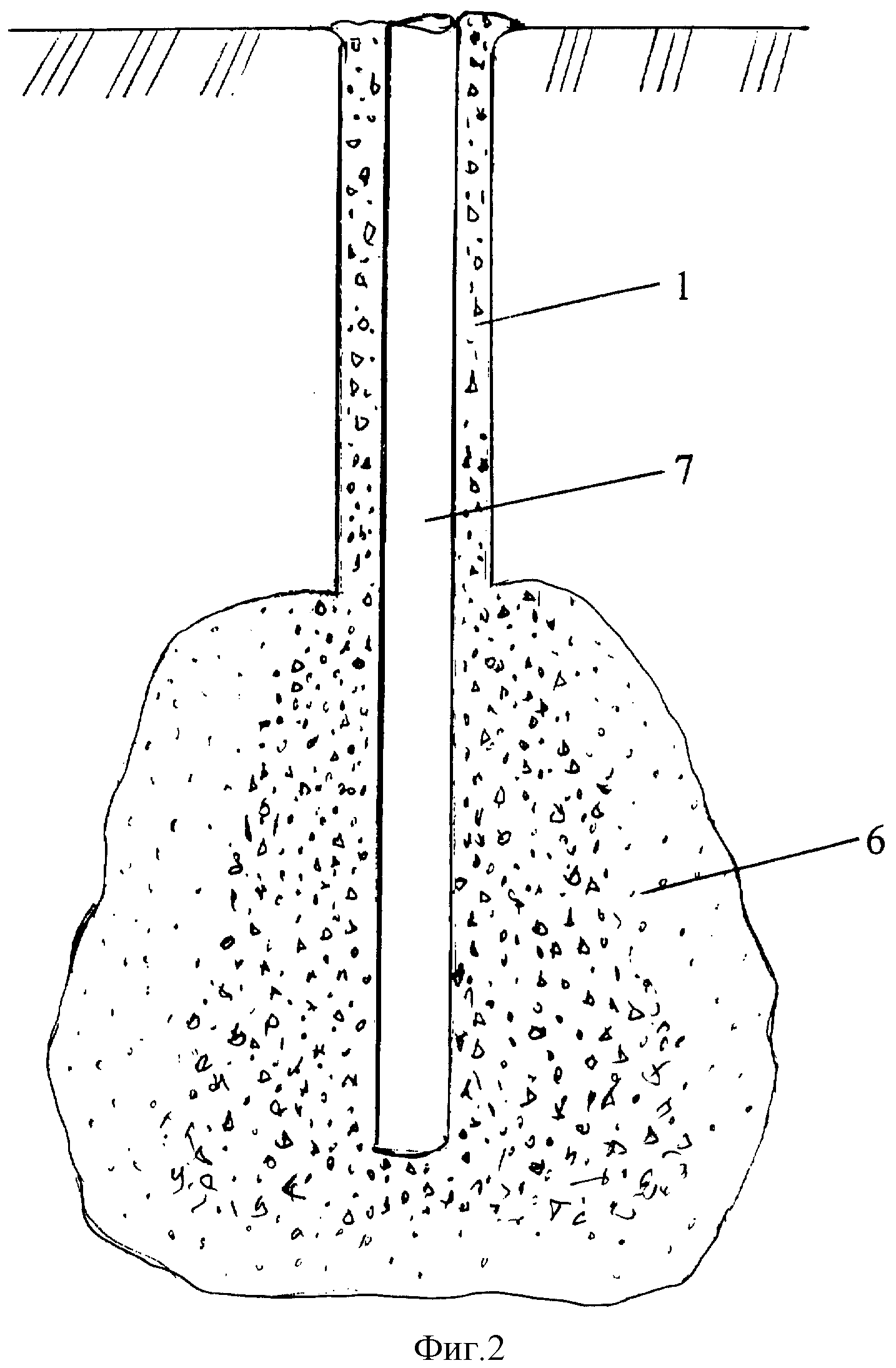 размыва грунта направленными вращающимися и перемещаемыми «вниз-вверх» струями водоцементной смеси в нижней части скважины создают полость - уширение (6), заполненное смесью размытого грунта и