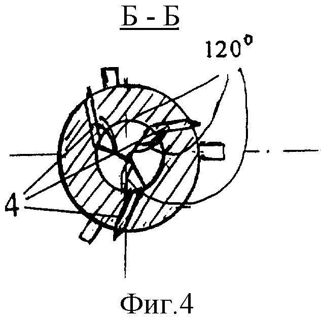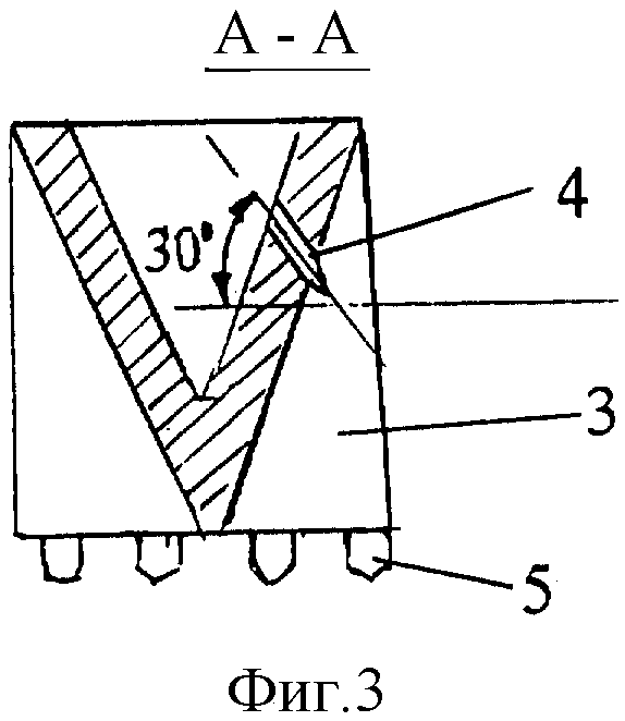 продольных осей которых на горизонтальную плоскость наклонены к радиусам вписанной окружности сдвижного барового долота под углом 110-120 градусов, а на вертикальную плоскость под углом 30 градусов.