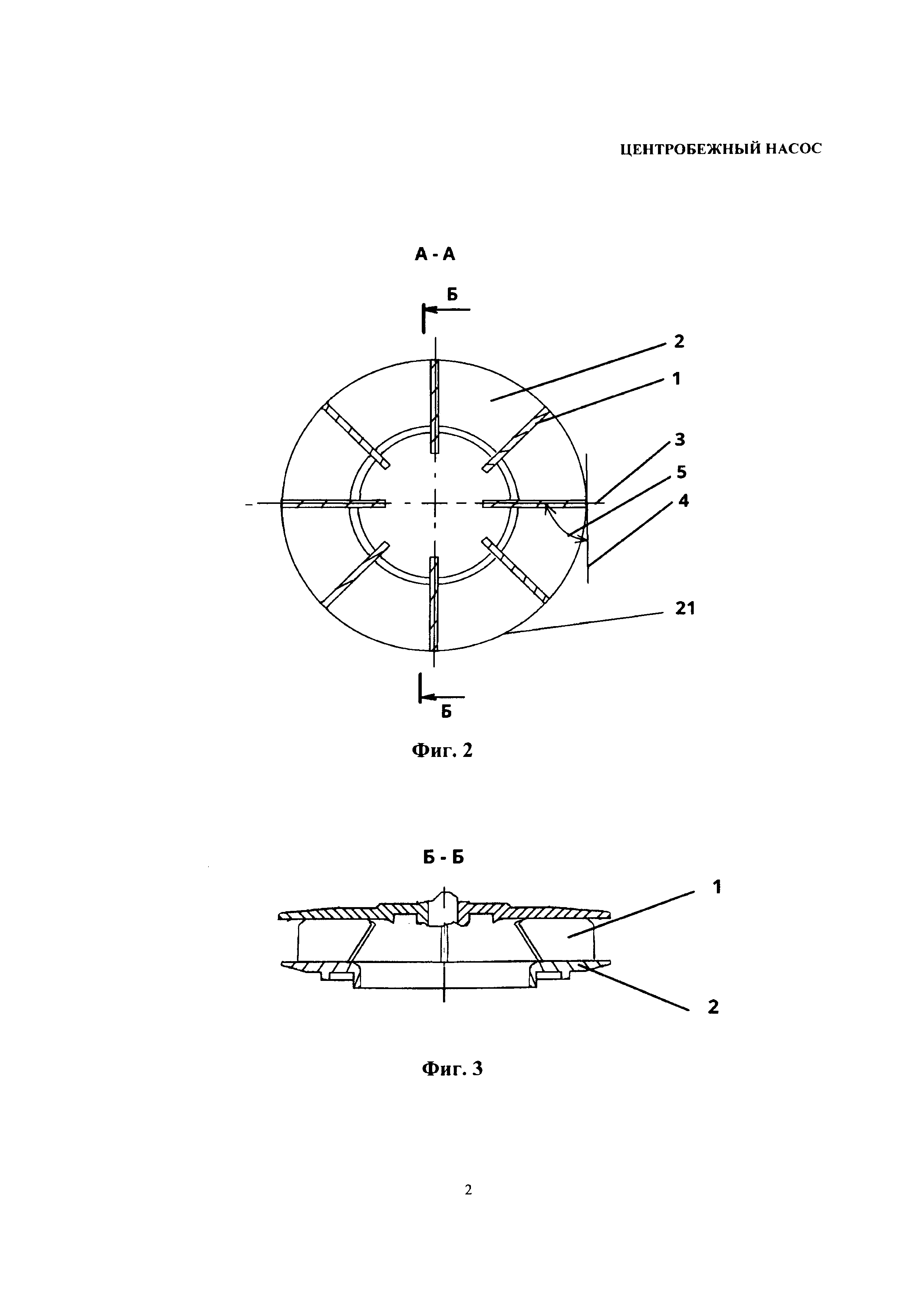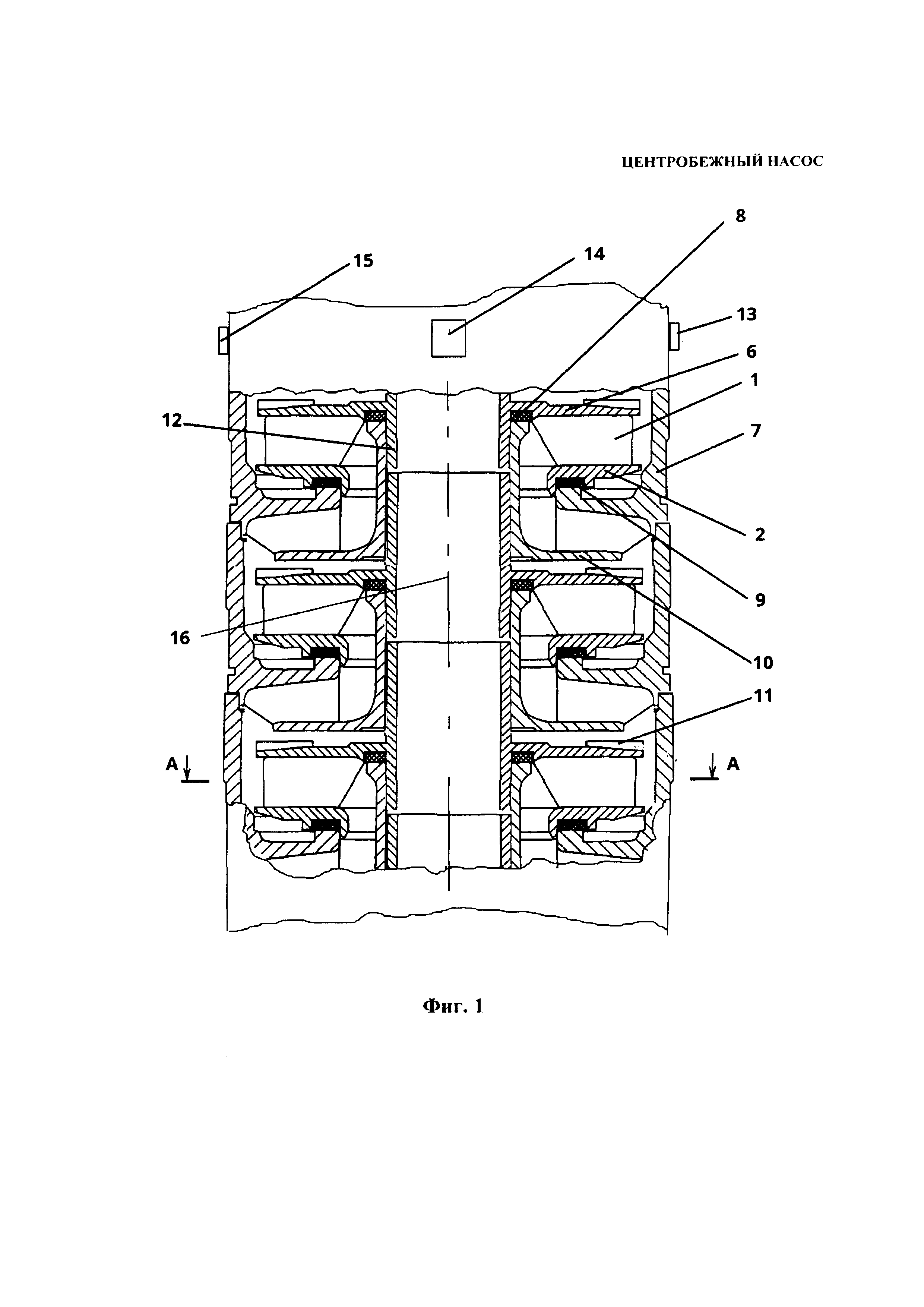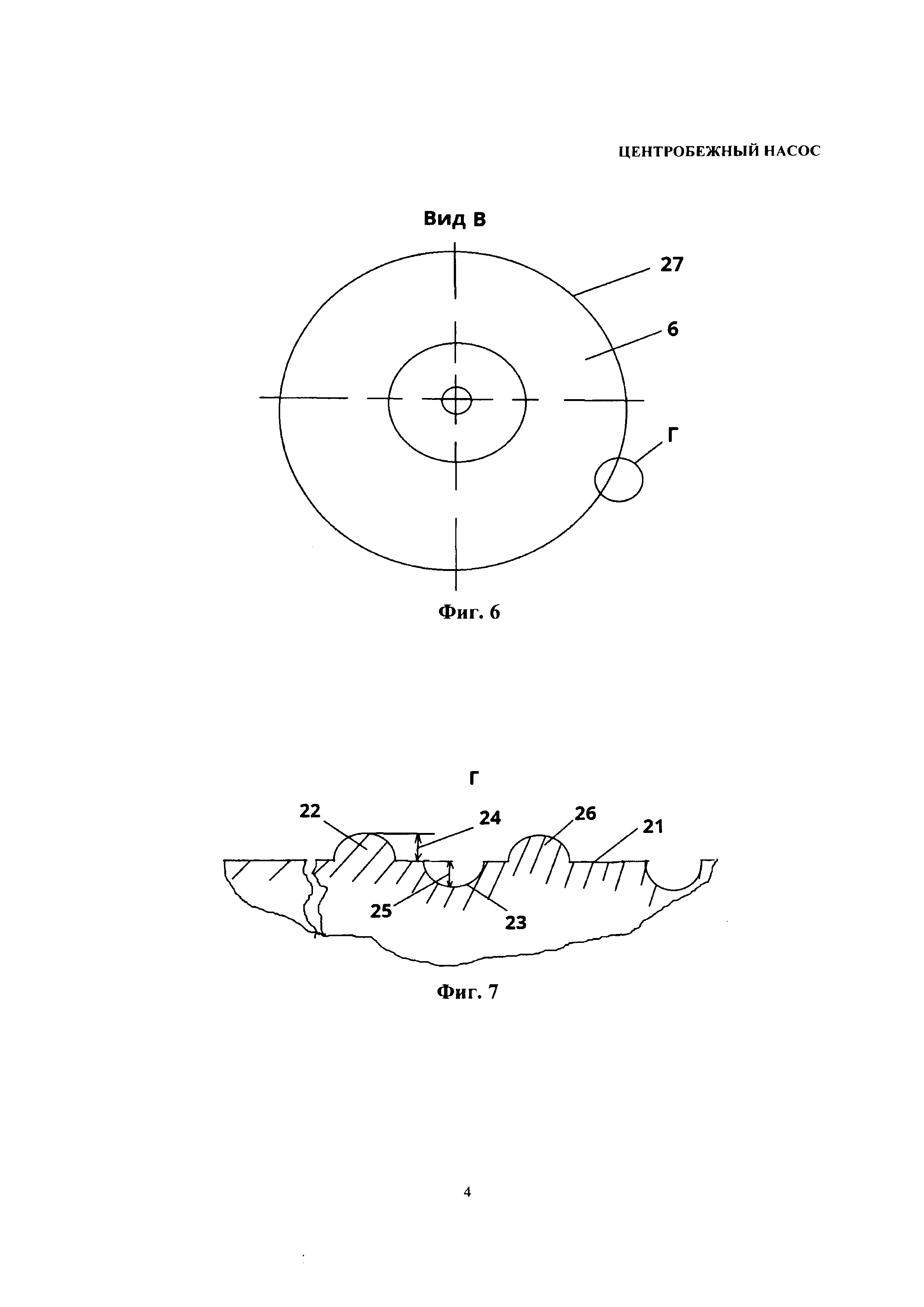 Изобретение относится к машиностроению и может быть использовано при производстве центробежных насосов, в частности погружных насосов для перекачки воды и жидкого топлива. Центробежный насос содержит корпус, направляющий аппарат, жестко соединенный с корпусом, рабочее колесо, закрепленное на валу. Рабочее колесо содержит диск с лопатками и прижимное устройство с центральным входным отверстием. Граница поперечного сечения, проходящего через вышеуказанный диск, включает участок, который содержит чередующиеся по длине участка выступы и углубления. Протяженность участка составляет 0,25 от периметра границы поперечного сечения диска. Количество выступов равно количеству углублений и составляет от 3 до 9. Высота и глубина соответственно каждого выступа и углубления составляет 0,2 мм. Диаметр диска составляет величину 50 мм, внутренний диаметр корпуса составляет 56 мм. Колесо содержит восемь лопаток. Насос выполнен с возможностью работы на частоте вращения 3000 об/мин. Изобретение направлено на снижение уровня вибрации при работе насоса путем ухода от резонанса за счет внесения изменения в колебательный гидродинамический режим работы насоса при воздействии движущейся жидкости на элементы рабочего колеса. 4 з.п. ф-лы, 11 ил., 6 табл.