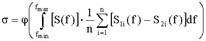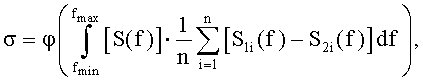 где σ - прочностная характеристика полимерного композиционного материала; φ - знак корреляционной связи; S(f) - спектр импульса ультразвуковых колебаний, прошедшего в полимерном композиционном материале контролируемого изделия; S1i(f) - спектры импульсов ультразвуковых колебаний, прошедших в полимерном композиционном материале образцов-свидетелей после их изготовления; S2i(f) - спектры импульсов ультразвуковых колебаний, прошедших в полимерном композиционном материале образцов-свидетелей, подвергшихся повреждающим воздействиям; n - число образцов-свидетелей; i - порядковый номер измерений; fmin и fmax - граничные частоты спектрального диапазона.