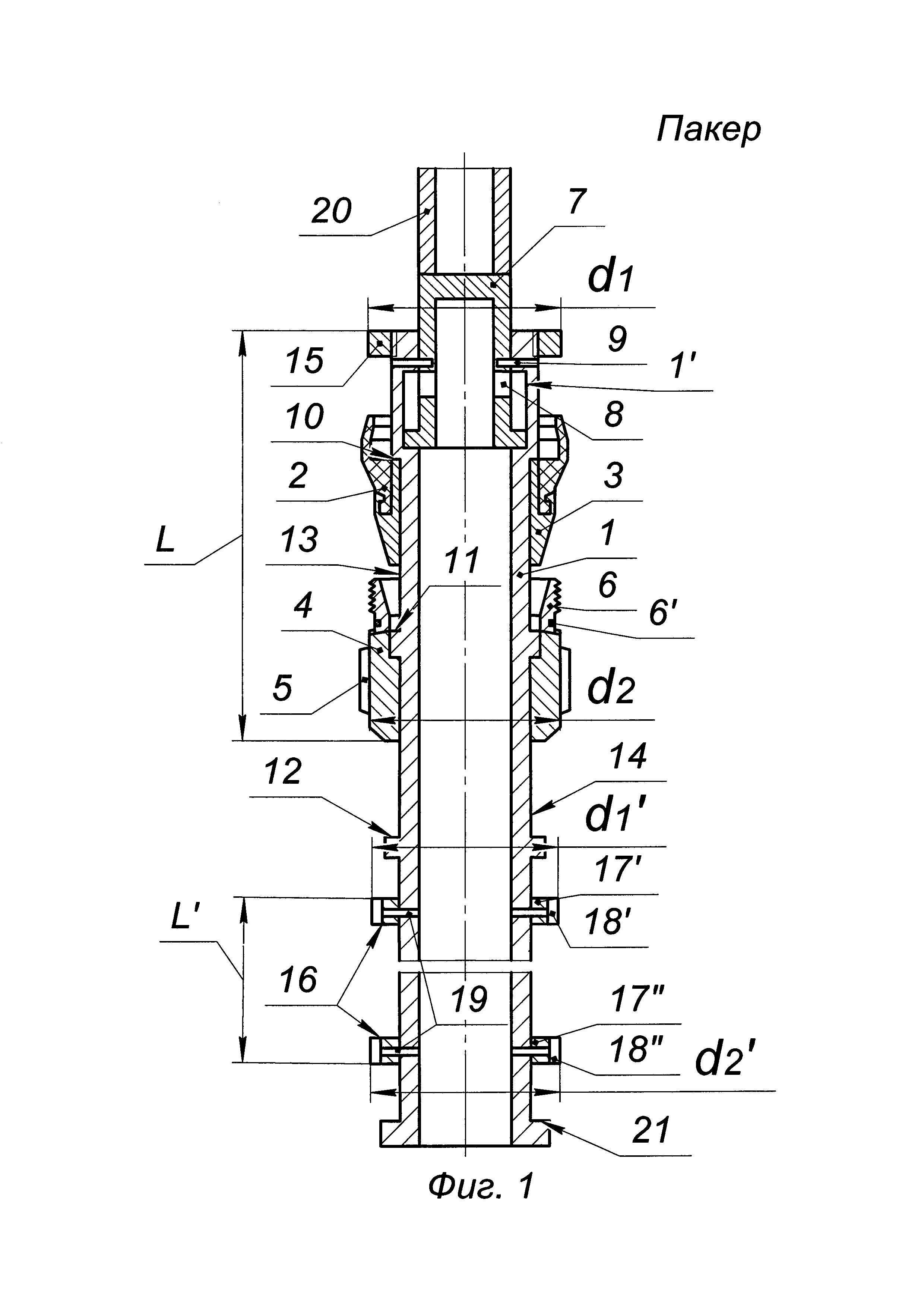 Пакер, включающий ствол, установленные на стволе самоуплотняющуюся сверху вниз манжету и конус, а также расположенную на стволе ниже конуса с возможностью осевого перемещения обойму, в обойме по ее окружности расположены пружинные центраторы и шлипсы, подпружиненные соответственно наружу и внутрь в радиальном направлении разрезным пружинным кольцом, наконечник, отличающийся тем, что сверху ствол оснащен внутренней цилиндрической протокой, в которую установлен наконечник, оснащенный радиальными каналами, при этом в транспортном положении наконечник закреплен относительно ствола срезным элементом, а радиальные каналы наконечника герметично перекрыты стволом, причем в рабочем положении наконечник имеет возможность ограниченного осевого перемещения относительно ствола и разгерметизации радиальных каналов наконечника, причем ствол оснащен наружными верхним, средним и нижним кольцевым выступами, образующими на стволе наружные верхнюю и нижнюю проточки, причем в наружной верхней проточке с возможностью ограниченного осевого перемещения установлен конус с самоуплотняющейся манжетой, а в наружной нижней проточке с возможностью ограниченного осевого перемещения установлена обойма, при этом сверху ствол выше самоуплотняющейся манжеты оснащен жестким центратором, а снизу ствол оснащен шаблоном, выполненным в виде двух колец с радиальными разрезами на наружной поверхности, причем кольца имитируют габаритные диаметры обоймы и центратора ствола, а также расстояние между ними, при этом кольца зафиксированы на стволе срезными штифтами.
