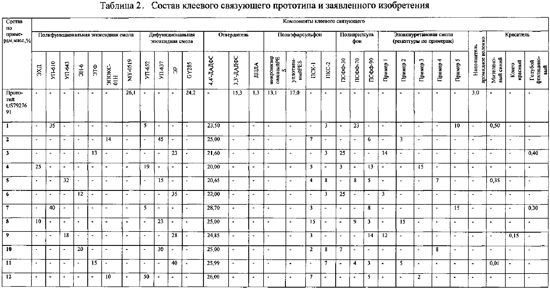 1. Эпоксидное клеевое связующее, включающее смесь полифункциональной и дифункциональной эпоксидных смол, аминный отвердитель и модификатор - полиэфирсульфон, отличающееся тем, что в качестве дифункциональной смолы содержит диглицидиловый эфир резорцина, в качестве отвердителя 4,4′-диаминодифенилсульфон, а также дополнительно содержит модификаторы полиэфирсульфон, полиарилсульфон и эпоксиуретановую смолу, при следующем соотношении компонентов, мас.%: 2. Эпоксидное связующее по п. 1, отличающееся тем, что в качестве полифункциональной смолы используют эпоксидную смолу, выбранную из одной из следующих групп: модифицированные эпоксиимидные смолы, смолы на основе фенолов или глицидилпроизводные ароматических аминов. 3. Эпоксидное клеевое связующее по п. 1, отличающееся тем, что дополнительно содержит краситель в количестве 0,01-0,50 мас.% от всего связующего. 4. Эпоксидное клеевое связующее по п. 3, отличающееся тем, что используют один из следующих красителей: Метиленовый синий, Конго красный или органический пигмент голубой фталоцианиновый.эпоксидная полифункциональная смола 10,0-40,0 диглицидиловый эфир резорцина 5,0-50,0 4,4′-диаминодифенилсульфон 20,0-28,7 полиэфирсульфон 3,0-15,0 полиарилсульфон 5,0-25,0 эпоксиуретановая смола 2,0-15,0