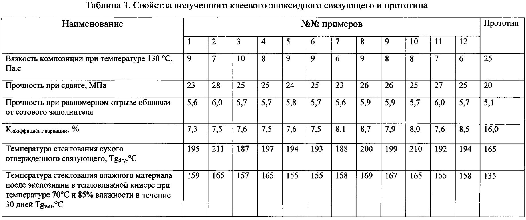Изобретение относится к области создания эпоксидных клеевых связующих для соединения полимерных композиционных материалов (ПКМ) методом склеивания, применяемых в изготовлении деталей и сборочных единиц авиационной техники, в том числе, когда склеивание и формование изделий из ПКМ происходит за один технологический цикл. Предлагаемое эпоксидное клеевое связующее можно использовать при изготовлении монолитных и трехслойных панелей агрегатов одинарной и сложной кривизны, а также создания клеевых соединений металлических материалов, предназначенных для применения в авиационной, космической, машино-, авто-, судостроительной промышленности и других отраслях техники. Из уровня техники известна эпоксидная клеевая композиция, включающая перхлорвиниловую смолу, эпоксидную диановую смолу ЭД-20, фосфорборазотсодержащий олигомер и органический растворитель - смесь бутилацетата и ацетона (патент РФ 2522003 С1, МПК C09J 127/24, МПК C09J 127/04, МПК C09J 163/02, МПК C09J 163/10; опубл. 10.07.2014). К числу основных недостатков этой клеевой композиции следует отнести наличие большого количества органического растворителя в составе (до 85%), что негативно сказывается на процессе отверждения, поскольку вследствие удаления летучих продуктов приводит к формированию негерметичной и пористой структуры при склеивании материалов между собой, характеризующейся невысокими показателями прочности. Известна клеевая эпоксидная композиция, содержащая эпоксидную диановую смолу, отвердитель дициандиамид, термопластичный модификатор и алюмосиликатную глину (патент РФ 2495898 С1, МПК C09J 163/02; опубл. 20.10.2013). Указанная клеевая композиция характеризуется пониженной влагостойкостью и невысокой температурой стеклования клеевого соединения (не более 150°С). Такие характеристики не обеспечивают надежную эксплуатацию склеенных ПКМ конструкционного назначения во влажных условиях при температурах выше 100°С. Наиболее близким из аналогов, принятый за прототип, является эпоксидное клеевое связующее, включающее смесь полифункциональной эпоксидной смолы на основе N,N-диглицидилового производного 4-глицидилоксианилина - 26,1% и дифункциональной эпоксидной смолы на основе бисфенола F - 24,2%, аминные отвердители 3,3′-диаминодифенилсульфон - 15,3% и дицианодиамид - 1,3%, модификаторы микронизированный полиэфирсульфон - 13,1% и уплотненный полиэфирсульфон - 17,0%, наполнитель микрорубленное арамидное волокно - 3,0% (патент US 7927691 А1, МПК B05D 3/10, В32В 3/12, В32В 5/02; опубл. 08.10.2009). Недостатком материала-прототипа являются повышенная вязкость клеевой композиции при температуре переработки, невысокие термомеханические и прочностные характеристики отвержденной композиции и низкая степень сохранения термомеханических характеристик после воздействия эксплуатационных факторов. Технической задачей и техническим результатом заявленного изобретения является создание технологичного клеевого эпоксидного связующего с оптимальными реологическими характеристиками, обеспечивающего образование клеевого соединения со стабильно высоким уровнем прочностных (прочность при сдвиге и при равномерном отрыве обшивки от сотового заполнителя) и термомеханических характеристик, устойчивого к тепловлажностному старению, способного в достаточной мере сохранять термомеханические свойства после указанных воздействий. Д