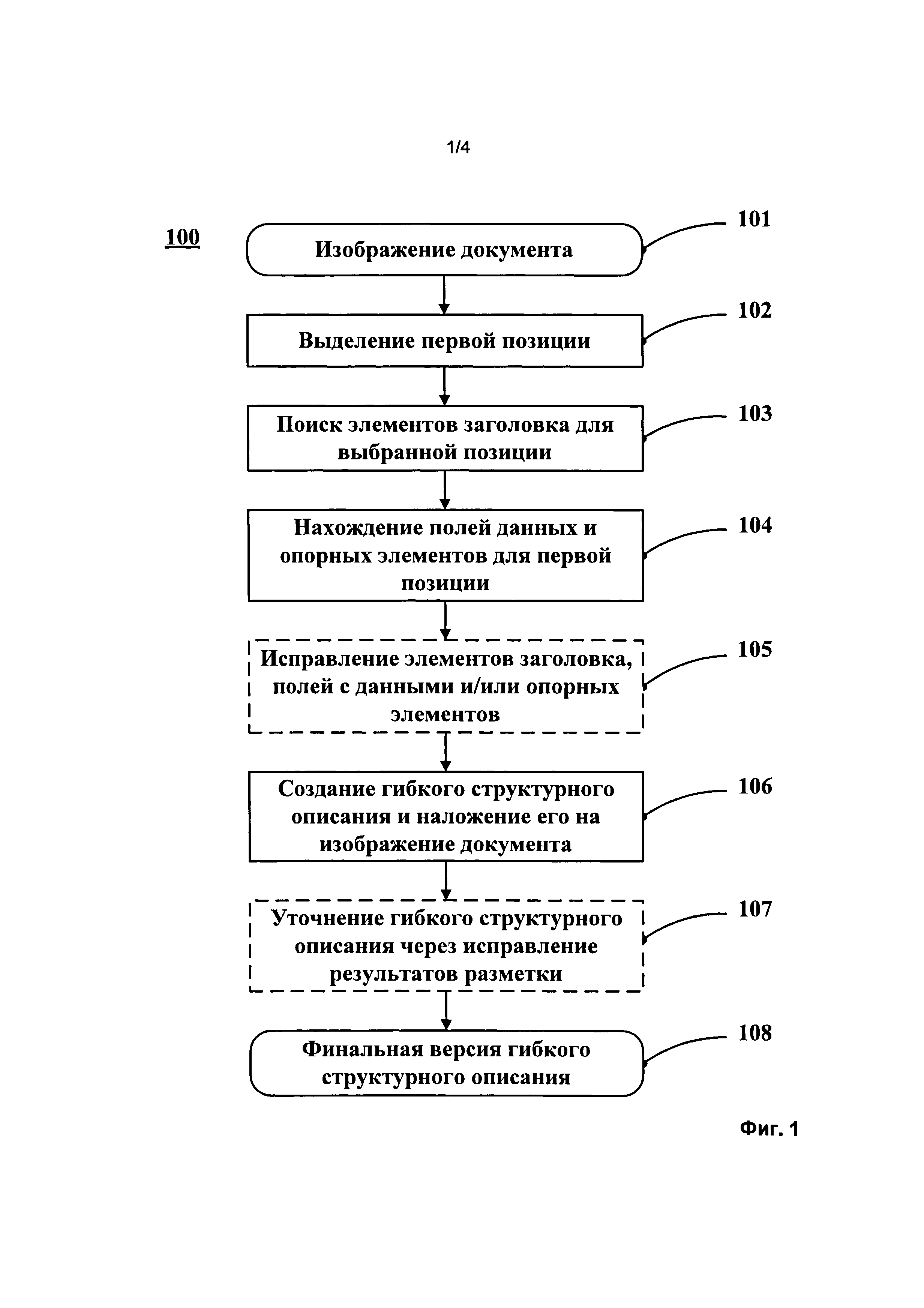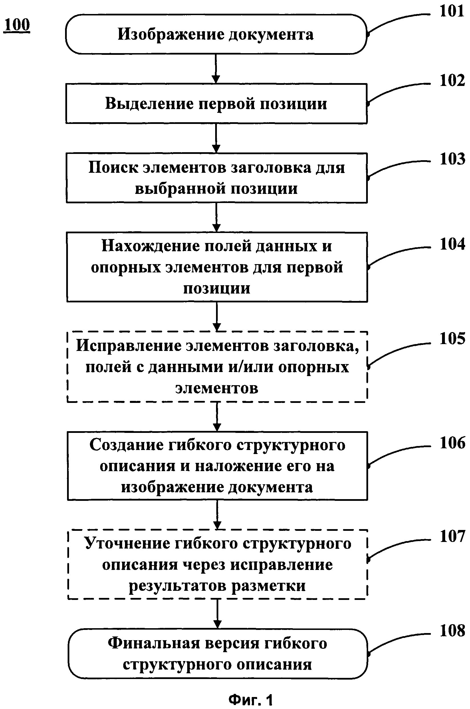1. Способ создания гибкого структурного описания, содержащий: 2. Способ по п. 1, дополнительно включающий корректировку, используя процессор, гибкого структурного описания на основе пользовательских исправлений обнаруженных полей данных, элементов заголовка и/или опорных элементов. 3. Способ по п. 1, в котором таблица занимает несколько страниц документа, и в котором элементы заголовка повторяются на двух или более страницах многостраничного документа. 4. Способ по п. 1, в котором создание гибкого структурного описания включает определение опорных элементов для поиска полей данных. 5. Способ по п. 1, в котором создание гибкого структурного описания включает генерирование значений поисковых параметров для каждого отдельного элемента или поля. 6. Способ по п. 1, в котором позиция соответствует ячейке таблицы, охватывающей несколько строчек документа. 7. Способ по п. 1, дополнительно содержащий получение по крайней мере двух позиций таблицы, включающих множество ячеек, которые перекрываются. 8. Система создания гибкого структурного описания, содержащая: 9. Система по п. 8, где один или более электронных процессоров дополнительно выполнены с возможностью корректировать гибкое структурное описание на основе пользовательских исправлений обнаруженных полей данных, элементов заголовка и/или опорных элементов. 10. Система по п. 8, в которой таблица занимает несколько страниц документа и в которой элементы заголовка повторяются на двух или более страницах многостраничного документа. 11. Система по п. 8, в которой для создания гибкого структурного описания определенного типа документов один или более электронных процессоров выполнены с возможностью определения опорных элементов для поиска полей данных. 12. Система по п. 8, в которой для создания гибкого структурного описания определенного типа документов один или более электронных процессоров выполнены с возможностью генерировать значения поисковых параметров для каждого элемента или поля. 13. Система по п. 8, в которой позиция соответствует ячейке таблицы, охватывающей несколько строчек документа. 14. Система по п. 8, в которой один или несколько электронных процессоров дополнительно имеют возможность получения по крайней мере двух позиций таблицы, включающих множество ячеек, которые перекрываются. 15. Энергонезависимый машиночитаемый носитель информации, на котором хранятся инструкции по созданию гибкого структурного описания, содержащие: 16. Энергонезависимый машиночитаемый носитель информации по п. 15, дополнительно содержащий инструкции по корректировке гибкого структурного описания на основе пользовательских исправлений обнаруженных полей данных, элементов заголовка и/или опорных элементов. 17. Энергонезависимый машиночитаемый носитель информации по п. 15, в котором таблица занимает несколько страниц документа и в котором элементы заголовка повторяются на двух или более страницах многостраничного документа. 18. Энергонезависимый машиночитаемый носитель информации по п. 15, содержащий инструкции по созданию гибких структурных описаний для определенного типа документов, включая инструкции по определению опорных элементов для поиска полей данных.