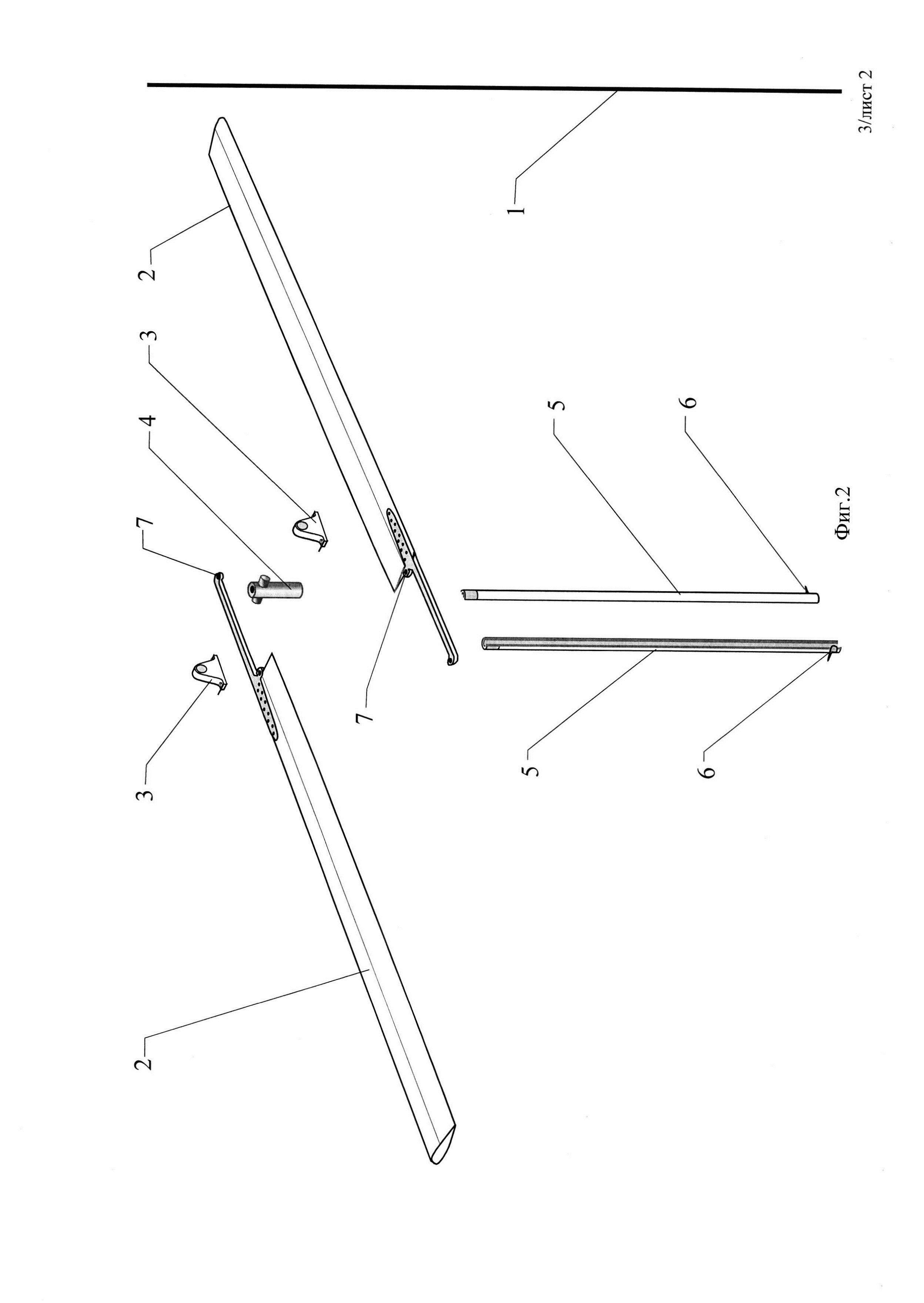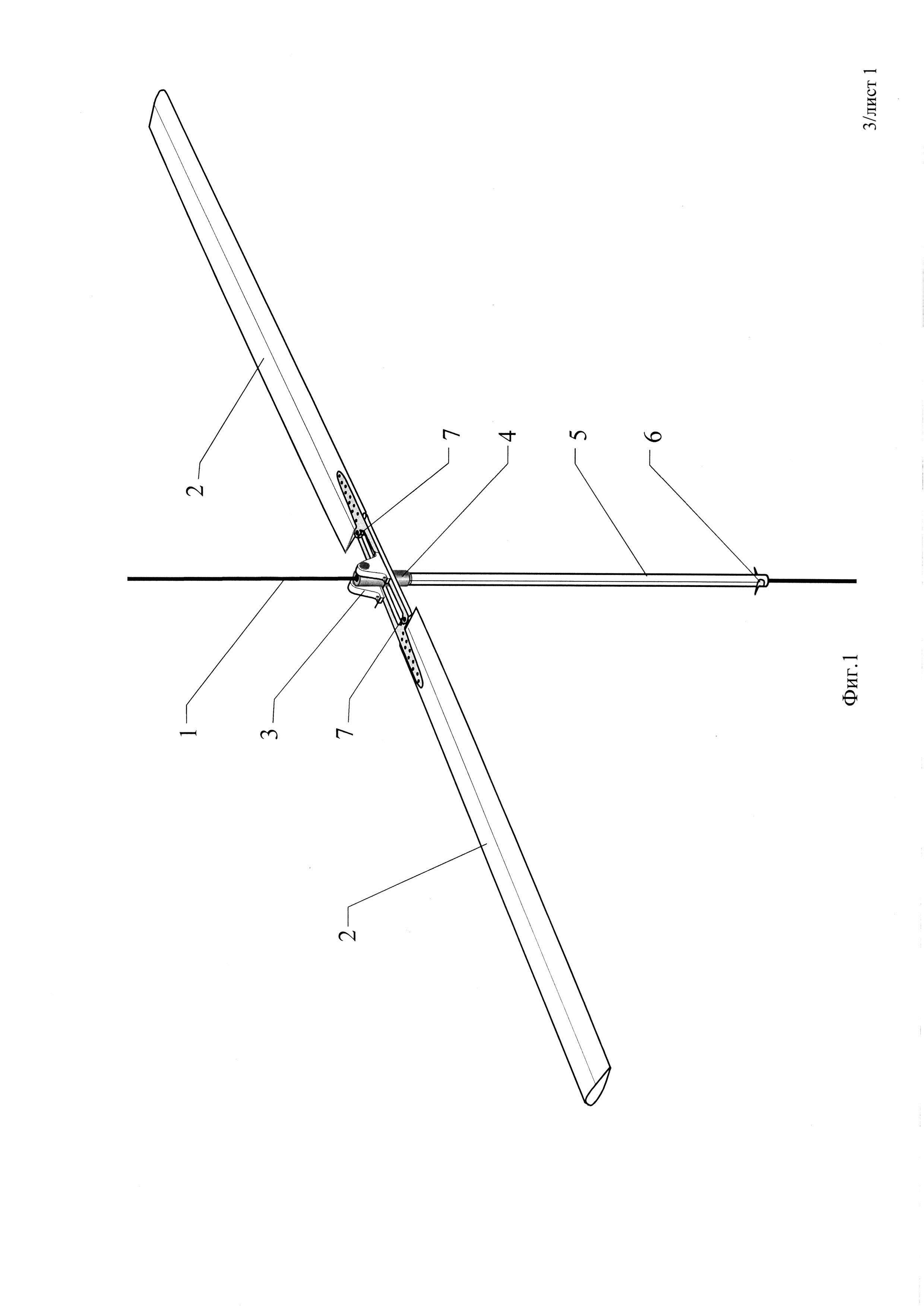 Изобретение относится к авиации, в частности к воздухоплаванию, а именно к устройству тросовых систем привязных аэростатов. Автожирный винт с креплением на тросе привязного аэростата включают две лопасти, втулку винта и средства крепления оси вращения к элементам, воспринимающим подъемную силу. Двухлопастные автожирные винты, как правило, имеют жестко соединенные между собой лопасти и простую качающуюся втулку с общим горизонтальным шарниром, вынесенным вверх на уровень центров тяжести лопастей, т.к. при работе винта под нагрузкой образуется небольшой конус с отклонением лопасти от горизонтали примерно на 4-6 градусов. Втулка винта содержит подшипниковый узел, неподвижная ось которого соединяется с элементами конструкции летательного аппарата, воспринимающими подъемную силу. Известны автожирные винты, в которых рукав комля лопасти переходит в конструктивные элементы горизонтальных и вертикальных шарниров, обеспечивающих маховое движение лопастей и управление наклоном вектора тяги ротора автожирного винта при помощи автомата перекоса (Н.И. Камов. Винтовые летательные аппараты, 1948 г., с. 39, фиг. 26, с. 40, фиг. 27) такая конструкция не применима для автожирного винта, закрепляемого на тросе, т.к. у последнего не предусматривается отдельная система управления наклоном площади ометаемого диска винта. Кроме того, оси горизонтальных шарниров в схеме известной конструкции ротора автожирного винта лежат в плоскости ометаемого диска винта и не способны обеспечить автоматическое управление углом его атаки. Известны автожирные винты, у которых пара лопастей имеет общий горизонтальный шарнир для обеспечения их махового движения в процессе вращения, а для изменения направления вектора подъемной силы тяги используются непосредственный наклон оси вращения винта. (О.Н. Сохань. Конструирование втулок несущих винтов вертолетов. Учебное пособие, 1981 г., стр. 5, рис. 3; И.П. Братухин. Автожиры. Теория и расчет, 1934 г., §2, фиг. 47). Такие втулки автожирных винтов применяются практически на всех современных серийных автожирах и автожирах любительской постройки. Однако они не подходят для установки на тросе привязного аэростата, т.к. точка центра наклона оси втулки винта располагается слишком близко к плоскости его вращения и набегающий воздушный поток из-за отсутствия разности в жесткости троса над и под винтом будет случайным образом отклонять плоскость винта либо вверх, либо вниз, создавая неопределенность в возможности сохранения устойчивости режима авторотации и необходимого пространственного положении вектора подъемной силы тяги. По технической сущности в качестве наиболее близкого прототипа принята схема втулки винта с общим горизонтальным шарниром лопастей и точкой центра наклона оси вращения, располагаемой под втулкой винта вблизи плоскости его вращения (О.Н. Сохань. Конструирование втулок несущих винтов вертолетов. Учебное пособие, 1981 г., стр. 5, рис. 3). Основными недостатками прототипа являются: - излишняя сложность и затрудненная собираемость конструкции; - близость точки центра наклона оси втулки к плоскости вращения винта; - отсутствие разницы в жесткости несущего троса над и под винтом; - наличие неопределенности в сохранении устойчивости режима авторотации при изменениях в интенсивности набегающего воздушного потока; - 