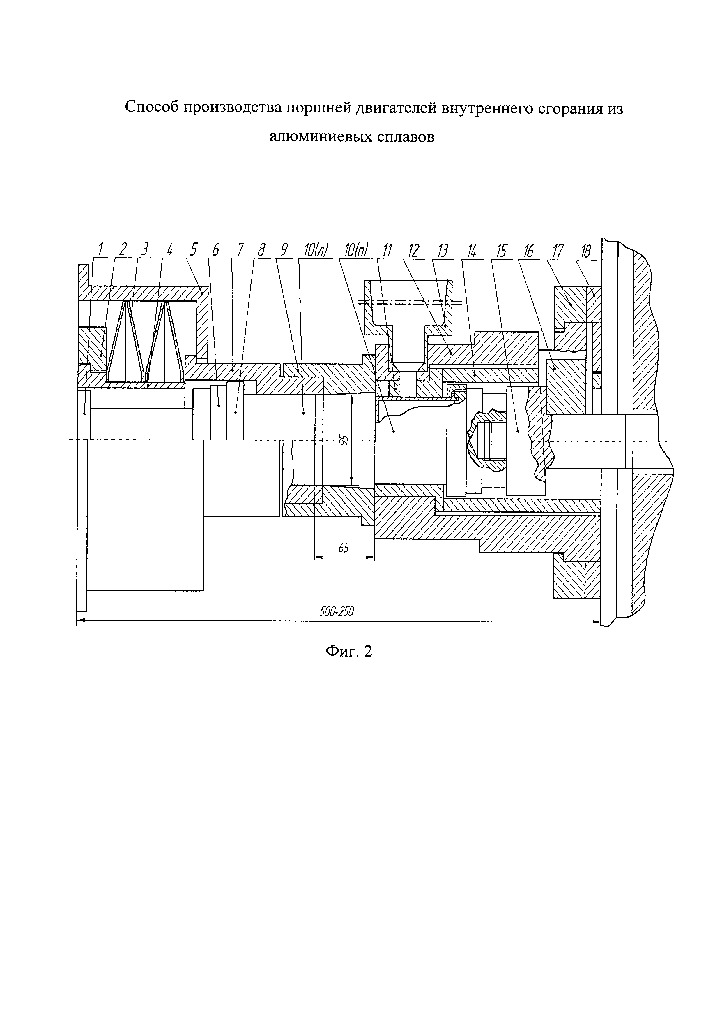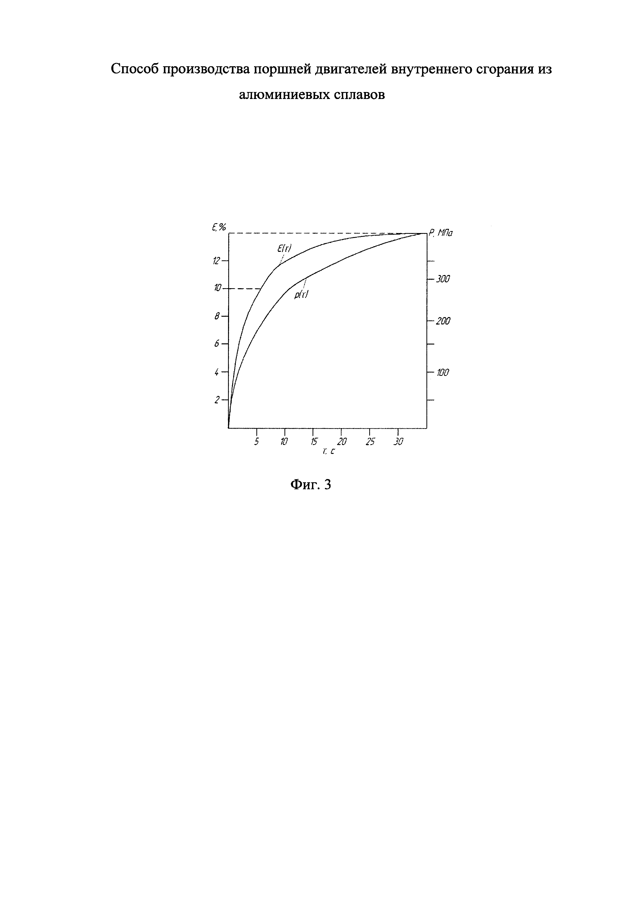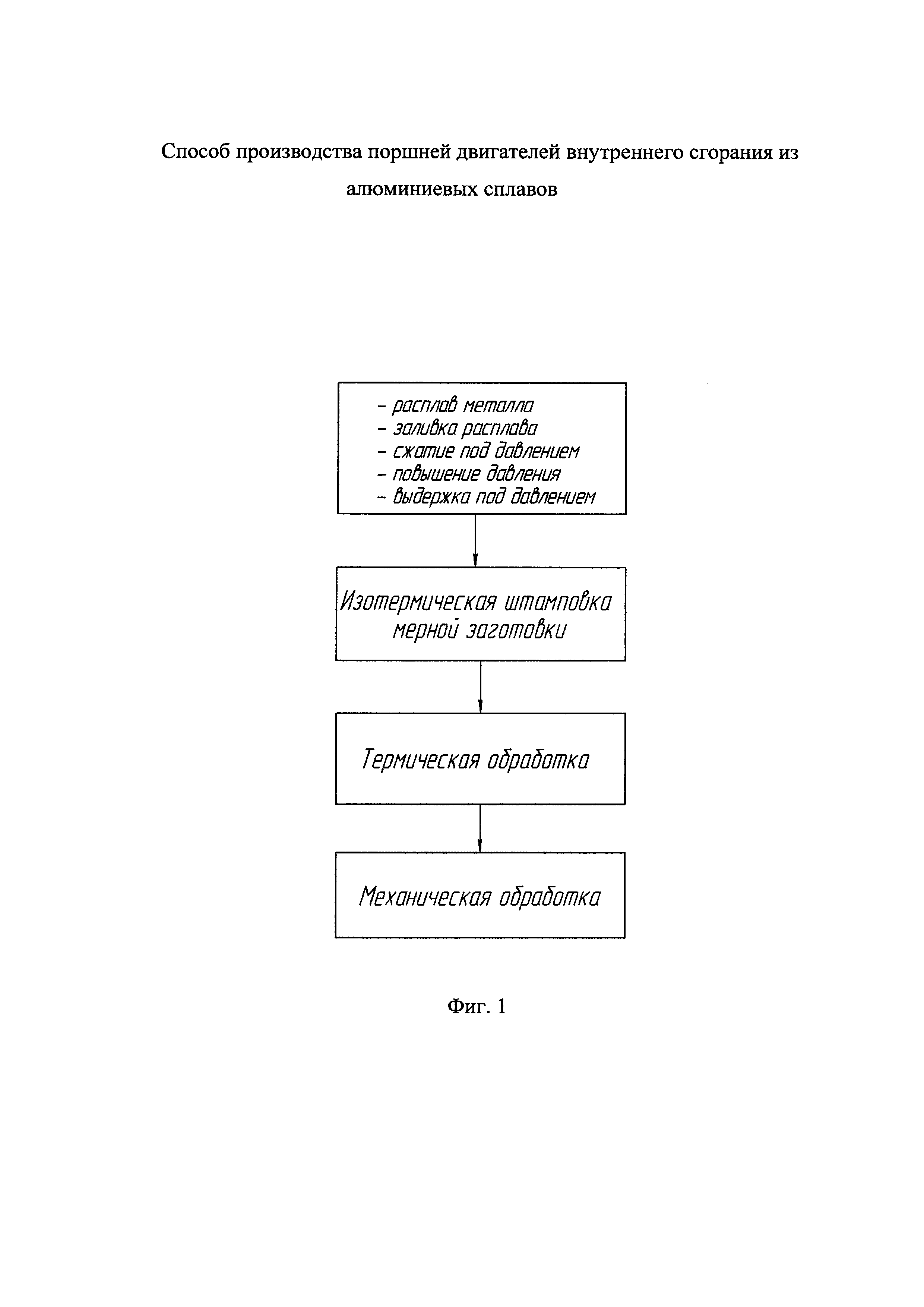 Способ производства поршней двигателей внутреннего сгорания из алюминиевых сплавов, включающий получение мерной заготовки, ее изотермическую штамповку в штампе, содержащем пуансон, соответствующий задней полости поршня, термическую и механическую обработку, отличающийся тем, что мерную заготовку получают путем заливки расплава заэвтектического силумина АК-18 с температурой, которая на 150-200 К выше температуры начала его кристаллизации, в форму, нагретую до температуры на 150-200 К ниже температуры начала кристаллизации сплава, сжимают его под давлением 200-250 МПа между движущимися навстречу друг другу охлаждаемыми изнутри проточной водой плунжерами с обеспечением опрессовки на 8-10% в течение 3-5 с, затем в течение последующих 30-40 с давление поднимают до 350-400 МПа, при этом доводят общую опрессовку заготовки до 12-13% в условиях однонаправленного вдоль ее оси теплоотвода до полного завершения процесса кристаллизации.