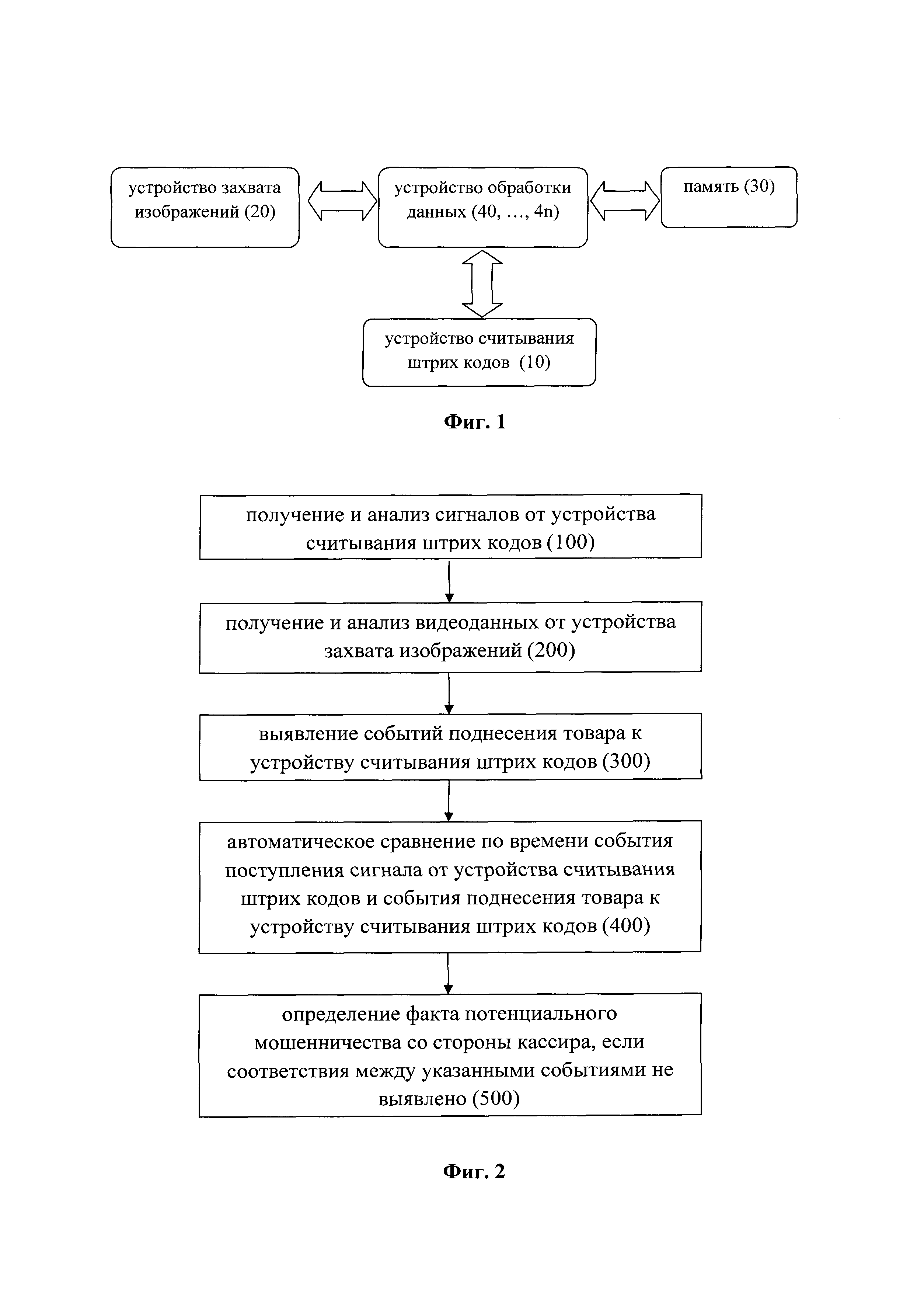 Изобретение относится к области автоматического выявления факта потенциального мошенничества со стороны кассира. Технический результат заключается в повышении точности выявления факта потенциального мошенничества со стороны кассира. Такой результат достигается тем, что компьютерная система для выявления факта потенциального мошенничества со стороны кассира содержит устройство считывания штрихкодов, устройство захвата изображений, сконфигурированное для получения видеоданных из области считывания штрихкодов кассиром, память, сконфигурированную для хранения данных, устройство обработки данных, сконфигурированное для получения и анализа видеоданных от устройства захвата изображений и для получения и анализа сигналов от устройства считывания штрихкодов. Во время анализа видеоданных устройство обработки данных выявляет событие поднесения товара к устройству считывания штрихкодов и автоматически сравнивает по времени события поступления сигнала от устройства считывания штрихкодов и выявленные события поднесения товара к устройству считывания штрихкодов. Если соответствия между указанными событиями не выявлено, то устройство обработки данных определяет факт потенциального мошенничества со стороны кассира. 3 н. и 8 з.п. ф-лы, 2 ил.