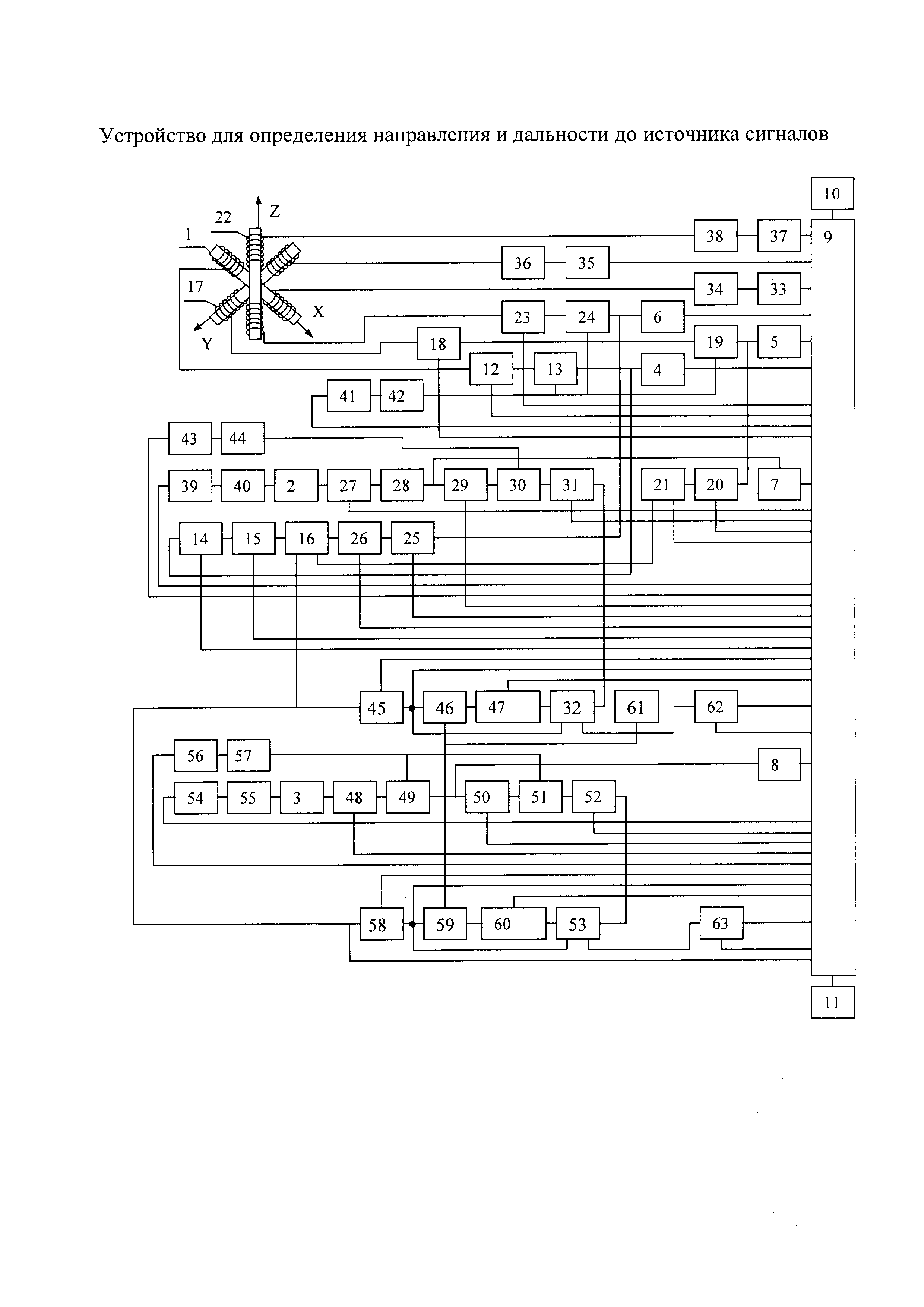 Изобретение относится к измерительной технике, в частности к пеленгаторам. Заявлено устройство для определения направления и дальности до источника сигналов, содержащее первую антенну, первый и второй микробарометры, а также пять аналого-цифровых преобразователей (АЦП), подключенных к персональной электронно-вычислительной машине (ПЭВМ). Устройство дополнительно содержит блок системы единого времени и блок связи с абонентами, подключенные к ПЭВМ, последовательно соединенные первый усилитель, первый фильтр, второй усилитель, первый пороговый блок и схему ИЛИ, последовательно соединенные вторую антенну, третий усилитель, второй фильтр, четвертый усилитель и второй пороговый блок, последовательно соединенные третью антенну, пятый усилитель, третий фильтр, шестой усилитель и третий пороговый блок, последовательно соединенные седьмой усилитель, четвертый фильтр, восьмой усилитель, пятый фильтр, четвертый пороговый блок и первую схему И, последовательно соединенные первый цифроаналоговый преобразователь (ЦАП) и первый калибратор, последовательно соединенные второй ЦАП и второй калибратор, последовательно соединенные третий ЦАП и третий калибратор, последовательно соединенные четвертый ЦАП и четвертый калибратор, последовательно соединенные пятый ЦАП и первый формирователь, последовательно соединенные шестой ЦАП и второй формирователь, последовательно соединенные первый таймер, вторую схему И и первый счетчик, последовательно соединенные девятый усилитель, шестой фильтр, десятый усилитель, седьмой фильтр, пятый пороговый блок и третью схему И, последовательно соединенные седьмой ЦАП и пятый калибратор, последовательно соединенные восьмой ЦАП и третий формирователь, последовательно соединенные второй таймер, четвертую схему И и второй счетчик, а также тактовый генератор, подключенный ко вторым входам второй и четвертой схем И, третий и четвертый таймеры. Причем первая, вторая и третья антенны выполнены магнитными и размещены взаимно перпендикулярно друг к другу, первый, второй и третий формирователи выполнены в виде сглаживающего звена с усилителем мощности, первый, второй, третий, четвертый и пятый пороговые блоки выполнены с управлением по порогу, первый, второй, третий, четвертый, пятый, шестой и седьмой фильтры выполнены с управлением по полосе пропускания, первый, второй, третий, четвертый, пятый, шестой, седьмой, восьмой, девятый и десятый усилители выполнены с управлением по фазе и чувствительности, первый, второй, третий и четвертый таймеры выполнены с управлением по длительности выходного сигнала. Первая схема И подключена вторым входом к первому таймеру, третьим входом подключена к третьему таймеру, а выходом подключена ко входу останова первого счетчика, а третья схема И подключена вторым входом ко второму таймеру, третьим входом подключена к четвертому таймеру, а выходом подключена ко входу останова второго счетчика. Схема ИЛИ подключена вторым и третьим входами соответственно ко второму и третьему пороговым блокам, а выходом подключена к ПЭВМ и к первому и второму таймерам, первая антенна подключена к первому усилителю, первый микробарометр подключен выходом к седьмому усилителю, а входом акустически связан с четвертым калибратором, второй микробарометр подключен выходом к девятому усил