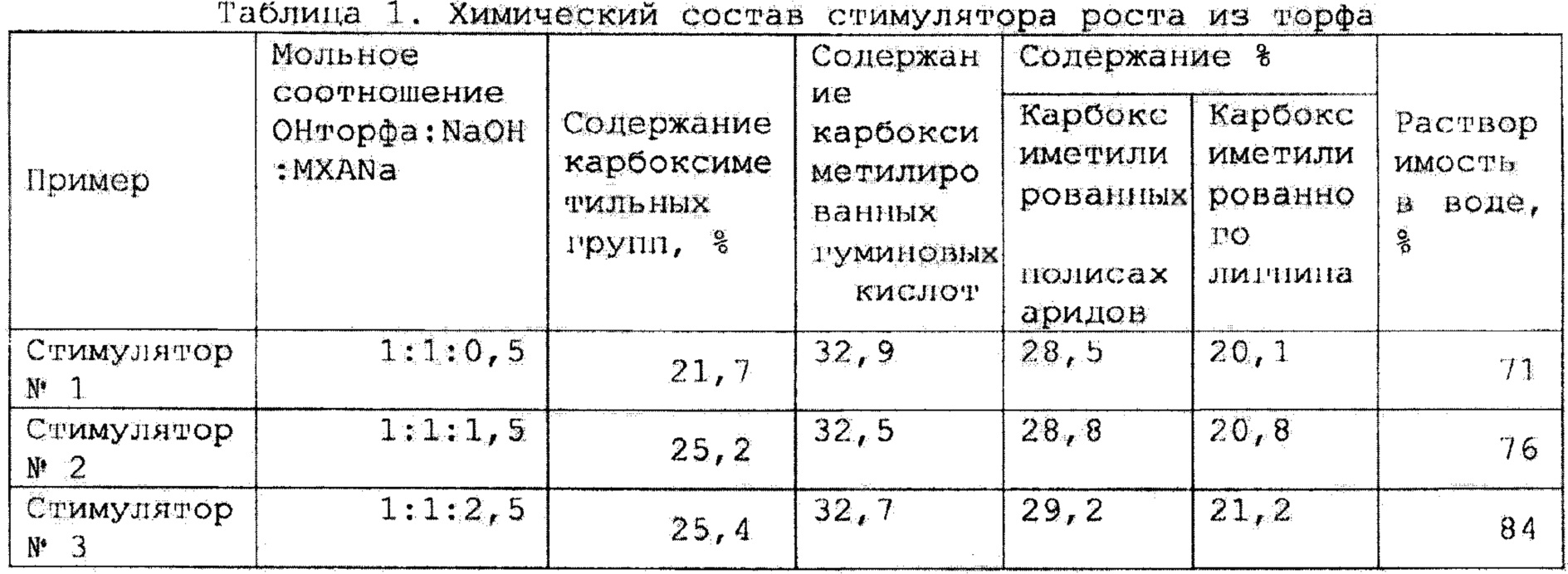 Стимулятор роста из торфа, содержащий карбоксиметильные группы, отличающийся тем, что дополнительно содержит до 32,9 % карбоксиметилированных гуминовых кислот при общем содержании карбоксиметильных групп 17,9 - 25,4 % и растворимости в воде 42 - 84 %.