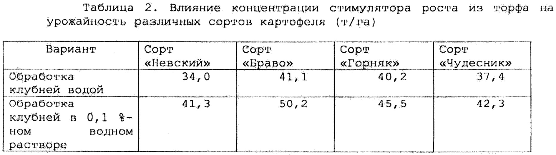 Изобретение относится к сельскому хозяйству. Стимулятор роста из торфа содержит карбоксиметильные группы, причем дополнительно содержит до 32,9 % карбоксиметилированных гуминовых кислот при общем содержании карбоксиметильных групп 17,9 - 25,4 % и растворимости в воде 42 - 84 %. Изобретение позволяет расширить сырьевую базу для получения стимуляторов роста на основе растительного сырья, повысить качество продукта за счет увеличения количества гуминовых ростостимулирующих веществ и общего содержания карбоксиметильных групп в его составе, существенно повысить урожайность при использовании заявленного стимулятора роста. 2 табл., 1 пр.
