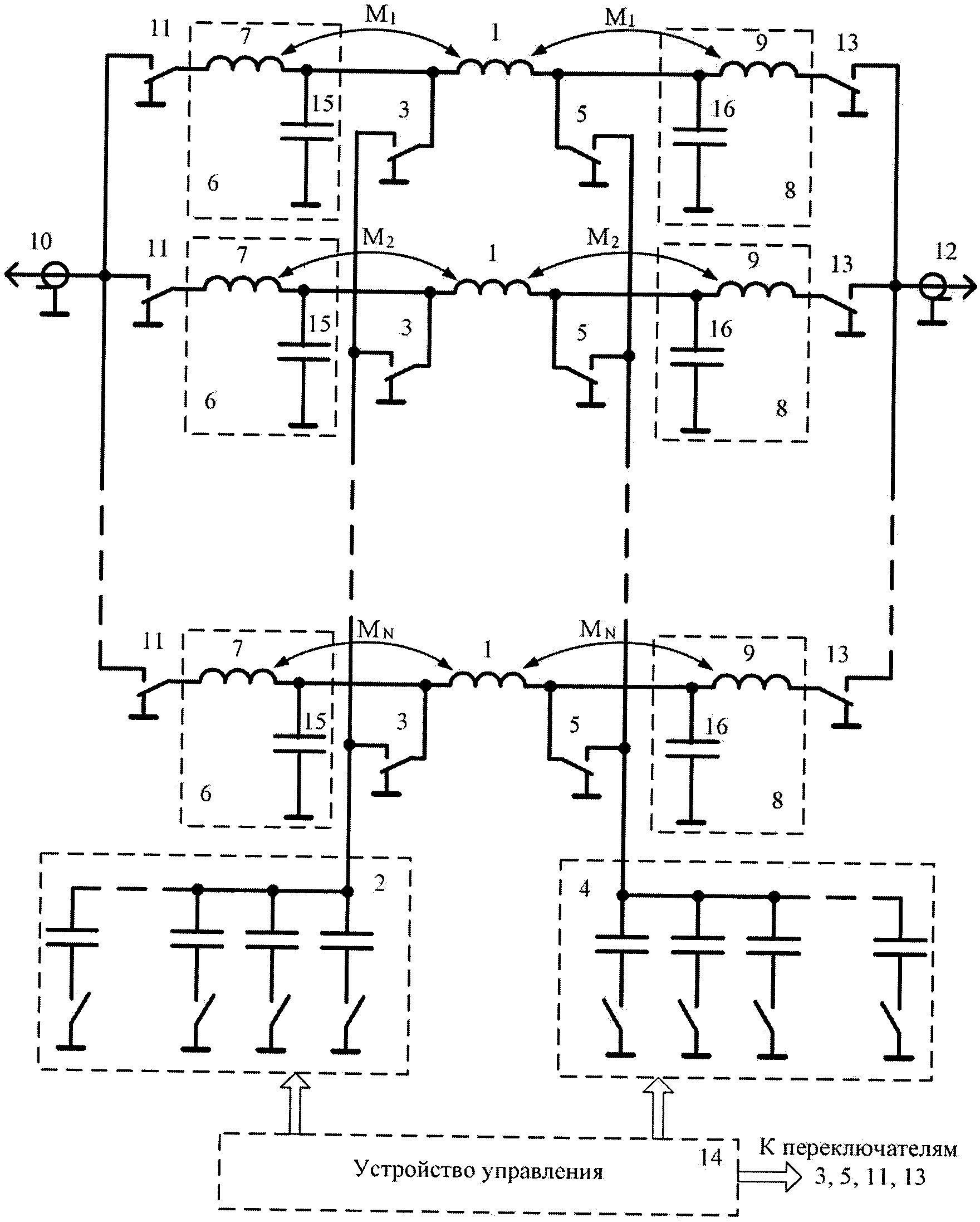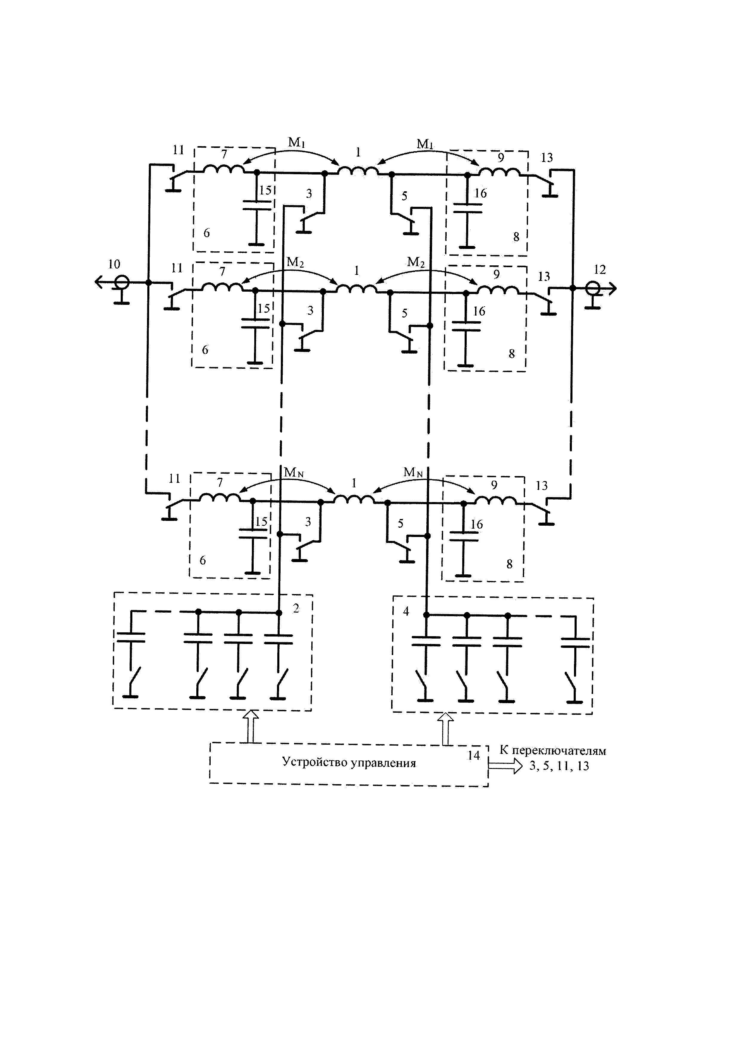 1. Фильтр гармоник коротковолнового передатчика, содержащий в средней своей части N средних катушек индуктивности, где N - число частотных поддиапазонов, первый конденсатор переменной емкости, подключаемый к первому выводу каждой средней катушки индуктивности при помощи одного из N первых переключателей, и второй конденсатор переменной емкости, подключаемый ко второму выводу каждой средней катушки индуктивности при помощи одного из N вторых переключателей, а также N входных Г-образных звеньев, каждое из которых содержит в продольном плече входную катушку индуктивности, соединенную с первым выводом соответствующей средней катушки индуктивности и связанную с ней индуктивной связью, и N выходных Г-образных звеньев, каждое из которых содержит в продольном плече выходную катушку индуктивности, соединенную со вторым выводом соответствующей средней катушки индуктивности и связанную с ней индуктивной связью, при этом вход каждого входного Г-образного звена подключен к входному разъему фильтра гармоник через соответствующий входной переключатель, а выход каждого выходного Г-образного звена подключен к выходному разъему фильтра гармоник через соответствующий выходной переключатель, причем первый и второй конденсаторы переменной емкости выполнены в виде набора конденсаторов, переключаемых при помощи устройства управления, отличающийся тем, что каждое входное Г-образное звено содержит на выходе в поперечном плече первый конденсатор постоянной емкости, а каждое выходное Г-образное звено содержит на входе в поперечном плече второй конденсатор постоянной емкости. 2. Фильтр гармоник коротковолнового передатчика по п. 1, отличающийся тем, что каждая средняя катушка индуктивности и связанные с ней индуктивной связью входная и выходная катушки индуктивности соответствующих входного и выходного Г-образных звеньев выполнены в виде трех соосно расположенных на определенном расстоянии друг от друга цилиндрических обмоток, соединенных между собой, при этом направление намотки средней катушки индуктивности противоположно направлению намотки входной и выходной катушек индуктивности соответствующих входного и выходного Г-образных звеньев. 3. Фильтр гармоник коротковолнового передатчика по п. 1, отличающийся тем, что он выполнен симметричным, при этом в каждом поддиапазоне частот отношение частоты полюса затухания к частоте настройки равно где Li - индуктивность входной и выходной катушки индуктивности соответствующих входного и выходного Г-образных звеньев; Mi - взаимоиндуктивность между средней катушкой индуктивности и входной, а также выходной катушками индуктивности соответствующих входного и выходного Г-образных звеньев; i - порядковый номер частотного поддиапазона, причем величина Кп при перестройке фильтра гармоник не изменяется.