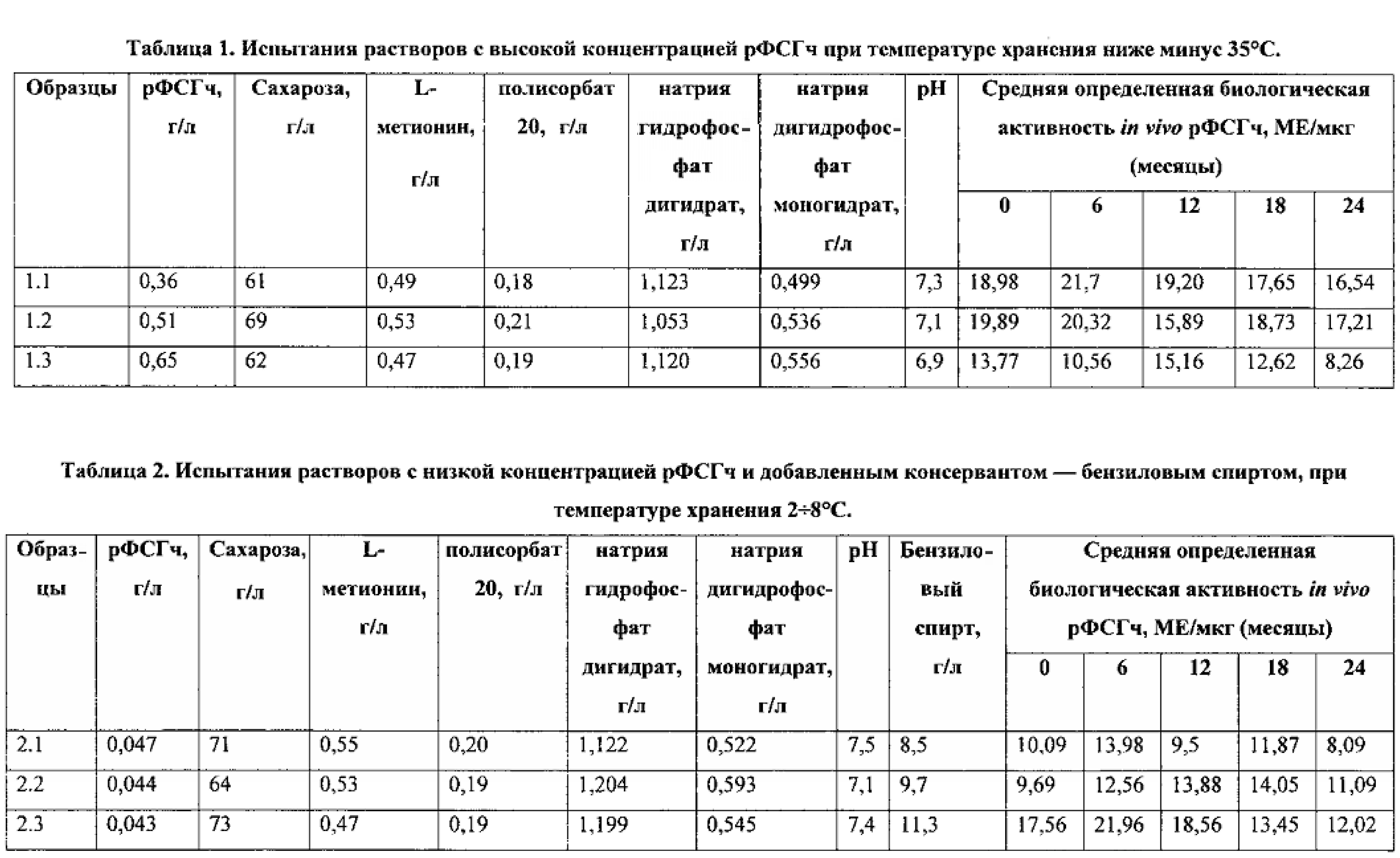 рФСГч 0,35÷0,65 стабилизирующий агент - сахароза 61÷75 стабилизирующий агент - полисорбат 20 0,18÷0,22 антиоксидант - L-метионин 0,45÷0,55 буферный агент - натрия гидрофосфат дигидрат 0,999÷1,221 буферный агент - натрия дигидрофосфат моногидрат 0,486÷0,594 рФСГч 0,040÷0,048 г/л стабилизирующий агент - сахароза 61÷75 стабилизирующий агент - полисорбат 20 0,18÷0,22 антиоксидант - L-метионин 0,45÷0,55 буферный агент - натрия гидрофосфат дигидрат 0,999÷1,221 буферный агент - натрия дигидрофосфат моногидрат 0,486÷0,594 бактериостатический агент - бензиловый спирт 8,5÷11,5 стабилизирующий агент - сахароза 68,46 стабилизирующий агент - полисорбат 20 0,2 антиоксидант - L-метионин 0,5 буферный агент - натрия гидрофосфат дигидрат 1,110 буферный агент - натрия дигидрофосфат моногидрат 0,540 бактериостатический агент - бензиловый спирт 10