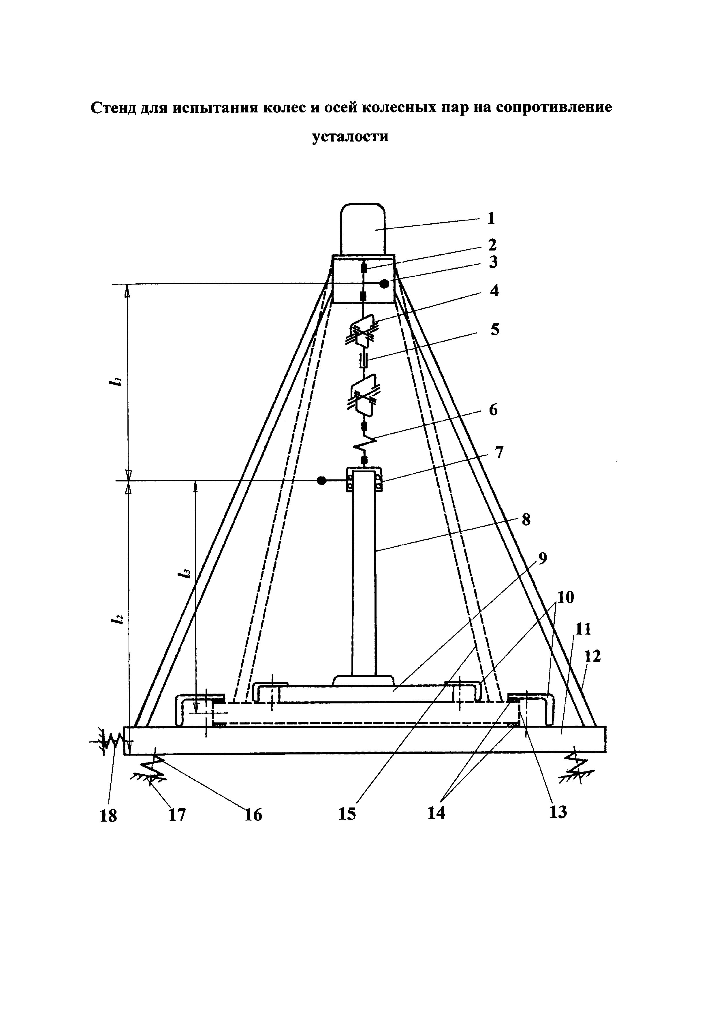 1. Стенд для проведения испытаний колес и осей колесных пар на сопротивление усталости, содержащий двигатель, передаточный механизм, нагружающее устройство с вращающейся неуравновешенной массой, которое установлено в верхней части испытываемых объектов, а именно на технологической оси, вставленной в центральное отверстие испытываемого колеса, или на испытываемой оси, вставленной в отверстие консольно удерживающей ее ступицы, закрепленных на опорной плите, которая через пружины опирается на фундаментное основание, отличающийся тем, что дополнительно соосно с валом нагружающего устройства установлен уравновешивающий механизм с неуравновешенной массой, повернутой относительно неуравновешенной массы нагружающего устройства на 180°, который посредством удерживающих его жестких стоек передает на опорную плиту силы инерции, направленные относительно сил инерции, создаваемых нагружающим устройством, в противоположную сторону, что приводит к снижению вибрации опорной плиты. 2. Стенд по п. 1, отличающийся тем, что для одновременного испытания нескольких объектов на опорной плите может быть выполнено несколько мест для установки испытываемых объектов, причем каждому из них соответствует свой двигатель, передаточный механизм, нагружающее устройство и уравновешивающий механизм. 3. Стенд по п. 1 или 2, отличающийся тем, что для дополнительной защиты опорной плиты от вибрации двигатель и уравновешивающий механизм с неуравновешенной массой посредством жестких стоек могут опираться на промежуточную опорную плиту, прикрепленную к опорной плите через упругие проставки. 4. Стенд по любому из пп. 1-3, отличающийся тем, что для увеличения жесткости подвески опорной плиты в горизонтальном направлении пружины, посредством которых опорная плита опирается на фундаментное основание, выполнены с отклонением от вертикальной линии. 5. Стенд по любому из пп. 1-3, отличающийся тем, что для увеличения жесткости подвески опорной плиты в горизонтальном направлении между опорной плитой и фундаментным основанием дополнительно устанавливаются горизонтально расположенные пружины.
