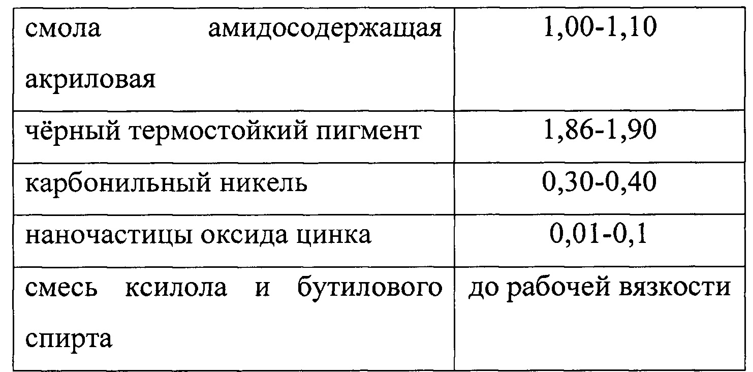 Изобретение относится к области космического материаловедения, а именно к составам для изготовления покрытий пассивной терморегуляции класса «истинный поглотитель» («ИП»). Терморегулирующие покрытия (ТРП) класса «истинный поглотитель» в конструкциях космических аппаратов (КА) применяются на поверхности оптических приборов, внешних поверхностях узлов с пассивным терморегулированием, радиаторов активных систем. Определяющими характеристиками ТРП являются коэффициент поглощения солнечного излучения αs, для ТРП «ИП» αs → 1, и коэффициент теплового излучения (степень черноты) ε, для ТРП «ИП» ε → 1. Введение в состав рецептуры эмалевой композиции функциональных добавок приводит к изменению свойств покрытия. Добавление наночастиц оксида железа (патент RU 2524384 C1 C09D 133/26 C09D 133/04 C09D 5/26) в состав эмалевой композиции (патент RU 2315794 C1 C09D 5/24 C09D 133) позволяет получить ТРП превосходящее покрытие согласно RU 2315794 по всем основным показателям (адгезия, оптические коэффициенты и электрофизические свойства). В указанных патентах описывается способ приготовления эмалевых композиций в бисерной мельнице. Наиболее близким к заявляемому изобретению по технической сущности и достигаемому результату является техническое решение, описанное в патенте RU 2524384. Техническим результатом, достигаемым при использовании настоящего изобретения, является увеличение коэффициентов поглощения солнечного излучения αs и теплового излучения ε ТРП класса «ИП», при сохранении адгезии покрытия к материалу подложки на уровне 1 балл согласно требованиям ГОСТ 15140. Указанный результат достигается использованием эмалевой композиции, содержащей в качестве связующего раствор смолы амидосодержащей акриловой в смеси растворителей ксилола и бутилового спирта в соотношении 4:1, в качестве наполнителей - черный термостойкий пигмент и карбонильный никель, дополнительно содержащей и наночастицы оксида цинка при следующем соотношении компонентов, мас. ч.: Предлагаемые эмалевые композиции для изготовления ТРП получают следующим образом: 1. Изготовление раствора смолы с наночастицами оксида цинка. Наночастицы оксида цинка вводятся в раствор смолы амидосодержащей акриловой АС в смеси растворителей ксилола и бутилового спирта в соотношении 4:1 с помощью ультразвукового диспергатора. 2. Дальнейшее приготовление эмалевой композиции проводится в бисерной мельнице. В рабочий стакан бисерной мельницы последовательно загружаются компоненты согласно рецептуре, после чего включается мешалка. Содержимое диспергируется до достижения степени перетира 35-40 мкм по прибору «Клин». Содержимое выгружается с одновременной фильтрацией. Изготовление терморегулирующего покрытия на основе предлагаемых эмалевых композиций производят путем нанесения эмали на подготовленную поверхность методом пневматического распыления. Давление сжатого воздуха при распылении составляет 2,5-3,0 атм. Рабочую вязкость эмали при помощи смеси растворителей доводят до 14-16 с по вискозиметру ВЗ-246 с диаметром сопла 4 мм. Сушку покрытия проводят при температуре 20±2°С в течение 48 часов. Толщина покрытия контролируется цифровым толщиномером и составляет 60-80 мкм. В результате получают ровное покрытие без посторонних включений. Предлагаемое изобретение иллюстрируется нижеприведенными примерами. Пример 1 На пе