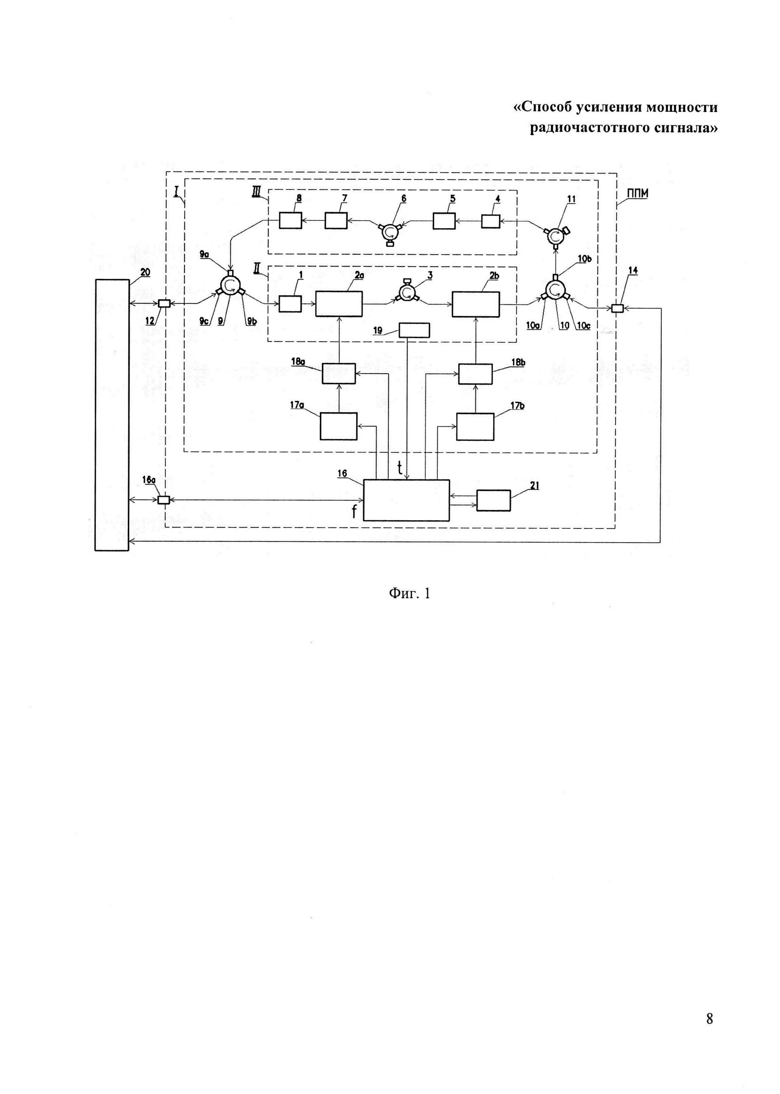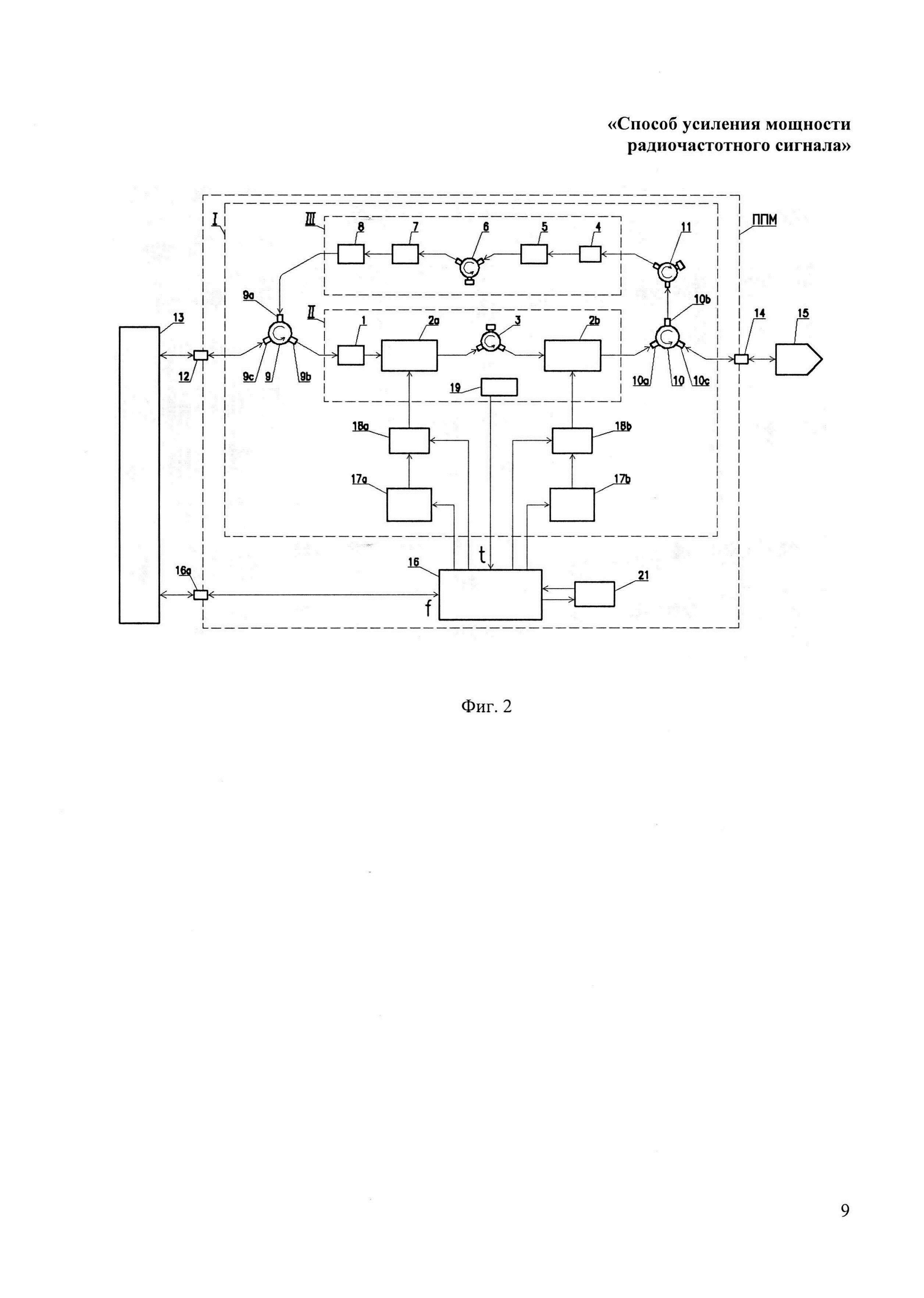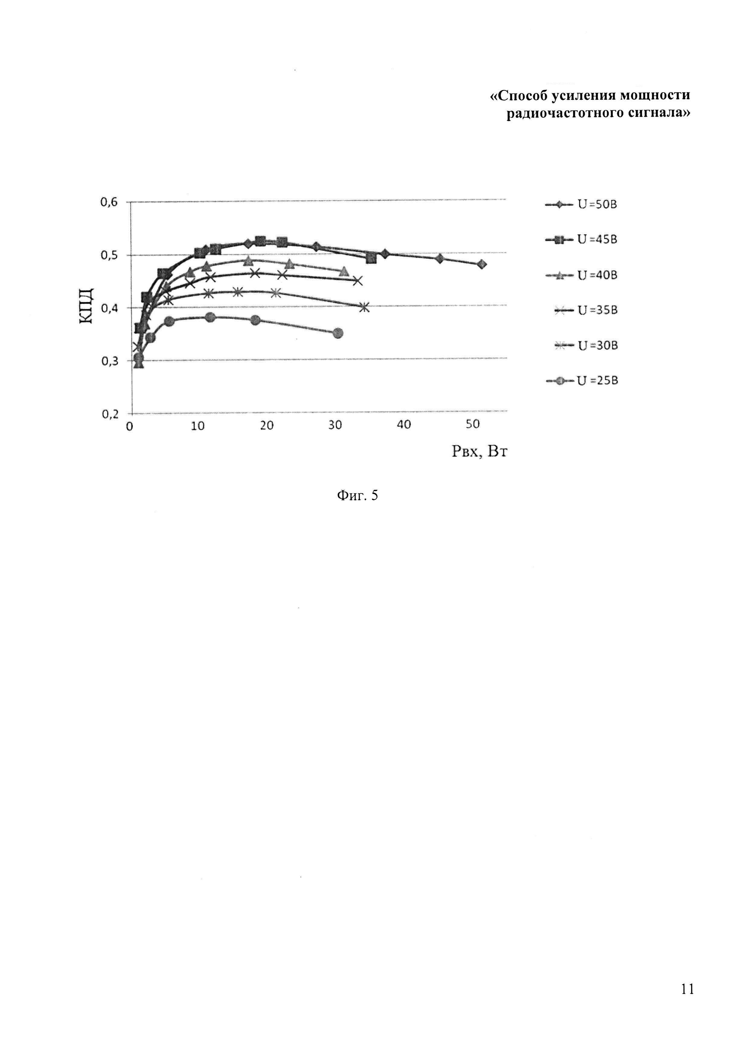 Изобретение относится к области радиоэлектроники и может быть использовано для усиления мощности радиочастотного сигнала, в приемо-передающем СВЧ-модуле активной фазированной антенной решетки, в частности радиолокационной станции, работающей в импульсном режиме. Для усиления мощности радиочастотного сигнала подают радиочастотный сигнал на вход передающего тракта, включающего по меньшей мере предварительный и выходной усилители мощности, содержащие транзисторы, работающие в режиме глубокого насыщения. Предварительно формируют калибровочную таблицу, отражающую зависимость между мощностью на выходе приемо-передающего канала и соответствующим напряжением питания каждого из упомянутых усилителей мощности. Напряжение питания выходного усилителя мощности выбирают из условия получения заданной мощности на выходе приемо-передающего канала, а напряжение питания предварительного усилителя мощности выбирают из условия получения максимального значения КПД выходного усилителя мощности. Затем на выходе приемо-передающего канала получают радиочастотный сигнал заданной мощности путем подачи на каждый из упомянутых усилителей мощности соответствующего напряжения питания, выбираемого в соответствии с упомянутой калибровочной таблицей. Технический результат заключается в уменьшении энергопотребления и тепловых потерь. 1 з.п. ф-лы, 5 ил.