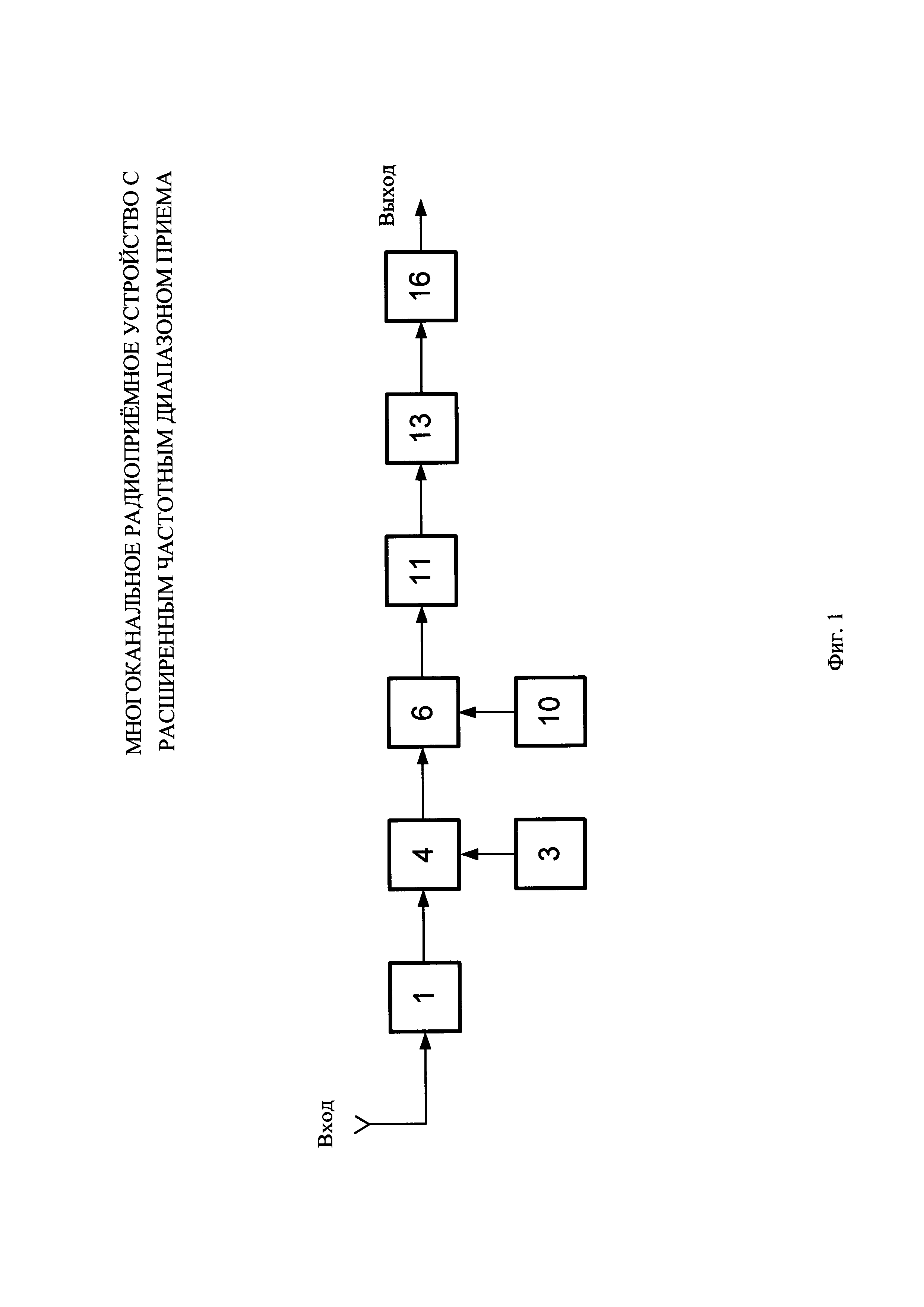 Изобретение относится к области техники приема и обработки радиосигналов и может быть использовано для создания перспективных радиосредств с программируемой архитектурой и цифровой обработкой сигналов непосредственно на радиочастоте для обеспечения эффективной по стоимости и мощности потребления многоканальной радиосвязи в расширенном частотном диапазоне приема. Такие тракты описаны, например, в книгах «Software Radio: Sampling Rate Selection, Design and Synchronization», Springer, 2012, pp.131 авторов Elettra Venosa, Fredric J. Harris и Francesco A.N. Palmieri, «Undersampling techniques simplify digital radio», Electronic Design, Vol. 39, May 23, 1991, No. 10, pp.67, 68, 70, 73-75, 78 авторов Richard Groshong и Stephen Ruscar, и «Software Defined Radios: From Smart(er) to Cognitive)), 1st Ed, Springer, 2009, pp.139 авторов Sofie Pollin, Michael Timmers, Liesbet Van der Perre. Сущность таких устройств заключается в осуществлении аналого-цифрового преобразования (АЦП) на радиочастоте, а также в применении различных методов изменения частотного режима работы аналого-цифрового тракта (АЦТ) для приема на частотах из непрерывного диапазона, перекрывающего несколько полос Найквиста, что позволяет уменьшить стоимость и мощность потребления радиоприемного устройства. В существующих аналогах [1-3] изменение частоты дискретизации в соответствии с частотой основного канала приема (ОКП) функционально ограничивает многоканальность приемного тракта вследствие необходимости использовать различные частоты дискретизации для приема на разных частотах. Кроме того, для изменения частоты дискретизации необходимо время, что в любом случае снижает предельно достижимое быстродействие (время перестройки с частоты на частоту) радиоприемного устройства. Наиболее близким аналогом к предлагаемому, является устройство, описанное в статье [4], принятое за прототип. На фиг. 1 представлена функциональная схема устройства-прототипа, где обозначено: 1 - блок входных цепей и преселектора; 3 - формирователь размывающего сигнала; 4 - сумматор; 6 - аналого-цифровой преобразователь (АЦП); 10 - перестраиваемый источник частоты дискретизации; 11 - цифровой приемный тракт; 13 - преобразователь частоты дискретизации; 16 - демодулятор. Устройство-прототип содержит последовательно соединенные блок входных цепей и преселектора 1, сумматор 4, АЦП 6, цифровой приемный тракт 11, преобразователь частоты дискретизации 13 и демодулятор 16, выход которого является информационным выходом устройства; а также формирователь размывающего сигнала 3, выход которого соединен со вторым входом сумматора 4; и перестраиваемый источник частоты дискретизации 10, выход которого соединен с тактовым входом АЦП 6. При этом вход блока входных цепей и преселектора 1 является входом устройства. Устройство-прототип работает следующим образом. Входной радиочастотный сигнал поступает на вход радиоприемного устройства и проходит через блок входных цепей и преселектора 1, в котором происходит его усиление и ослабление сигналов на частотах побочных каналов приема (ПКП). С выхода блока 1 принимаемый сигнал поступает на первый вход сумматора 4. На второй вход сумматора поступает сигнал с выхода формирователя размывающего сигнала 3. С выхода сумматора 4 сигнал поступает на сигнальный вход АЦП 6, на тактовый вход которого поступает сигнал с частотой дискретизации. Для формирования частоты дискретизации применяется перестраиваемый источник частоты дискретизации 10 с диапазоном формируемых ча