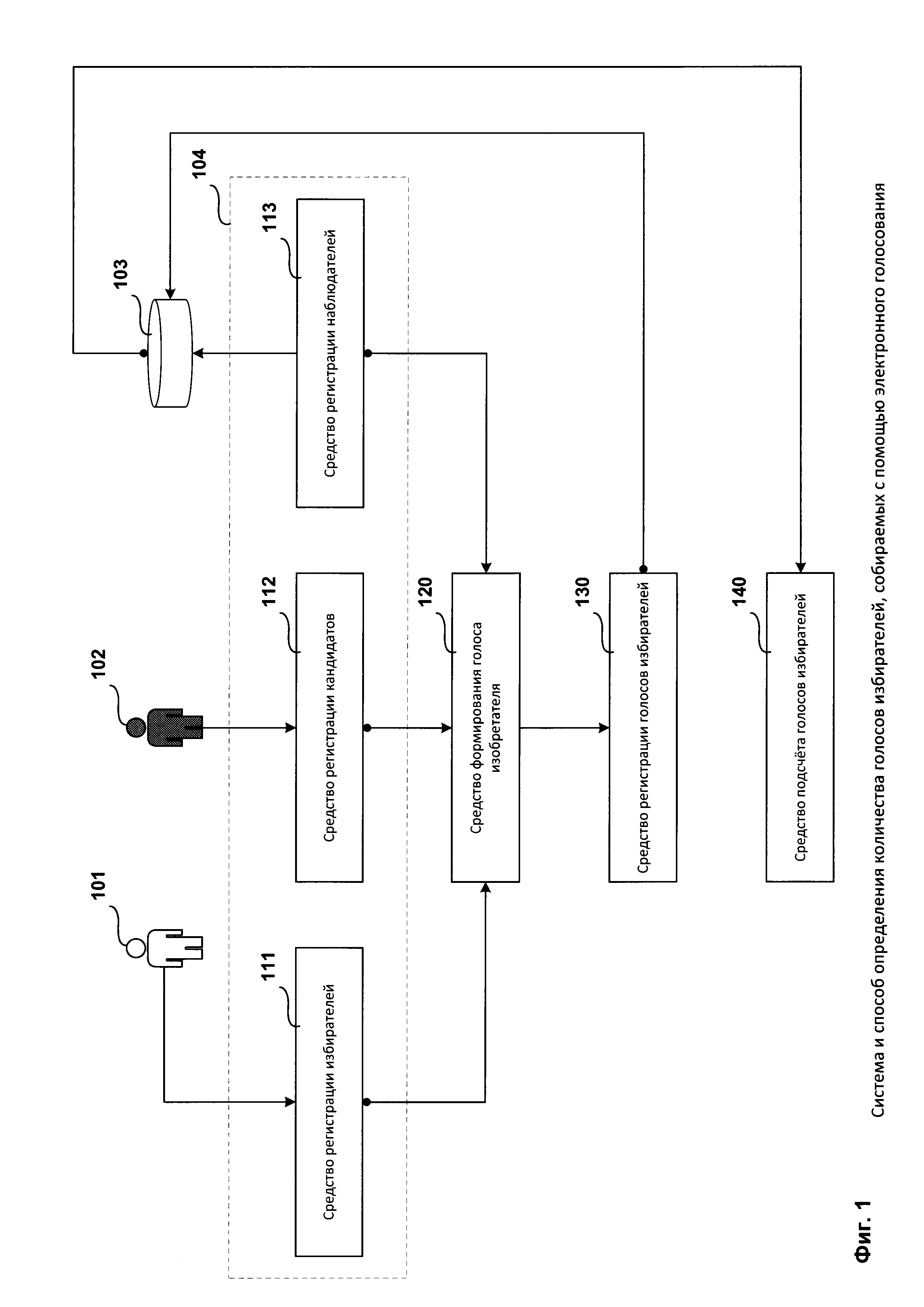 децентрализованного реестра записей, который будет модифицироваться с учетом сформированных голосов, получаемых наблюдателем 103 от избирателей 101;