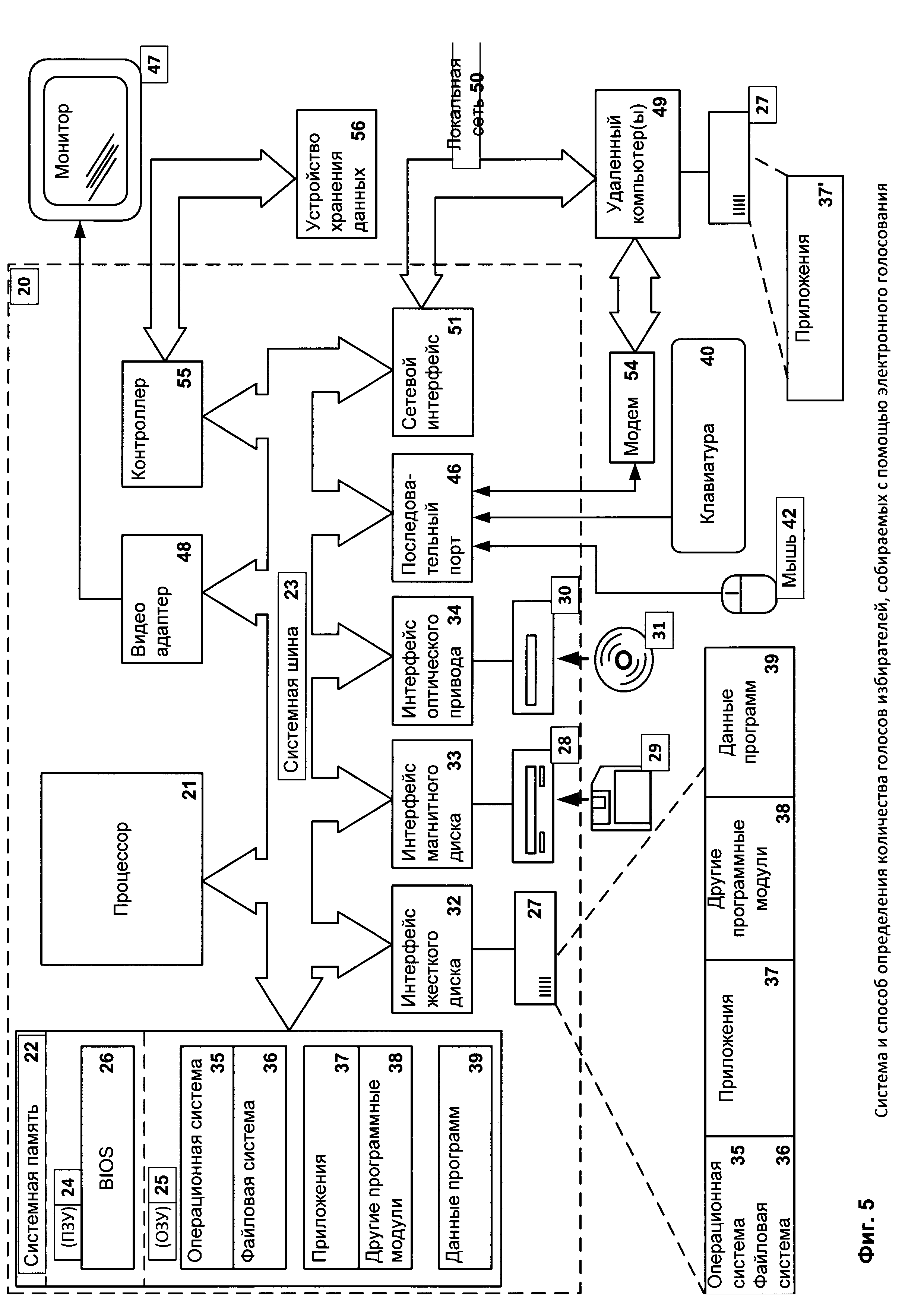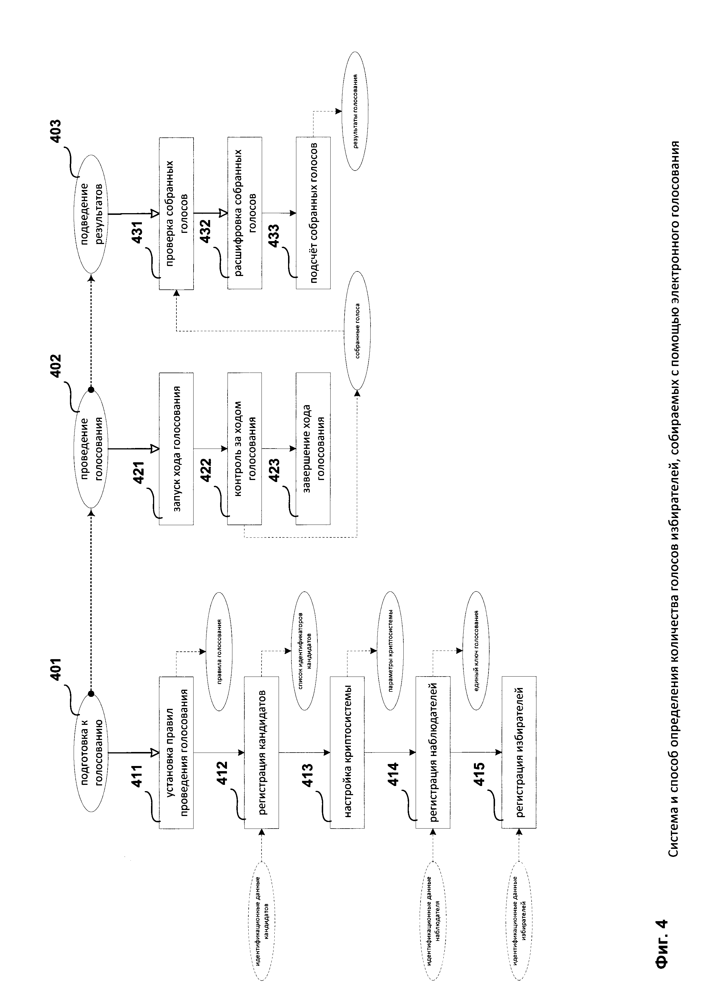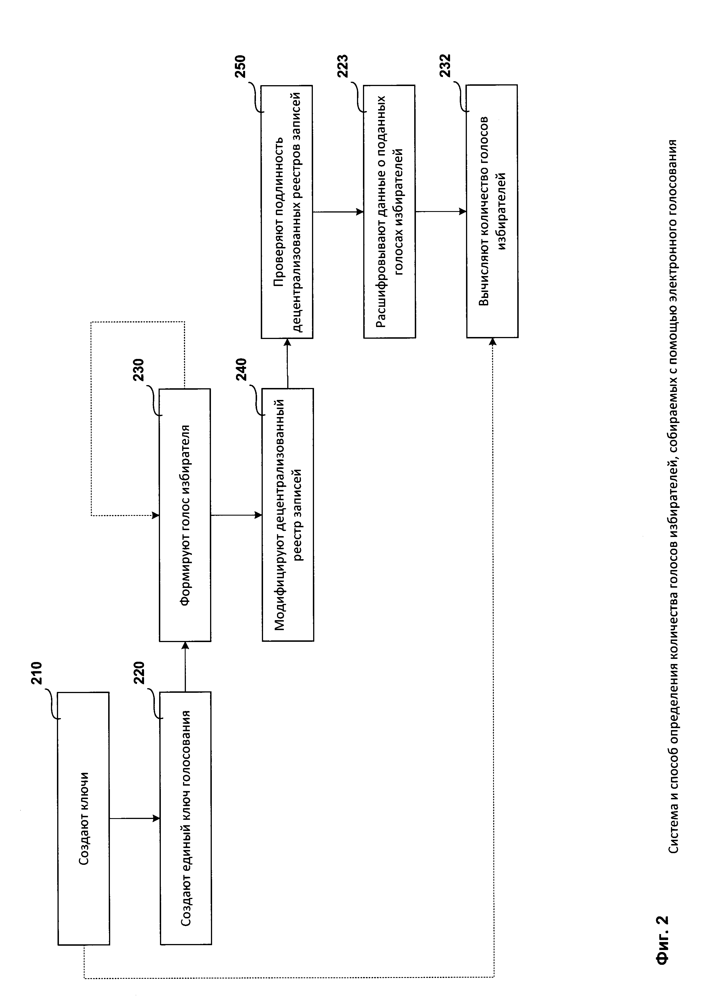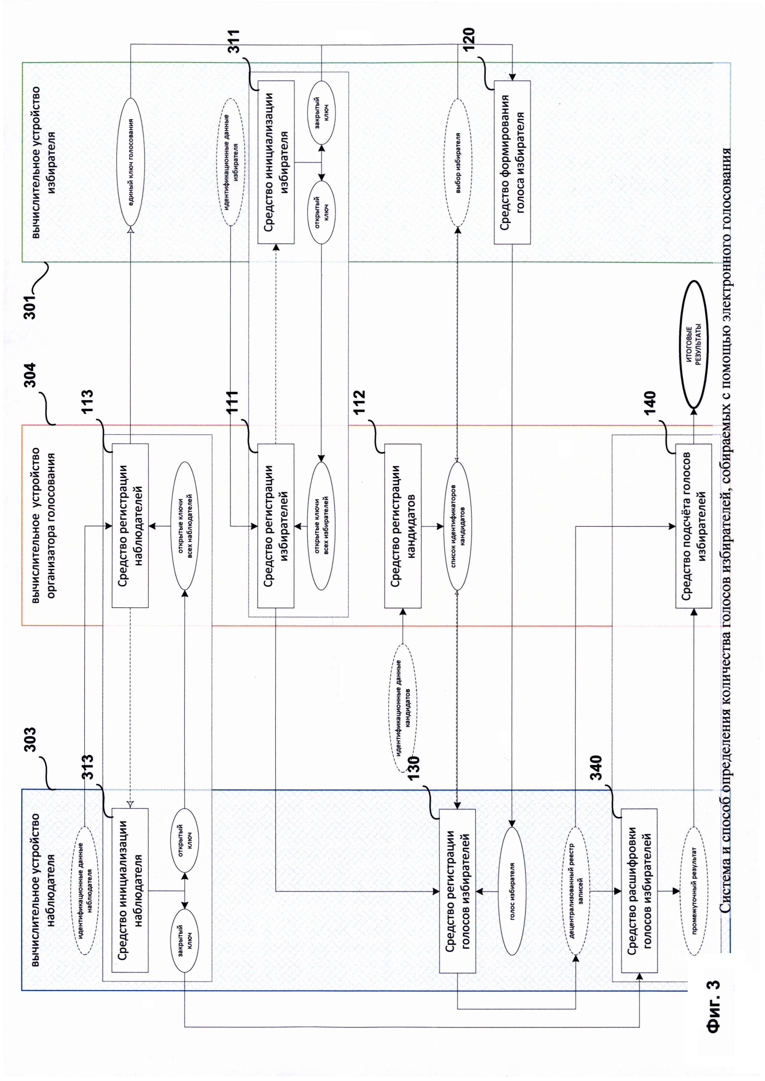 1. Система определения количества голосов избирателей, собираемых с помощью электронного голосования, при этом голос избирателя представляет собой выбор избирателя по меньшей мере одного из кандидатов, при этом упомянутая система включает одно вычислительное устройство организатора голосования, вычислительные устройства по меньшей мере двух наблюдателей и вычислительные устройства по меньшей мере двух избирателей и содержит: а) средство регистрации наблюдателей, работающее на вычислительном устройстве организатора голосования и предназначенное для: - создания для каждого наблюдателя на основании полученных от наблюдателя идентификационных данных: - открытого ключа, используемого для шифрования голоса избирателя, и закрытого ключа, используемого для расшифрования голоса избирателя, - децентрализованного реестра записей, который будет модифицироваться с учетом сформированных голосов, получаемых наблюдателем от избирателей, - передачи каждого созданного децентрализованного реестра записей на вычислительные устройства того наблюдателя, для которого упомянутый децентрализованный реестр записей был создан, - передачи созданных закрытых ключей средству подсчета голосов избирателей, - создания на основании созданных открытых ключей всех наблюдателей единого ключа голосования; - передачи единого ключа голосования на вычислительные устройства избирателей; б) средство формирования голоса избирателя, работающее на вычислительном устройстве избирателя и предназначенное для: - формирования голоса избирателя на основании данных о выборе избирателя, включая шифрование формируемого голоса избирателя единым ключом голосования; - передачи сформированного голоса средству регистрации голосов избирателей по меньшей мере одного наблюдателя; в) средство регистрации голосов избирателей, работающее на вычислительном устройстве наблюдателя и предназначенное для: - модификации децентрализованного реестра записей с учетом полученного голоса избирателя; - передачи упомянутого децентрализованного реестра записей средству подсчета голосов избирателей после завершения голосования; г) средство подсчета голосов избирателей, работающее на вычислительном устройстве организатора голосования и предназначенное для: - проверки подлинности децентрализованных реестров записей; - расшифровывания при положительном результате упомянутой проверки децентрализованных реестров записей с помощью не менее одного закрытого ключа, созданного средством регистрации наблюдателей, данных о поданных голосах избирателей в децентрализованном реестре записей; - на основании расшифрованных данных о поданных голосах избирателей вычисления количества голосов избирателей, отданных за каждого из кандидатов. 2. Система по п. 1, которая дополнительно содержит средство регистрации избирателей, работающее на вычислительном устройстве организатора голосования и предназначенное для: - создания для каждого избирателя цифровой подписи избирателя, используемой при формировании голоса избирателя; - передачи созданной цифровой подписи избирателя на компьютерное устройство избирателя. 3. Система по п. 1, которая дополнительно содержит средство регистрации кандидатов, работающее на вычислительном устройстве организатора голосования и предназ