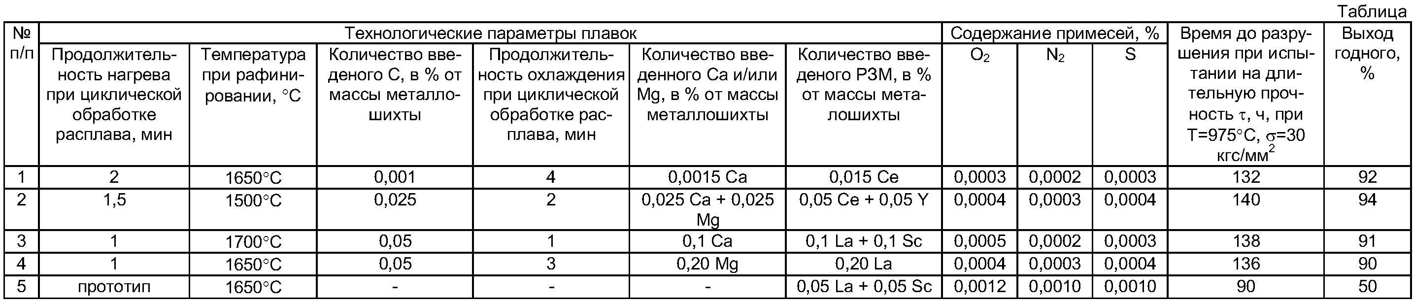 1. Способ получения литейных жаропрочных сплавов на никелевой основе, включающий расплавление состоящей из отходов металлошихты, рафинирование ее в вакууме при температуре расплава 1500-1700°С и присадку РЗМ в количестве 0,015-0,20% от массы металлошихты, отличающийся тем, что при рафинировании металлошихты вводят 0,001-0,05% углерода от ее массы и осуществляют циклическую обработку расплава путем нагрева и охлаждения при соотношении продолжительности нагрева и охлаждения в цикле (0,5-1,0):(1,0-1,5), а перед присадкой РЗМ вводят кальций и/или магний. 2. Способ по п.1, отличающийся тем, что металлошихта состоит из отходов литейного производства и/или утилизированных деталей из литейных жаропрочных сплавов, поверхность которых подвергнута пескоструйной или дробеструйной обработке. 3. Способ по п.1 или 2, отличающийся тем, что расплавление металлошихты производят под давлением инертного газа 50-500 мм рт.ст. 4. Способ по п.3, отличающийся тем, что кальций и/или магний вводят при их соотношении с РЗМ Q1=(0,1-1,0)Q2, где Q1 - количество кальция и/или магния в % от массы металлошихты, Q2 - количество РЗМ в % от массы металлошихты.