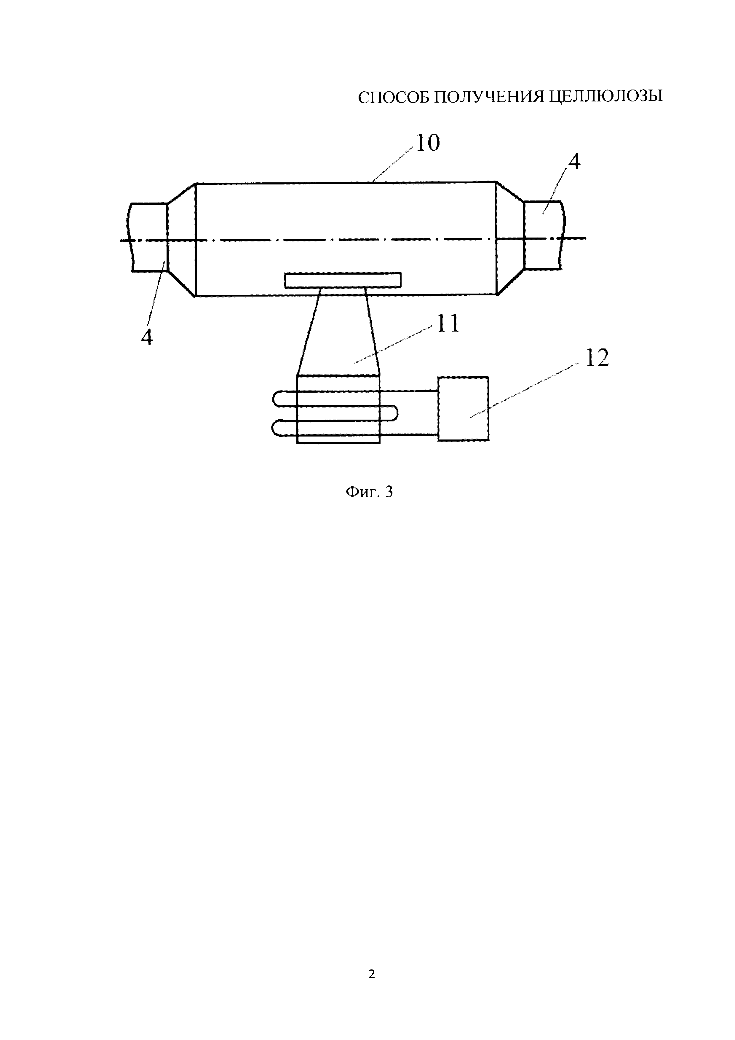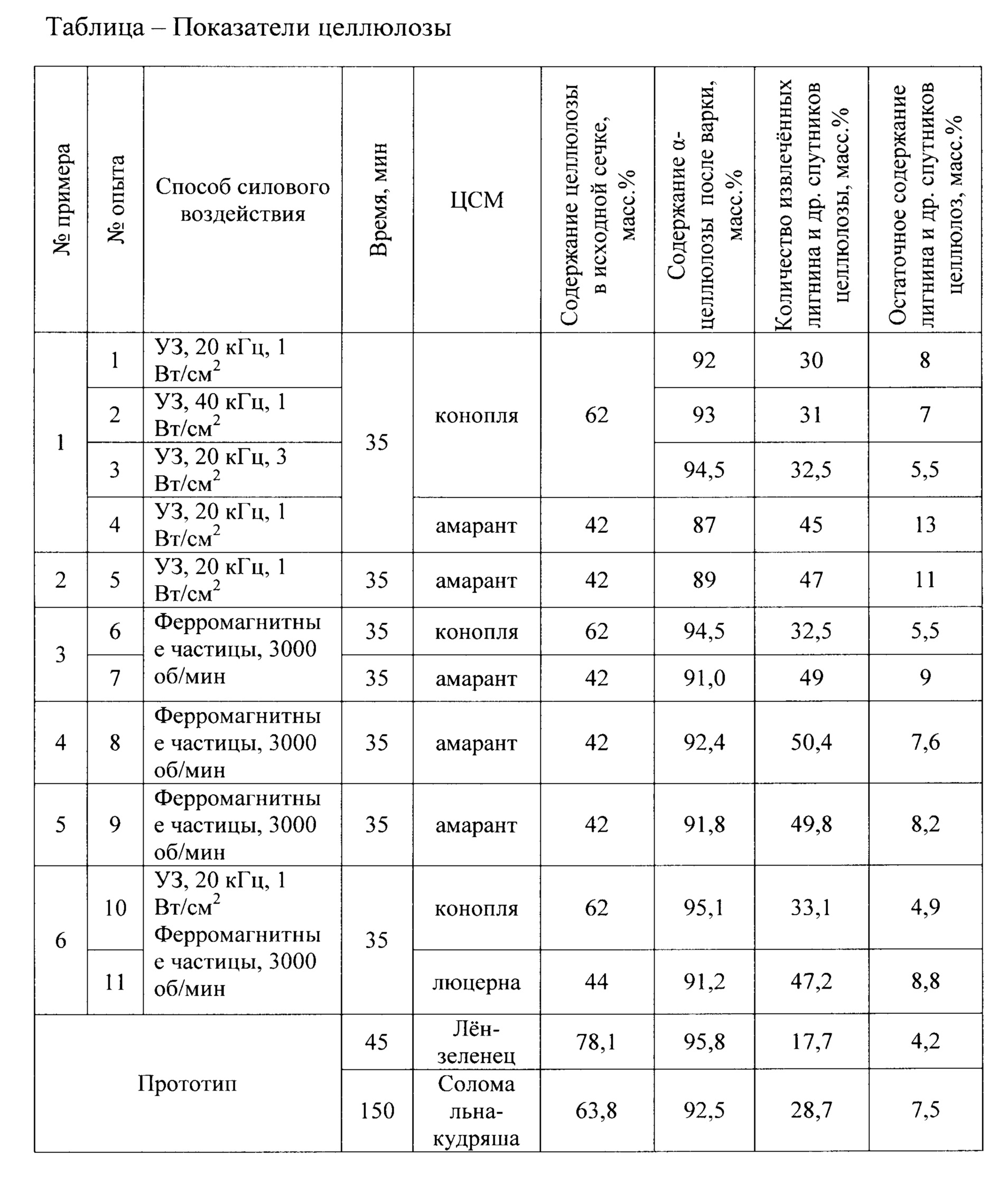 Изобретение относится к области целлюлозно-бумажного производства, может быть использовано при получении целлюлозы из недревесного однолетнего растительного сырья. Известен способ получения целлюлозы, включающий механическую обработку целлюлозосодержащего материала (ЦСМ) путем одновременного его рыхления и очистки, варку в щелочном растворе при температуре 130-140°С под давлением 3-4 атм. в течение 180-210 мин, промывку, отбелку в кислом растворе гипохлоритом натрия, отжим, рыхление и сушку (патент RU 2078163, кл. D04H 1/02, оп. 27.04.1997). Недостатками способа являются проведение процесса щелочной варки в жестких условиях и использование для отбелки канцерогенного гипохлорита натрия. Известен способ получения целлюлозы путем одновременного рыхления и очистки целлюлозосодержащего материала, измельчения, замочки в растворе NaOH и очистки, щелочной варки в течение 1,5-3 часов при гидромодуле 1:(5-20), содержащем дополнительно ПАВ, промывки, отбелки в растворе H2O2, промывки, отжима и сушки (патент RU 2304647, кл. D21C 5/00, D21C 1/06, D21C 3/02, D01C 1/02, оп 20.08.2007). Недостатками известного способа является невозможность получения целлюлозы из ЦСМ с высокой степенью закостренности и большим содержанием лигнина в полупродукте. Известны способы активации ферментативного гидролиза ЦСМ и выделения лигнина и других спутников целлюлозы с помощью ультразвуковой обработки (УЗО). Обработка проводится в ультразвуковых ваннах в течение от 5 минут до нескольких часов (см., например, Донцов А.Г. Влияние ультразвуковой кавитации на реакционную способность лигноцеллюлозных субстратов при биоконверсии растительной биомассы / А.Г. Донцов, А.П. Карманов, Л.С. Кочева и др. / Бутлеровские сообщения 2014, Т. 39,№9. - с 52-57). Недостатком является длительность процесса и его периодичность. Такой способ применим только для ЦСМ с высоким содержанием целлюлозы. Наиболее близким, выбранным в качестве прототипа, является способ получения целлюлозы из льняного сырья, включающий рыхление и очистку ЦСМ, дополнительную промывку и резку, замочку (варку) измельченного сырья в щелочном растворе в течение 15-60 минут, термомеханохимическую активацию (ТМХА) подготовленной пульпы в течение 15-30 минут, промывку, отбелку, промывку, отжим и сушку. При необходимости после ТМХА добавляется стадия дозревания (дополнительной варки) в течение 30-60 минут (RU 2343241, D21C 5/00, D21C 1/06, D21C 9/12, D21B 1/16, D01C 1/02, 10.01.2009). Недостатком способа является длительность операции замочки (варки) ЦСМ. Технической проблемой является уменьшение времени щелочной варки ЦСМ при одновременном сохранении качества получаемой целлюлозы. Техническая проблема решается способом, включающим дробление и очистку целлюлозосодержащего материала (ЦСМ), варку в щелочном растворе, термомеханохимическую активацию (ТМХА) целлюлозосодержащего материала, промывку, отбелку, промывку и сушку, при этом щелочную варку целлюлозосодержащего материала совершают с термомеханохимической активацией, которую осуществляют вне емкости варки непрерывно в возвратном потоке с использованием ультразвукового поля и/или потоком анизотропных ферромагнитных тел. Объем раствора ЦСМ, перемещаемого из емкости варки, за время операции щелочной варки может превышать объем материала, находящегося в емкости варки. Термомеханохимическая активация может быть выполнена с использованием одного а