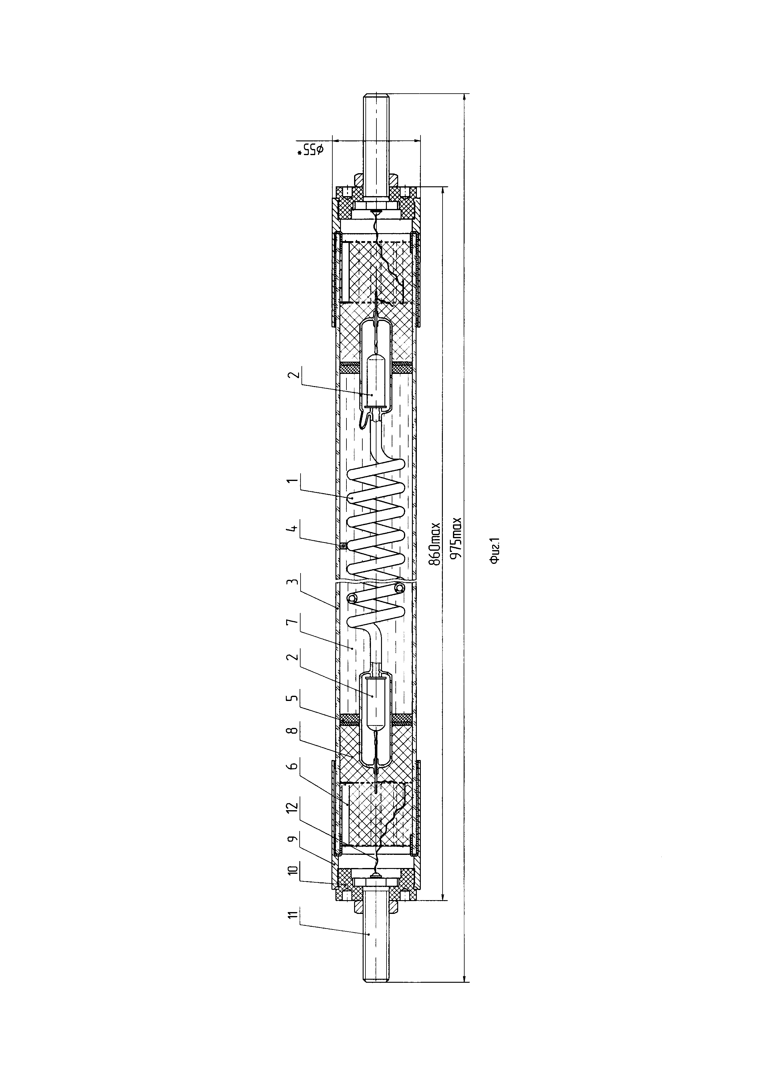 1. Газоразрядная лампа, включающая прозрачный корпус, в котором расположены разрядный капилляр в форме спирали с электродами на его концах, наполненный газом, содержащим неон, опорную втулку из металла, охватывающую один из торцов корпуса, и электродные держатели, соединяющие электроды с источником питания, отличающаяся тем, что в корпус введены уплотнительные кольца, фиксирующие положение концов разрядного капилляра и образующие объем, заполненный прозрачной демпфирующей жидкостью, и вторая опорная втулка, охватывающая второй торец корпуса, при этом на опорных втулках закреплены фланцы с электродными держателями, объемы между уплотнительными кольцами и торцами корпуса, в которых расположены балластные резисторы, соединенные с электродами и электродными держателями, заполнены эластичным компаундом, а газовое наполнение состоит из смеси неона и аргона, взятых в соотношении (300:1)÷(400:1) и суммарном давлении 3≤p/d≤4, где р - давление газов, мм рт.ст., d - диаметр разрядного канала, мм. 2. Газоразрядная лампа по п. 1, отличающаяся тем, что в качестве электродов использованы электроды Технолюкс серии Маэстро. 3. Газоразрядная лампа по п. 1 или 2, отличающаяся тем, что в качестве материала корпуса использовано кварцевое стекло. 4. Газоразрядная лампа по любому из пп. 1-3, отличающаяся тем, что разрядный капилляр в корпусе дополнительно закреплен эластичными центраторами. 5. Газоразрядная лампа по любому из пп. 1 -4, отличающаяся тем, что электроды лампы подключены к источнику постоянного или переменного напряжения.