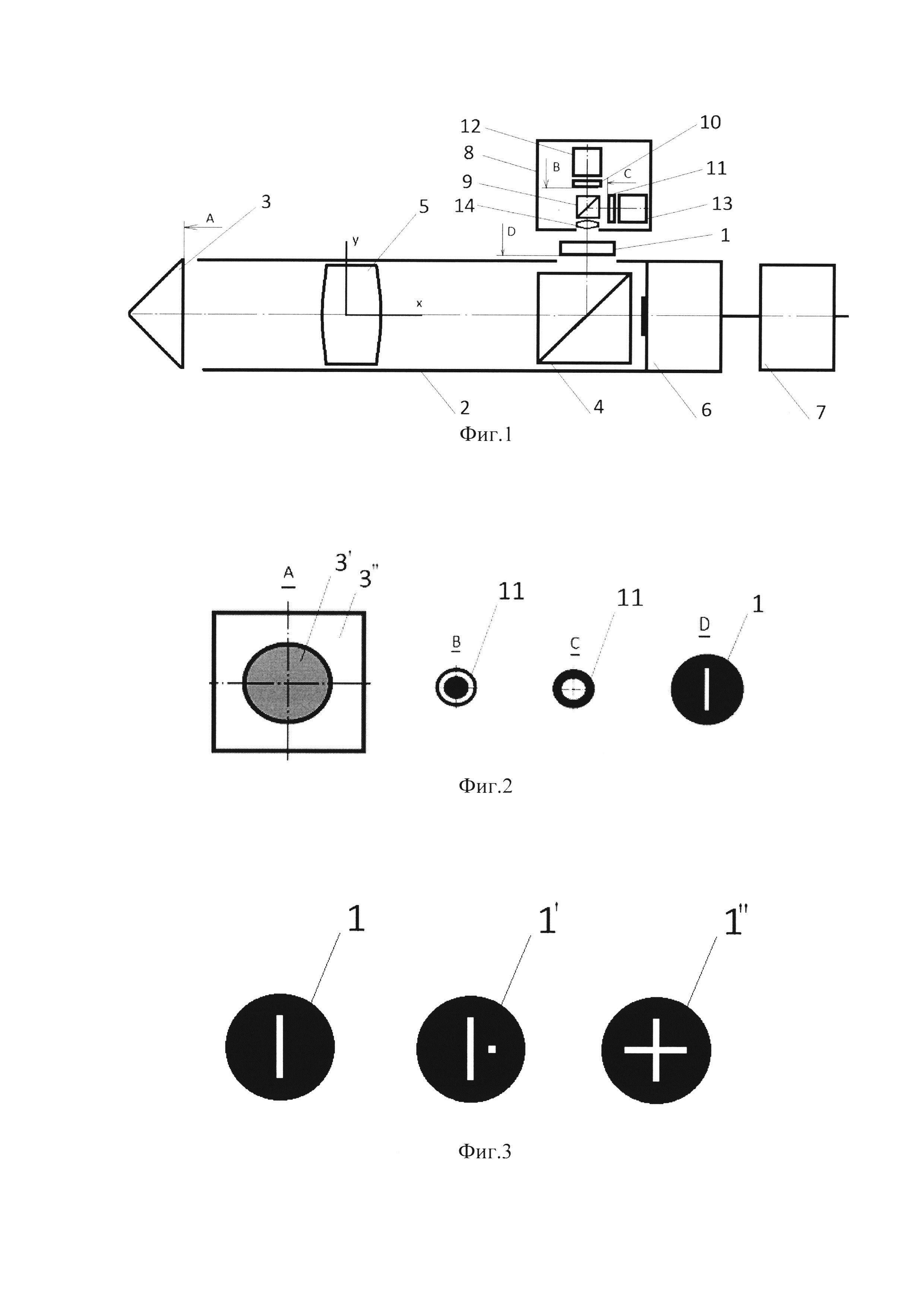 Предлагаемое устройство относится к области измерительной техники и может быть использовано в станкостроении, приборостроении, робототехнике, в частности, различных углоизмерительных устройствах, устанавливаемых и работающих на космических аппаратах (КА), предназначенных для точного определения направления осей КА на астроориентир в приборной системе координат. В настоящее время для решения задачи индикации положения осей КА получили распространение современные звездные приборы - измерители углов трехосной ориентации, которые определяют угловые координаты не отдельной звезды, а углы трехосной ориентации в приборной системе координат относительно мировой системы координат (см., например, Федосеев В.И., Колосов М.П. Оптико-электронные приборы ориентации и навигации космических аппаратов. - М.: Логос, стр. 156-160). Задачу определения (измерения) трехосной ориентации одного твердого тела относительно другого можно решать по-разному: - использовать два разных датчика угла поворота: один обычный двумерный фотоэлектрический автоколлиматор с матричным приемником излучения (МПИ) (см., например, Бондаренко И.Д. Принципы построения фотоэлектрических автоколлиматоров. - Мн.: Изд. «Университетское», 1984, стр. 5-9, 21-24), а другой датчик угла поворота для решения одномерной задачи измерения плоского угла (см. Дукаревич Ю.Е., Дукаревич М.Ю. «Абсолютный преобразователь угла (варианты), патент РФ №2419067, публ. 20.05.2011); - использовать специализированный прибор для определения трехосной ориентации одного твердого тела относительно другого. В настоящее время получили распространение датчики угла поворота (ДУП) (фотоэлектрические цифровые преобразователи угла), использующие кодовые и растровые преобразования (см., например, Преснухин Л.Н. и др. «Фотоэлектрические преобразователи информации». - М.: Машиностроение, 1974, стр. 301-304), но эти датчики не обеспечивают высокой угловой чувствительности и минимальных габаритных параметров. Известен измеритель угла, выполненный в соответствии с новой концепцией измерения, основанный на определении углового положения изображения оптической марки на светочувствительной матрице цифровой камеры с использованием алгоритмов обработки изображений и специальных алгоритмов обработки данных (Королев А.Н., Лукин А.Я., Полищук Г.С. «Новая концепция измерения угла. Модельные и экспериментальные исследования», Оптический журнал, 2012, т. 79, №6, стр. 52-58), что делает актуальной задачу уменьшения габаритов таких датчиков при одновременном увеличении их точности. С указанной точки зрения наибольший интерес представляет малогабаритный датчик угла (патент РФ №2419067, публ. 20.05.2011), содержащий контрольный элемент, закрепленный на контролируемом объекте, источник света, сигнальную маску с прозрачной щелью, расположенной в фокальной плоскости объектива, и приемный узел, включающий объектив, в фокальной плоскости которого установлена приемная матрица, выходом подключенная к персональному компьютеру, осуществляющему определение угла разворота контрольного элемента по пространственному положению изображения светящейся щели относительно приемной матрицы, либо содержащий контрольный элемент, закрепленный на контролируемом объекте, состоящий из сигнальной маски с зеркальным штрихом, и приемный узел, включающий осветитель с 