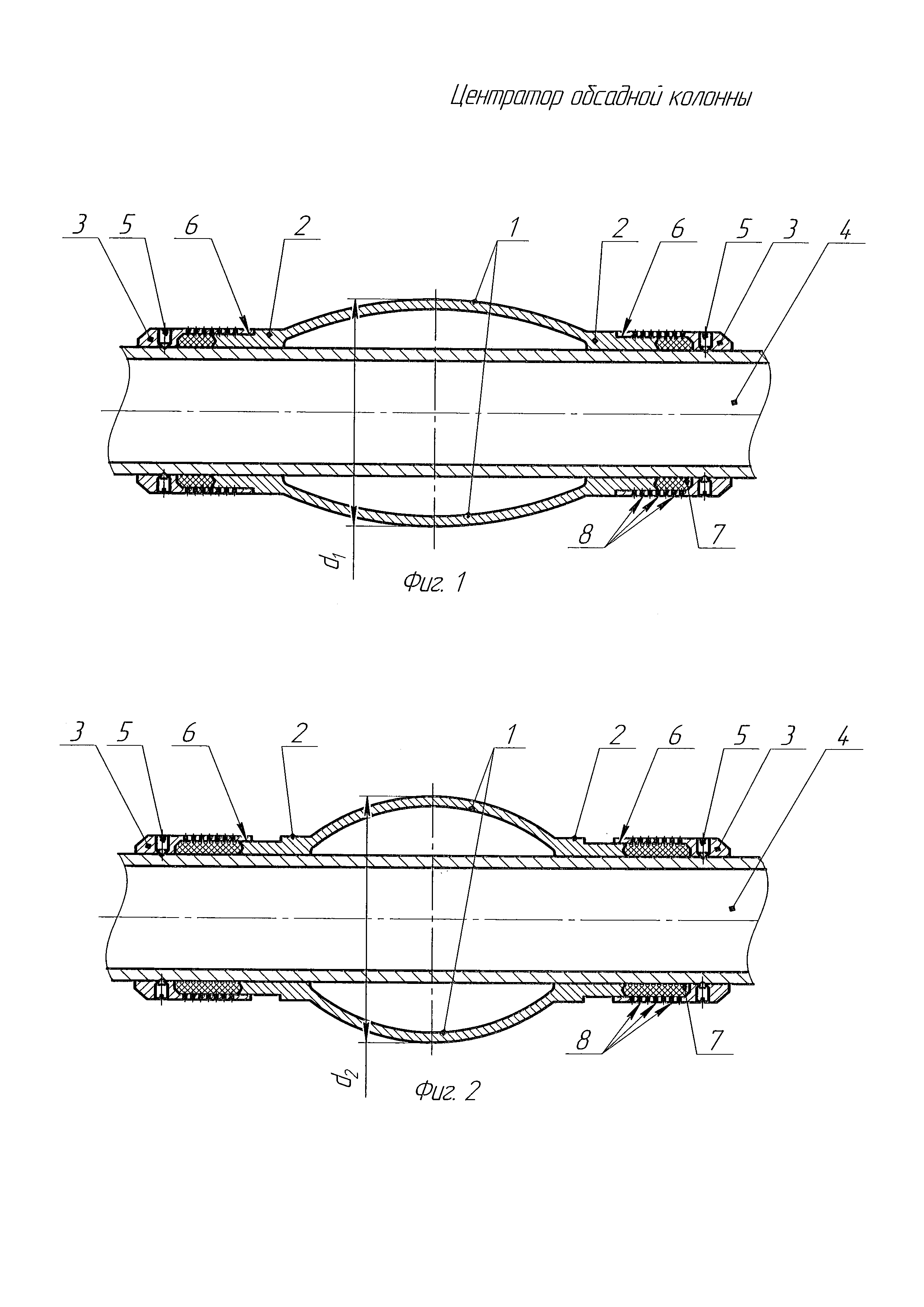 Изобретение относится к строительству скважин и может быть использовано в компоновке обсадной колонны или хвостовиков при креплении нефтяных и газовых скважин, а также боковых стволов. Известен центратор обсадной колонны с изменяемой геометрией (патент RU №2473777, МПК Е21B 17/10, опубл. Бюл. №3 от 27.01.2013), содержащий корпус и жестко закрепленные на корпусе центрирующие элементы из эластичного материала, имеющие внутреннюю полость, расположенные по спирали на поверхности корпуса, при этом внутренняя полость центрирующих элементов заполнена водонабухающим полимером, а наружные боковые грани эластичного центрирующего элемента выполнены полупроницаемыми. Недостатками данной конструкции являются сложность в изготовлении полых полупроницаемых граней, дороговизна материалов как самого центратора, так и материалов. Из-за неконтролируемого расширения водонабухающего материала нет гарантированного центрирования обсадной колонны. Наиболее близким по технической сущности и достигаемому техническому результату является центратор обсадной колонны (патент RU №2468181, МПК Е21В 17/10, опубл. Бюл. №33 от 27.11.2012), включающий центрирующие металлические пластины, закрепляемые на кольцах, и стопорное кольцо для закрепления центратора на обсадной колонне, при этом на внутренней поверхности центрирующих пластин закреплены полые элементы, выполненные из эластичного полупроницаемого материала, внутренняя полость которых заполнена водонабухающим полимером, при этом стопорное кольцо выполнено с закругленными краями. Недостатками данной конструкции также являются сложность в изготовлении полых полупроницаемых элементов, дороговизна материалов как самого центратора, так и материалов. Из-за неконтролируемого расширения водонабухающего материала нет гарантированного центрирования обсадной колонны. Технической задачей предлагаемого центратора обсадной колонны является создание простой в изготовлении и надежной конструкции, позволяющей беспрепятственно спускать обсадную колонну в скважину и гарантированно центрировать ее во время цементирования. Поставленная задача достигается тем, что центратор обсадной колонны включает центрирующие металлические пластины, закрепляемые равномерно по периметру на кольцах, стопорные кольца, закрепленные на обсадной колонне, и полости, заполненные водонабухающим полимером. Новым является то, что стопорные кольца установлены сверху и снизу центратора, а полости под водонабухающий полимер выполнены в виде кольцевых внутренних выборок в стопорных кольцах, обращенных в сторону колец центратора, которые вставлены в кольцевые выборки стопорных колец с возможностью продольного перемещения под действием расширяющегося водонабухающего полимера. На фиг. 1 изображен центратор обсадной колонны в транспортном положении. На фиг. 2 изображен центратор обсадной колонны в рабочем положении в процессе цементирования. Центратор обсадной колонны состоит из металлических пластин 1 (фиг. 1 и 2), равномерно закрепленных по периметру на кольцах 2, и стопорных колец 3, расположенных сверху и снизу центратора, закрепленных на обсадной колонне 4, например, с помощью стопорных винтов 5. В стопорных кольцах 3 выполнены полости 6 в виде кольцевых внутренних выборок, которые заполнены водонабухающим полимером 7. Кольца 2 цент