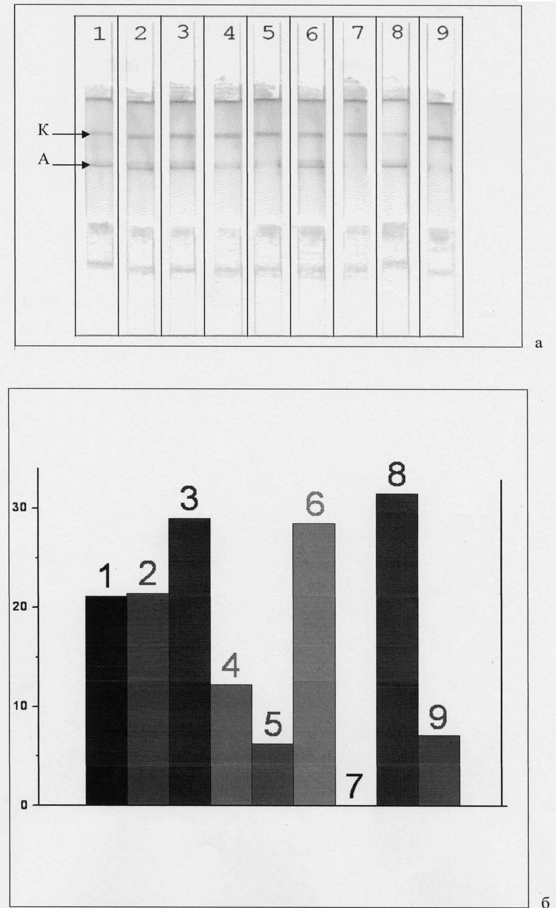 Изобретение относится к иммунологии и медицинской диагностике и представляет собой способ определения антител к возбудителю туберкулеза, основанный на проведении иммунохроматографического анализа. Одной из важных задач, для которых востребовано определение специфических антител, является диагностика туберкулеза (Cegielski J.P., Chin D.P., Espinal M.A., Frieden T.R., Rodriquez Cruz R., Talbot E.A., Weil D.E., Zaieskis R., Raviglione M.C. Infect. Dis. Clin. North. Am. 2002; 16 (I): 1-58; Brewer T.F., Heymann S.J. Arch. Med. Res. 2005; 36 (6): 617-621; Tripathi R.P., Tewari N., Dwivedi N., Tiwari V.K. Med. Res. Rev. 2005; 25 (1):. 93-131; Nair N., Cooreman E.J. Commun. Dis. 2006; 38 (3):. 185-190). По уровню смертности взрослого населения туберкулез занимает первое место среди инфекционных заболеваний. Поскольку туберкулез часто впервые выявляется в запущенных и остро прогрессирующих формах, весьма распространены случаи некурабильных форм болезни, приводящих к смертельному исходу. В условиях интенсивного распространения туберкулеза возрастает значение выявления больных, представляющих эпидемиологическую опасность для окружающих. Правильная и оперативная диагностика позволяет выявить больных на ранних этапах заболевания, а вовремя начатая химиотерапия предотвращает развитие прогрессирующих форм с интенсивной продукцией микобактерий. Наличие в сыворотке крови антител, специфичных к возбудителю определенного заболевания, является эффективным критерием, позволяющим с высокой достоверностью диагностировать соответствующее инфекционное заболевание. Преимуществами данного подхода по сравнению с непосредственным выявлением и идентификацией возбудителя является определенность при выборе тестируемой пробы (сыворотка крови, тогда как возбудитель может на данной стадии инфекции преимущественно локализоваться в самых разных органах и тканях), а также возможность быстрой детекции достаточно высокого уровня антител, индуцированного контактом с антигеном, в то время как для выявления антигена могут потребоваться довольно продолжительные стадии доращивания до достижения им регистрируемой концентрации. Хотя в настоящее время активно используются как микробиологические, так и иммунологические способы диагностики инфекционных заболеваний, для проведения массового первичного скрининга оптимально иммунологическое определение наличия в сыворотке крови специфических антител (серодиагностика), которое может быть реализовано с высокой экспрессностью и производительностью. Особенный интерес вызывают серодиагностические подходы в тех случаях, когда в силу особенностей роста микроорганизмов получение результатов микробиологического тестирования может потребовать значительного времени. Поскольку возбудитель заболевания, Mycobacterium tuberculosis, характеризуется крайне медленной скоростью роста, микробиологическая диагностика может потребовать до 30-40 дней для получения достоверных результатов, тогда как симптоматическая диагностика, особенно на ранних стадиях, крайне затруднена из-за высокой степени вариабельности этиологии заболевания. Эти причины определяют значительный интерес к серодиагностике туберкулеза. Благодаря экспрессности, достаточно высокой чувствительности и специфичности серологические тесты незаменимы при массовых обследованиях. Кроме того, гуморальный иммунный ответ отражает активный инфекционный процесс, и поэтому результаты иммунохимического т