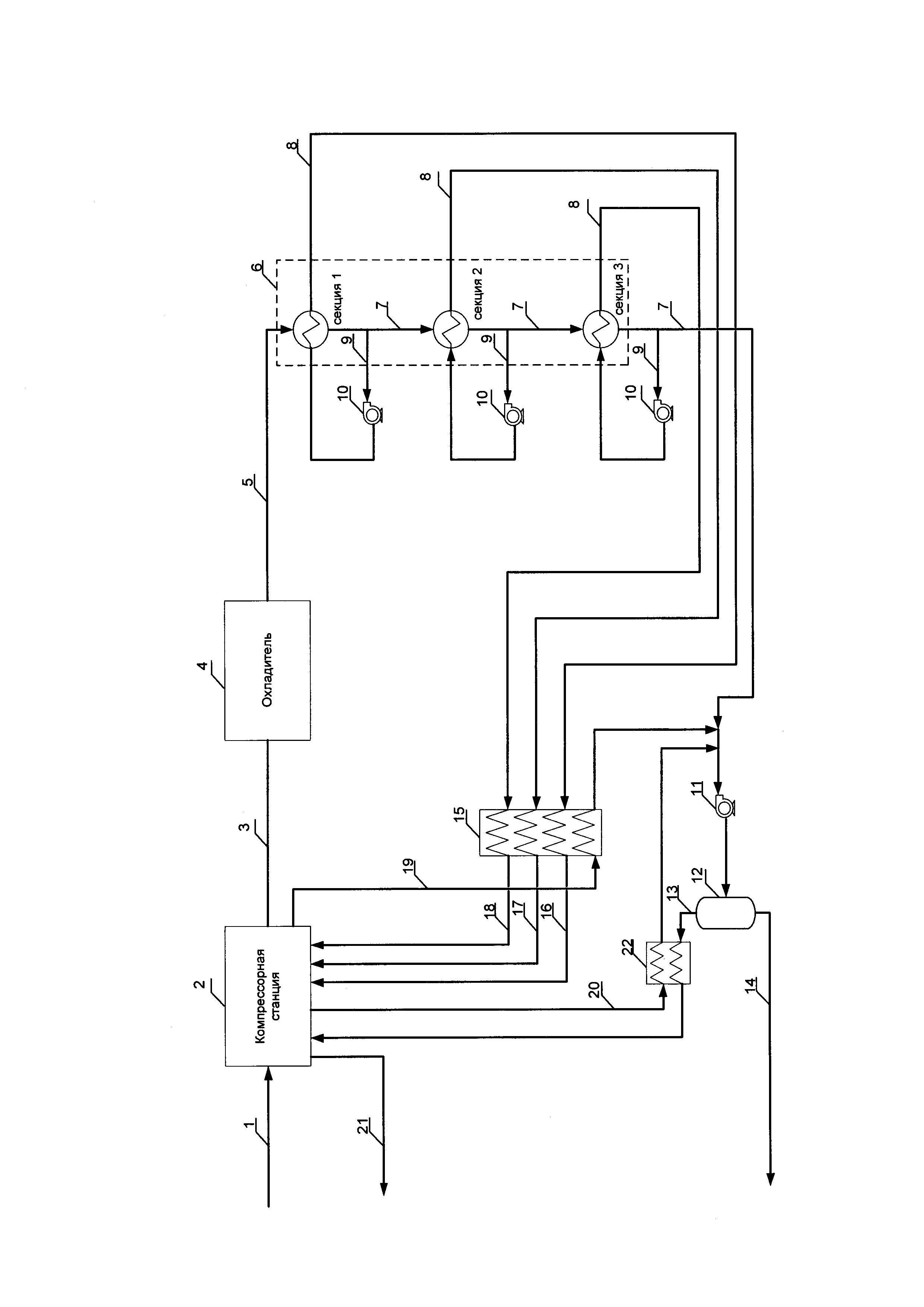 Настоящее изобретение относится к технике и технологии сжижения природного газа и может быть использовано в газовой промышленности для сжижения природного газа на объектах любой производительности. Известно устройство для сжижения потока природного газа (см. патент РФ на изобретение №2443952, F25J 1/02, опуб. 27.02.2012 в бюл. №6), содержащее первую ступень охлаждения, включающую по меньшей мере один теплообменник, выход охлажденного газа из которого соединен со второй ступенью охлаждения, имеющей две криогенные системы охлаждения, каждая из которых включает по меньшей мере один теплообменник, при этом каждый теплообменник криогенной системы охлаждения снабжен выходом сжиженных углеводородов и выходом испаренного хладагента, выход сжиженных углеводородов из криогенной системы охлаждения соединен с испарительным клапаном и далее с сепаратором, снабженным выходом потока сжиженного газа и выходом газообразного потока, соединенным с рекуперативным теплообменником и далее с одним или более компрессором и одним или более охладителем. Недостатком известного устройства являются высокие энергетические затраты на охлаждение газа, вследствие недостаточно эффективного использования холода газообразного потока из сепаратора. Известна установка для сжижения природного газа, описанная в патенте РФ на изобретение №2406949 (F25J 1/00, опуб. 20.12.2010 в бюл. №35), включающая трубопровод подачи подготовленного газа в компрессорную установку, выход скомпримированного газа из которой соединен с охладителем и далее с криогенным теплообменником, имеющим три последовательно расположенных секций охлаждения, каждая из которых снабжена выходом сжиженных углеводородов и выходом испаренного хладагента, кроме того выход сжиженных углеводородов из двух первых секций охлаждения снабжен дополнительным отводом, при этом дополнительный отвод сжиженных углеводородов из первой секции охлаждения соединен через расширительное устройство сначала со второй секцией охлаждения и далее с первой секцией охлаждения, а дополнительный отвод сжиженных углеводородов после второй секции охлаждения соединен через расширительное устройство сначала с третьей секцией охлаждения, затем со второй секцией охлаждения и далее с первой секцией охлаждения, кроме этого, выход сжиженных углеводородов из третьей секции охлаждения соединен с последовательно установленными расширительным устройством, дополнительным теплообменником и дополнительным расширительным устройством и далее с сепаратором, снабженным выходом потока сжиженного газа и выходом газообразного потока, соединенного через дополнительный теплообменник со всеми секциями охлаждения криогенного теплообменника. Недостатком известной установки является недостаточно эффективное использование холода полученного в сепараторе газообразного потока и, как следствие, увеличение энергетических затрат на охлаждение поступающего на установку газа. Кроме того, в результате соединения выхода газообразного потока из сепаратора с несколькими последовательно расположенными секциями криогенного теплообменника потребуется более высокое давление в сепараторе, что снизит выработку сжиженного природного газа. Известна установка сжижения природного газа, описанная в патенте РФ на изобретение №2233411 (F25J 1/00, опуб. 