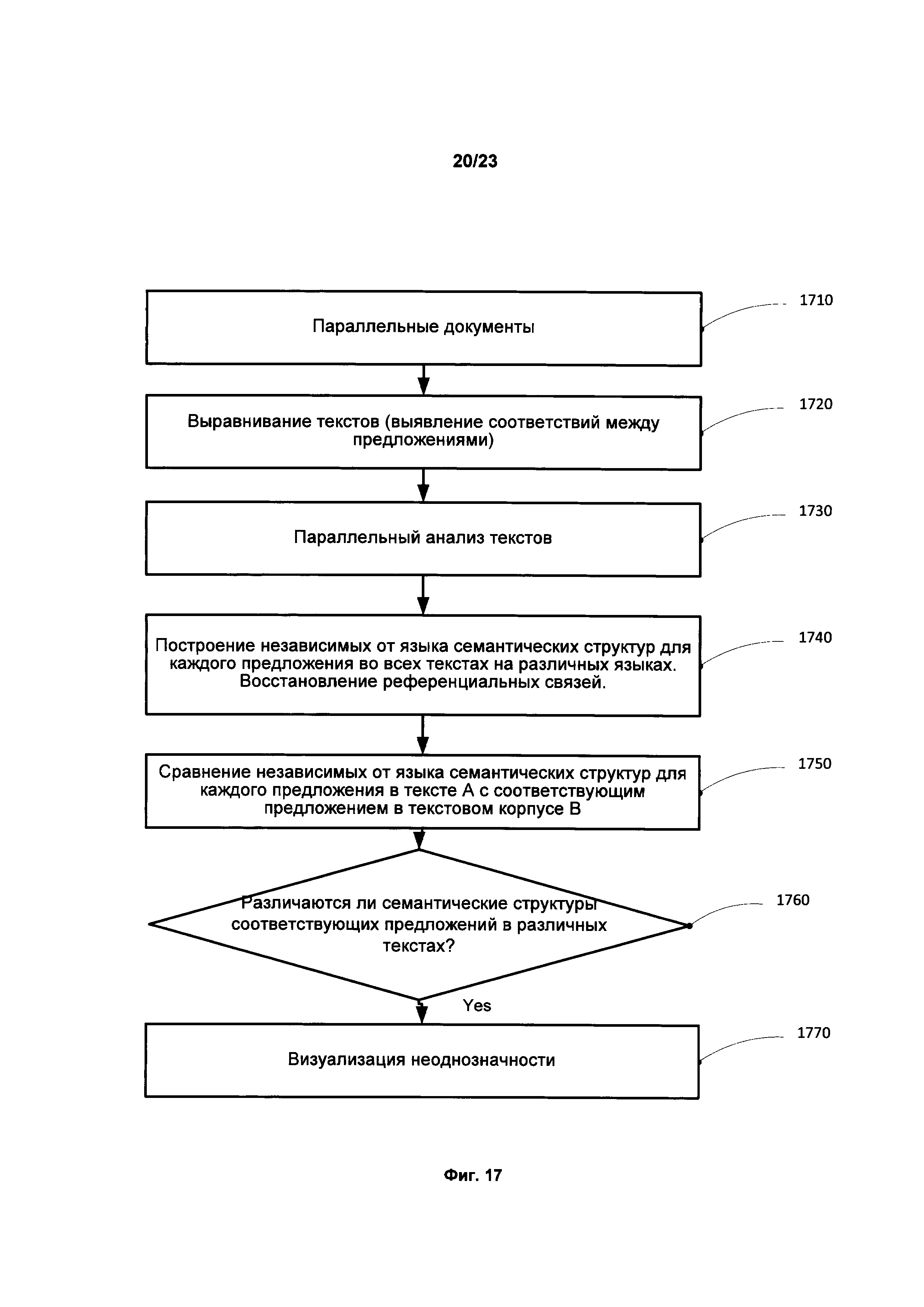 1. Способ обнаружения языковой неоднозначности, включающий: анализ, с использованием одного или нескольких процессоров, предложения первого текста с целью определения синтаксических связей между обобщенными составляющими предложения; построение графа обобщенных составляющих предложения на основе синтаксических связей и лексико-морфологической структуры предложения; анализ графа с целью выявления множества синтаксических структур предложения; присвоение оценок каждой из множества синтаксических структур, описывающих вероятность того, что данная синтаксическая структура является верной гипотезой о полной синтаксической структуре предложения; построение семантических структур, соответствующих синтаксическим структурам; выявление первой и второй семантических структур из множества семантических структур, где первая и вторая семантические структуры представляют собой соответствующие структуры, каждая из которых имеет оценки не ниже порогового значения, и где первая семантическая структура отлична от второй семантической структуры; а также установление семантической неоднозначности в предложении на основе анализа различий между двумя семантическими структурами. 2. Способ по п. 1, в котором семантические структуры представляют смысл исходного предложения и не зависят от языка. 3. Способ по п. 1, дополнительно включающий определение различий между первой и второй семантическими структурами путем сопоставления первого вектора значений, соответствующего первой семантической структуре, и второго вектора значений, соответствующего второй семантической структуре, где каждый вектор значений включает в себя, по меньшей мере: один из семантических классов соответствующей ему семантической структуры; число глубинных позиций, присвоенных обобщенным составляющим в семантической структуре; число недревесных связей, восстановленных в соответствующей семантической структуре, и весовое значение. 4. Способ по п. 1, дополнительно включающий: выравнивание предложения первого текста и предложения второго текста с целью установить взаимосвязи между предложениями первого и второго текста, где второй текст является переводом первого текста на иностранный язык; построение семантических структур, соответствующих предложению второго текста; сравнение семантических структур, соответствующих предложению из первого текста, и семантических структур второго текста с целью определения разницы между семантическими структурами первого текста и семантическими структурами второго текста, а также выявление неоднозначности в предложении из первого текста путем определения разницы между семантической структурой, соответствующей предложению первого текста, и семантической структурой предложения из второго текста. 5. Способ по п. 1, дополнительно включающий визуализацию предложения с помощью пользовательского интерфейса, где визуализация предложения возникает на основе обнаружения семантической неоднозначности текста в предложении. 6. Способ по п. 5, в котором визуализация предложения включает в себя выделение, по крайней мере, одного слова, предложения, фразы или параграфа, в которых обнаружена неоднозначность. 7. Способ по п. 1, дополнительно включающий: синтез перевода предложения и его альтернативного перевода с уч