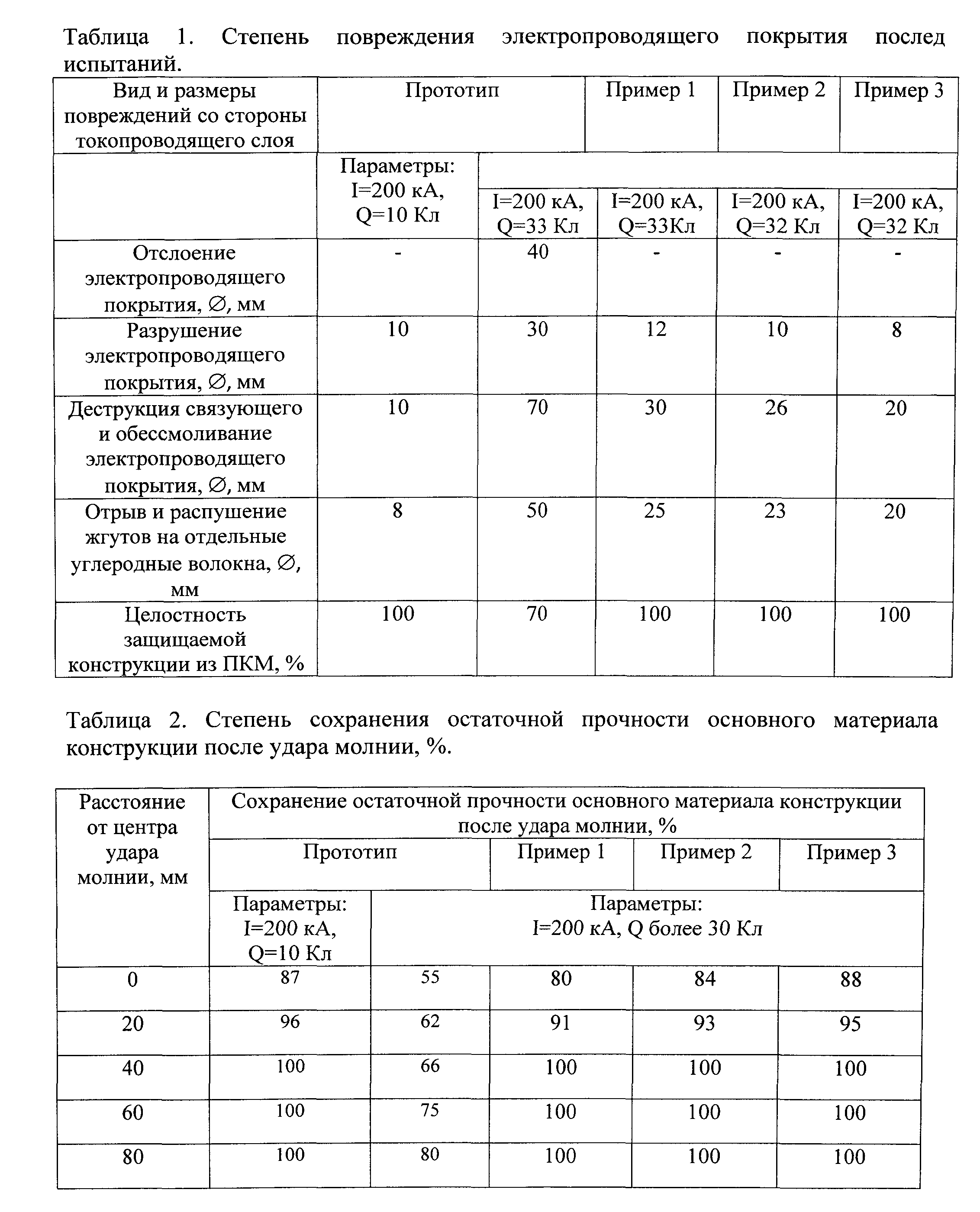 Изобретение относится к области молниезащитных электропроводящих покрытий для конструкций из полимерных композиционных материалов, используемых в авиационной промышленности, и касается многослойного электропроводящего покрытия на основе термостойкого связующего. Содержит по меньшей мере два токопроводящих слоя равнопрочного углеродного наполнителя сатинового или саржевого плетения, по меньшей мере два диэлектрических слоя, чередующиеся с указанными токопроводящими слоями. Токопроводящие слои имеют электросопротивление не более 10 Ом. Диэлектрические слои содержат эпоксидное или цианэфирное связующее с температурой стеклования 200-280°C и температурой начала деструкции 320-420°C и частицы размером не более 100 нм, содержащие углеродную фазу. Электропроводящее покрытие имеет следующее соотношение компонентов, мас.%: углеродный наполнитель 55-66, эпоксидное или цианэфирное связующее 33,95-42, частицы, содержащие углеродную фазу 0,05-3. Изобретение обеспечивает сохранение на высоком уровне остаточной прочности основного материала конструкции из ПКМ в эпицентре удара молнии с силой тока 200 кА и переносимым зарядом Q более 30 Кл, повышение стойкости покрытия к динамическим и тепловым нагрузкам вследствие воздействия молниевого разряда, а именно: отсутствие отслоения электропроводящего покрытия от основного материала конструкции, уменьшение диаметра деструкции связующего и обессмоливания верхнего слоя электропроводящего покрытия, уменьшение диаметра распушения жгутов на отдельные углеродные волокна электропроводящего покрытия. 4 з.п. ф-лы, 2 табл., 3 пр.