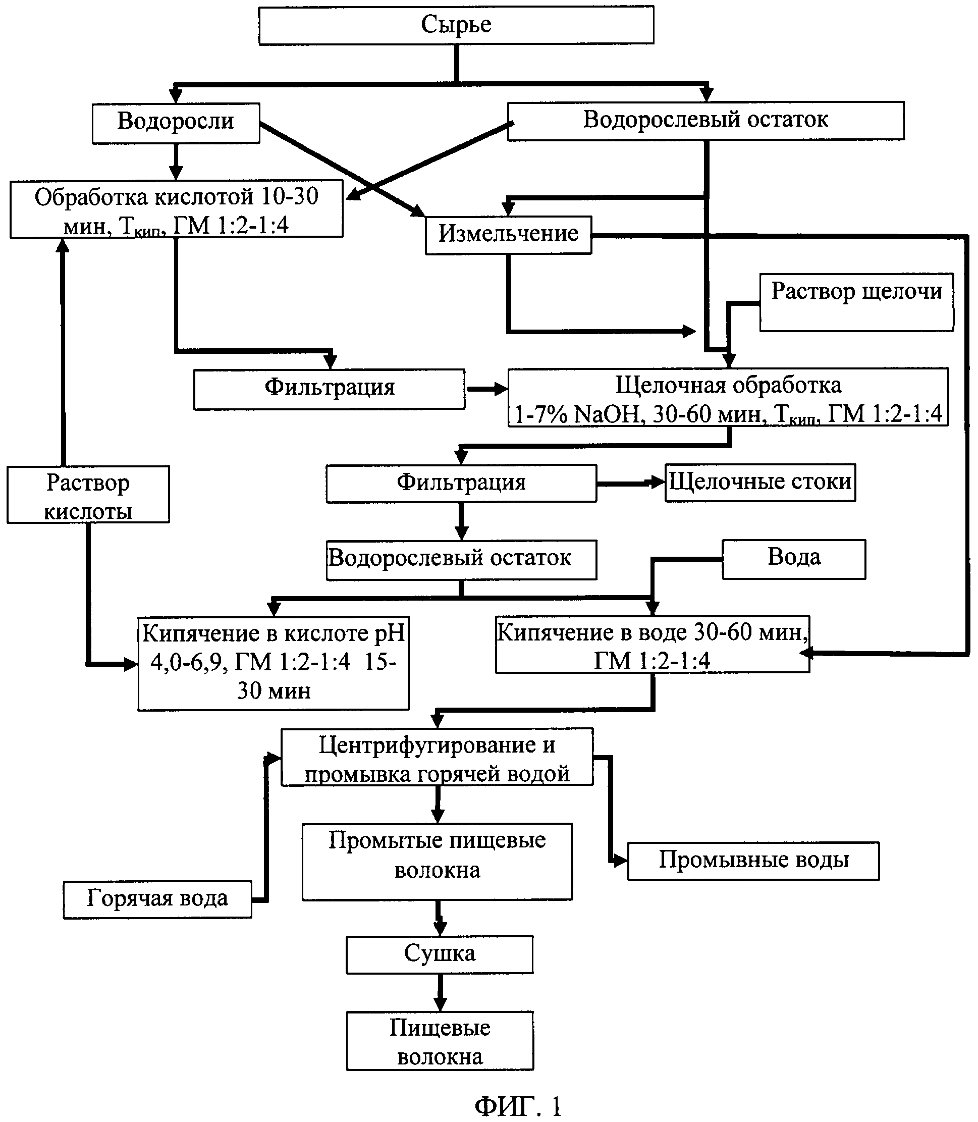 Изобретение относится к пищевой промышленности. Способ предусматривает использование в качестве сырья красных водорослей или водорослевых остатков после получения агара. Сырье обрабатывают 1-7%-ным раствором щелочи в течение 30-60 мин при гидромодуле 1:2-1:4, фильтруют, подвергают кипячению в воде в течение 30-60 мин при гидромодуле 1:2-1:4 или обрабатывают в растворе кислоты при pH 4,0-6,9 и гидромодуле 1:2-1:4 в течение 15-30 мин. Полученные волокна одновременно центрифугируют и промывают горячей водой с последующей сушкой до остаточного содержания влаги 8-10% в готовом продукте. Изобретение позволяет получить пищевые волокна с выходом до 40%, с содержанием полисахаридов, в том числе клетчатки, не менее 80% и белка не более 20%, со степенью набухаемости 50-350%. 5 пр., 1 ил.
