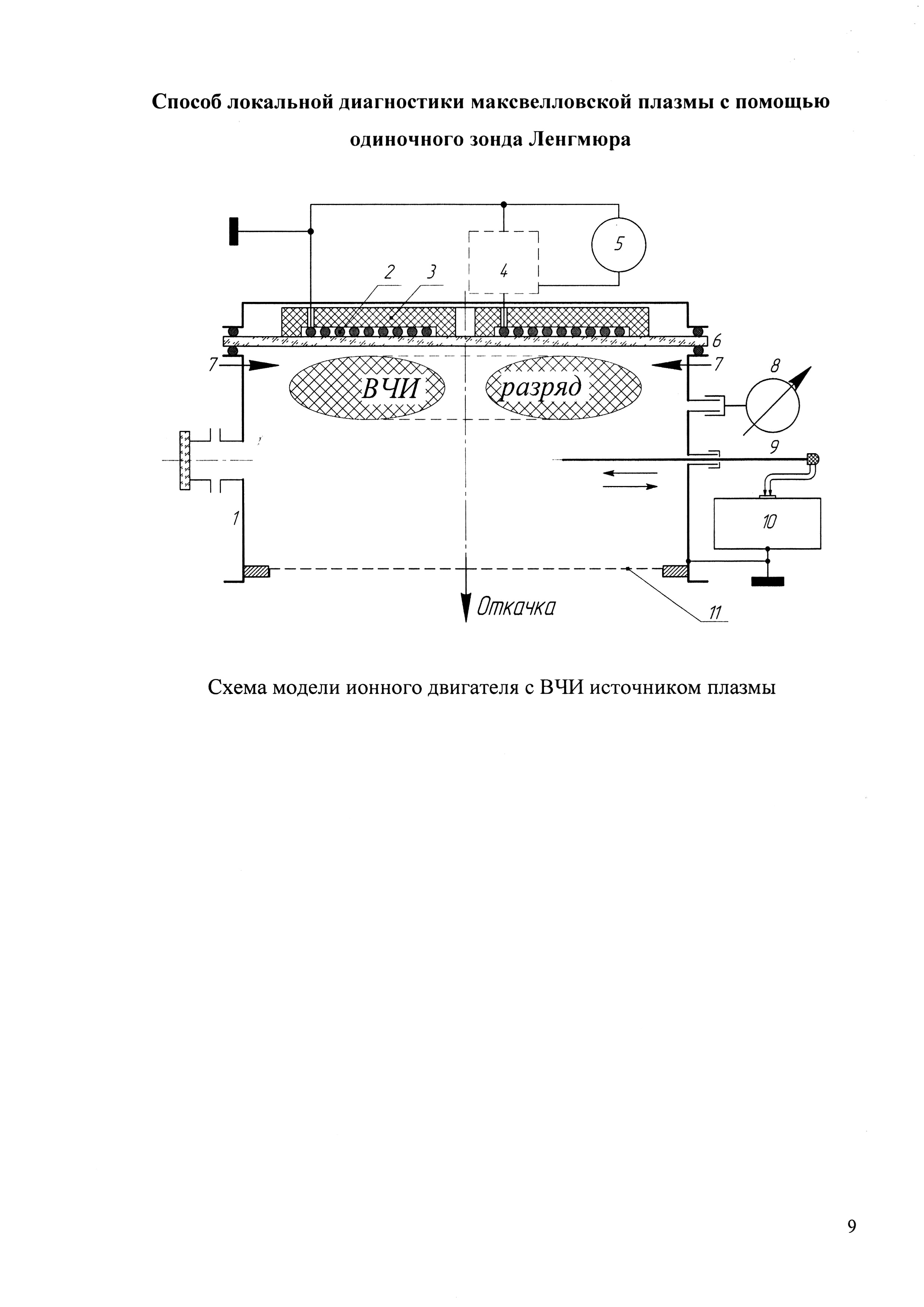 1. Способ локальной диагностики максвелловской плазмы с помощью одиночного цилиндрического зонда Ленгмюра путем введения в газоразрядное пространство тонкого зондодержателя с зондом на конце в виде отрезка металлической нити, подключенной через источник зондового напряжения к металлическому корпусу газоразрядного устройства или дополнительному опорному электроду с принятием мер по защите зондовой цепи от электрических наводок и по очистке собирающей поверхности зонда, регистрации его вольт-амперной характеристики изменением зондового напряжения в обе стороны от плавающего потенциала и определения функции распределения электронов по энергиям, концентрации электронов, их температуры и потенциала плазмы обработкой зондовой характеристики одним из известных методов, отличающийся тем, что, в случае близости измеренного распределения электронов по энергиям к функции Максвелла, находят плотность тока ионов на зонд под плавающим потенциалом jif по соответствующей потенциалу плазмы плотности электронного тока насыщения на зонд jes, используя формулу Больцмана jif=jes⋅exp(-ΔVf/Te), где ΔVf - разность между потенциалом плазмы и плавающим потенциалом зонда, Tе, В - температура электронов, полученную величину jif выражают двояким образом: а) через уравнение Бома jif=CБЦил⋅(R/ 2. Способ по п. 1, отличающийся тем, что при несоответствии реального зондового слоя модели Чайлда-Ленгмюра-Богуславского, исключающей проникновение электронов в зондовый слой, внешний радиус R зондового слоя корректируют по модели зондового слоя, допускающей такое проникновение, например, согласно «ступенчато-фронтальной» модели величину R находят из выражения RСФ=0,692⋅R+0,3816⋅