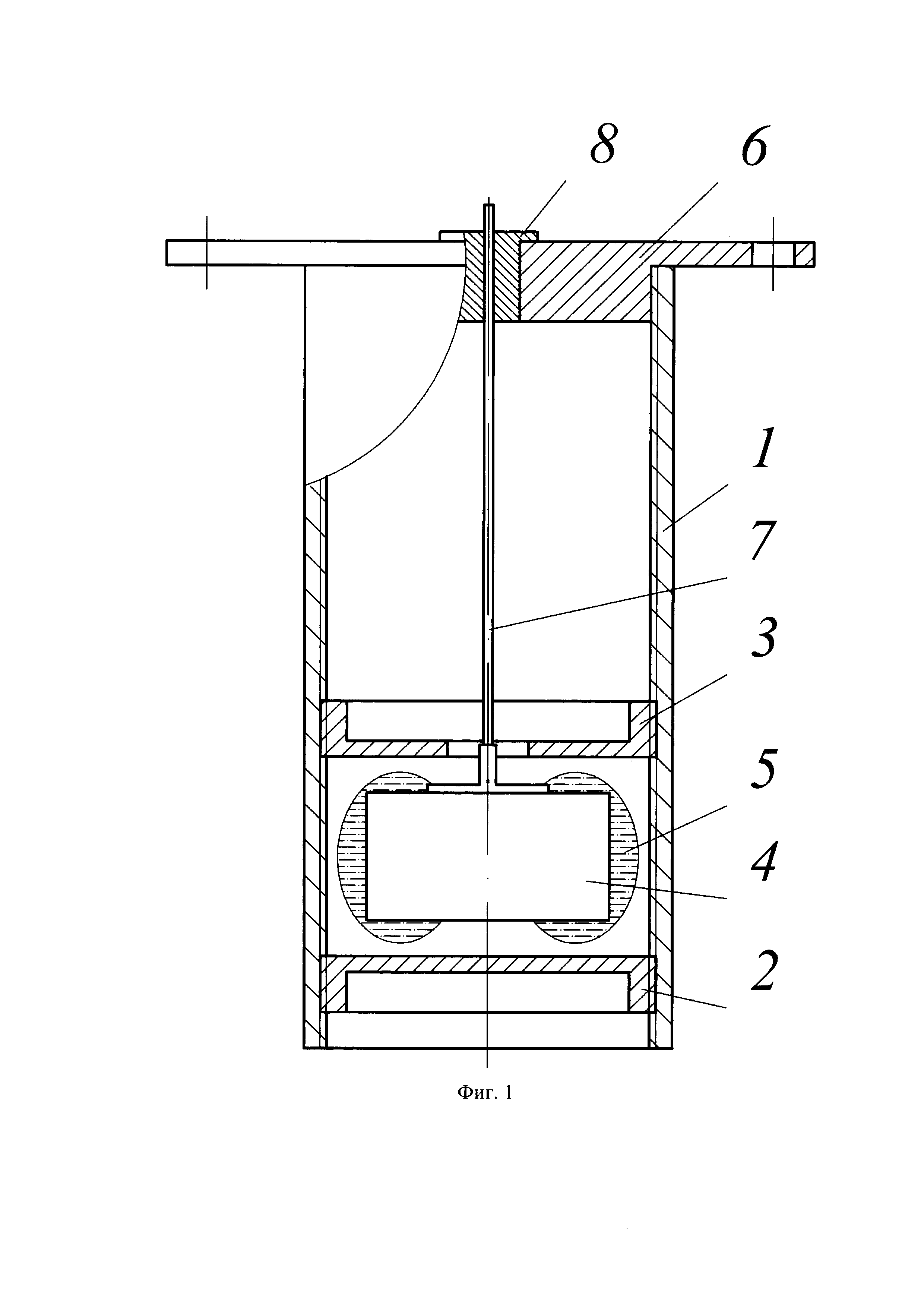Изобретение относится к средствам гашения колебаний упругих элементов конструкции космических аппаратов (КА) (штанг, антенн и т.д.) для обеспечения функционирования прецизионной аппаратуры и снижения уровней вибронагрузок на ней и КА в целом. Магнитожидкостный виброгаситель представляет собой комбинацию динамического гасителя и вязкого демпфера. Он присоединяется к конструкции в точке, в которой проявляются наибольшие уровни колебаний, т.е. на конце штанги, либо встраивается как переходной элемент. Известно устройство для защиты аппаратуры от ударов и вибрации - амортизатор (патент на изобретение RU №2002139, МПК: F16F 6/00, опубл. 30.10.1993 г.), содержащий цилиндрический корпус и поршень, с закрепленными на нем постоянными магнитами, образующий рабочий зазор с корпусом и магнитную рабочую среду (ферромагнитную жидкость), заполняющую полость корпуса. Амортизатор снабжен дополнительными постоянными магнитами, размещенными на внутренней поверхности корпуса; постоянные магниты на корпусе и поршне выполнены в виде секций, установленных с зазором, заполненным немагнитным материалом. Недостатками данной конструкции являются сравнительно высокая масса и гашение вибраций только в одном направлении (вдоль продольной оси амортизатора). Наиболее близким по технической сущности к предложенному является устройство для гашения низкочастотных вибраций, содержащее корпус из немагнитного материала и размещенные в полости корпуса магнитную рабочую среду и погруженный в нее постоянный магнит (патент на полезную модель RU №144547, МПК: F16F 9/53, F16F 6/00, от 10.04.2014 г.). Недостатками данной конструкции является невозможность выполнения подстройки упругих и диссипативных характеристик виброгасителя к конкретной конструкции после его изготовления, а также работа только в низкочастотных диапазонах (до 10 Гц). Изобретение направлено на достижение технического результата, заключающегося в возможности настройки рациональных частот работы динамического гасителя и характеристик гасителя после его изготовления (в процессе проведения испытаний космической техники и эксплуатации на наземных объектах техники). Предлагаемый магнитожидкостный виброгаситель, как и известное, взятое за прототип устройство, содержит корпус из немагнитного материала и размещенные в полости корпуса магнитную рабочую среду и погруженный в нее постоянный магнит. Для достижения указанного технического результата в предлагаемом магнитожидкостном виброгасителе, в отличие от наиболее близкого к нему известного устройства, корпус выполнен в виде полого цилиндра, вдоль всей внутренней поверхности которого выполнена резьба, при этом с одного торца корпуса ввинчена глухая крышка, а с другого торца смонтирован фланец с центральным отверстием и выполненными по периферии крепежными отверстиями, кроме того, в полости корпуса ввинчена вторая крышка с центральным отверстием, сквозь которое пропущен упругий стержень, один конец которого жестко соединен с постоянным магнитом, размещенным вместе с магнитной рабочей средой в полости, образованной между двумя указанными крышками, а второй конец стержня пропущен через центральное отверстие фланца и закреплен на его внешней стороне, с возможностью регулирования длины стержня. Регулируемая длина упругого стержня, на котором закреплен 