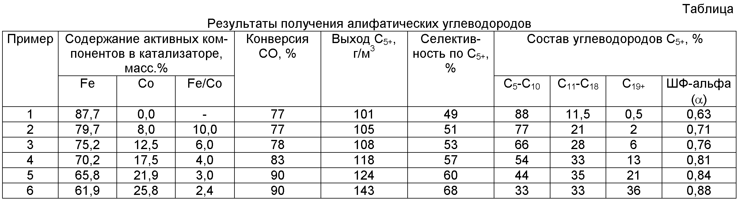 Использование: нефтехимия, газохимия, углехимия, производство синтетических моторных топлив и смазочных масел. Описан катализатор для получения алифатических углеводородов из оксида углерода СО и водорода, содержащий наноразмерные частицы железа, промотированные оксидами калия и алюминия, сформированный in situ непосредственно в зоне реакции в процессе термообработки компонентов катализатора в токе водорода или оксида углерода, причем он дополнительно содержит наноразмерные частицы кобальта и имеет следующий состав, % масс.: K2O - 2-9, Аl2О3 - 1-8, Со - 1-50, Fe - остальное. Описан также способ получения алифатических углеводородов из оксида углерода и водорода в трехфазном реакторе при температуре 200-350°С и давлении 20-30 атм в присутствии описанного выше катализатора при использовании в качестве жидкой фазы парафина или тяжелых углеводородов. Технический эффект - увеличение селективности по отношению к целевым углеводородам С5+, образование более тяжелых углеводородов с α=0,70-0,88. 2 н. и 3 з.п. ф-лы, 1 табл., 7 пр., 1 ил.