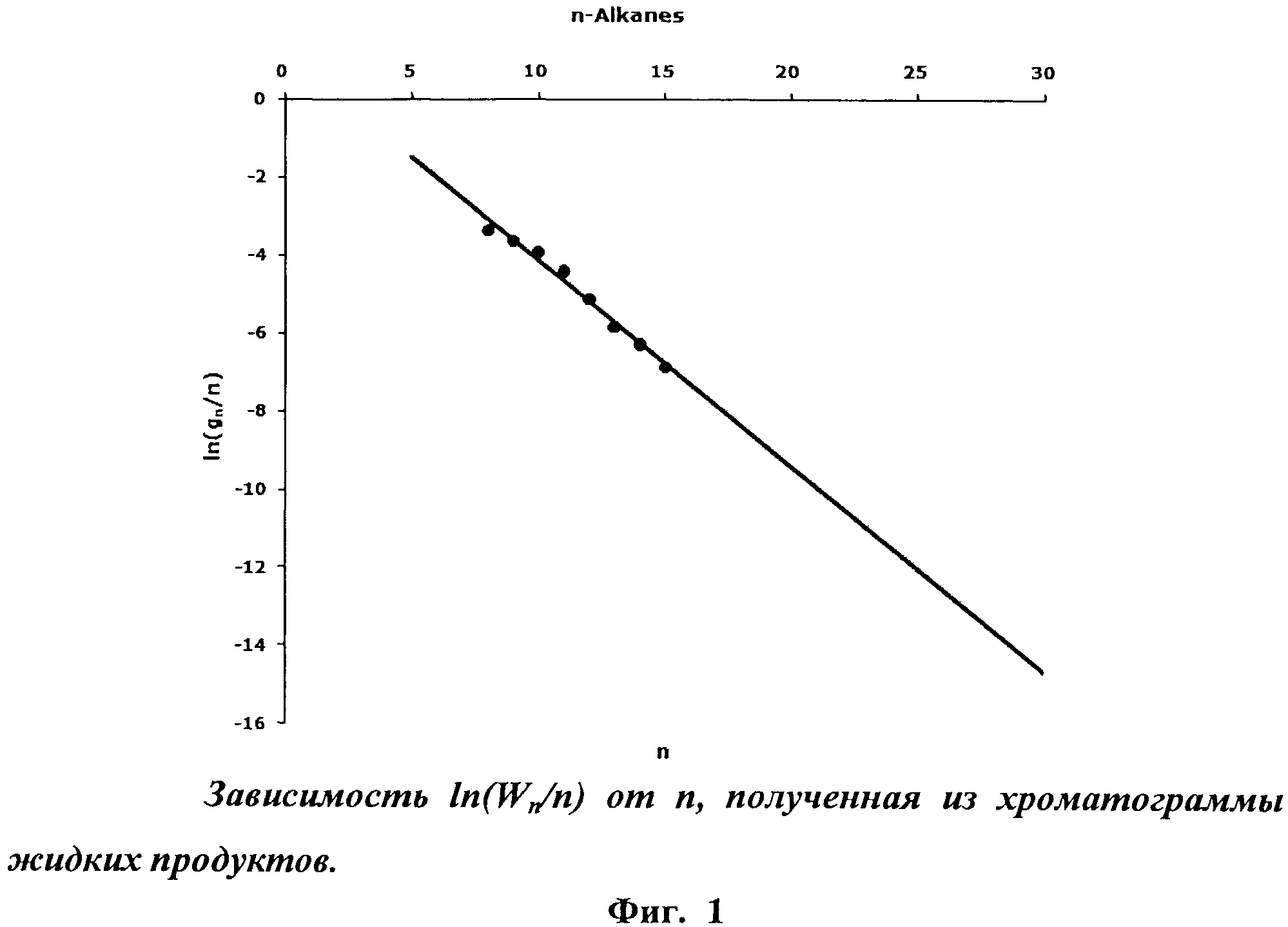 Изобретение относится к нефтехимической промышленности, а именно к способам получения алифатических углеводородов из оксида углерода и водорода, и может быть использовано в нефтепереработке, нефтехимии, газохимии, углехимии. Смеси алифатических углеводородов, содержащих 5 и более атомов углерода (С5+), являются ценными полупродуктами для производства компонентов моторных топлив и смазочных масел, которые выделяют из этих смесей посредством дистилляции. Кроме того, твердые углеводороды (воски) находят применение в качестве составляющих сплавов для точного литья, компонентов парфюмерных и косметических композиций. При их гидрировании и гидроизомеризации могут быть получены качественное дизельное топливо, реактивный керосин и смазочные масла. Традиционным методом получения углеводородов, в том числе и алифатических, является переработка нефти - основного природного сырья для производства этих продуктов. Однако в последние годы все больший интерес приобретают методы получения углеводородов различных групп из альтернативного сырья - угля, природного и попутного нефтяного газа, биомассы различного происхождения. Подобные технологии известны из уровня техники и включают, как правило, две основные стадии: - получение смеси оксида углерода и водорода, называемой синтез-газом; - последующее получение углеводородов из синтез-газа способом, известным как синтез Фишера-Тропша. Из этих стадий вторая является основной, поскольку именно она определяет выход и состав целевых продуктов. Синтез углеводородов из СО и Н2 (синтез Фишера-Тропша) относится к числу довольно редко встречающихся гетерогенно-каталитических реакций полимеризации. Рост углеводородной цепи в этой реакции осуществляется за счет последовательного присоединения СН2- или СНОН-групп, образующихся из СО и Н2 на поверхности катализатора. Продуктом реакции является широкая смесь газообразных (C1-C4), жидких (C5-C18) и твердых (C19+) углеводородов. Общий выход углеводородов и их групповой и фракционный состав определяются катализатором. Катализаторы, которые подходят для проведения этой реакции, содержат, как правило, один или несколько каталитически активных переходных металлов VIII группы Периодической системы элементов, нанесенных на оксидные носители, такие как Аl2О3, SiO2, TiO2 и т.д. В частности, железо, кобальт, никель и рутений хорошо известны как активные металлы для такого катализатора. В предположении, что вероятность роста и обрыва цепи не зависит от ее длины, молекулярно-массовый состав продуктов синтеза Фишера-Тропша может быть определен из уравнения Андерсона-Шульца-Флори: Wn=n(1-α)2αn-1, где Wn - весовая доля углеводорода, содержащего n атомов углерода, а α (ШФ-альфа) - величина, отражающая вероятность роста цепи. Величину α (ШФ-альфа) обычно определяют из полулогарифмической зависимости ln(Wn/n) от n, полученной из хроматограммы жидких продуктов, которая представляет собой прямую линию (см. фиг.1). Подставляя величину α(ШФ-альфа) и значения n в уравнение Андерсона-Шульца-Флори, можно рассчитать полное молекулярно-массовое распределение углеводородов, то есть определить количество всех отдельных углеводородов и фракций продуктов, которые образуются из СО и Н2. По величине показателя α(ШФ-альфа) оценивают способность катализаторов к осуществлению полимеризации: чем больше