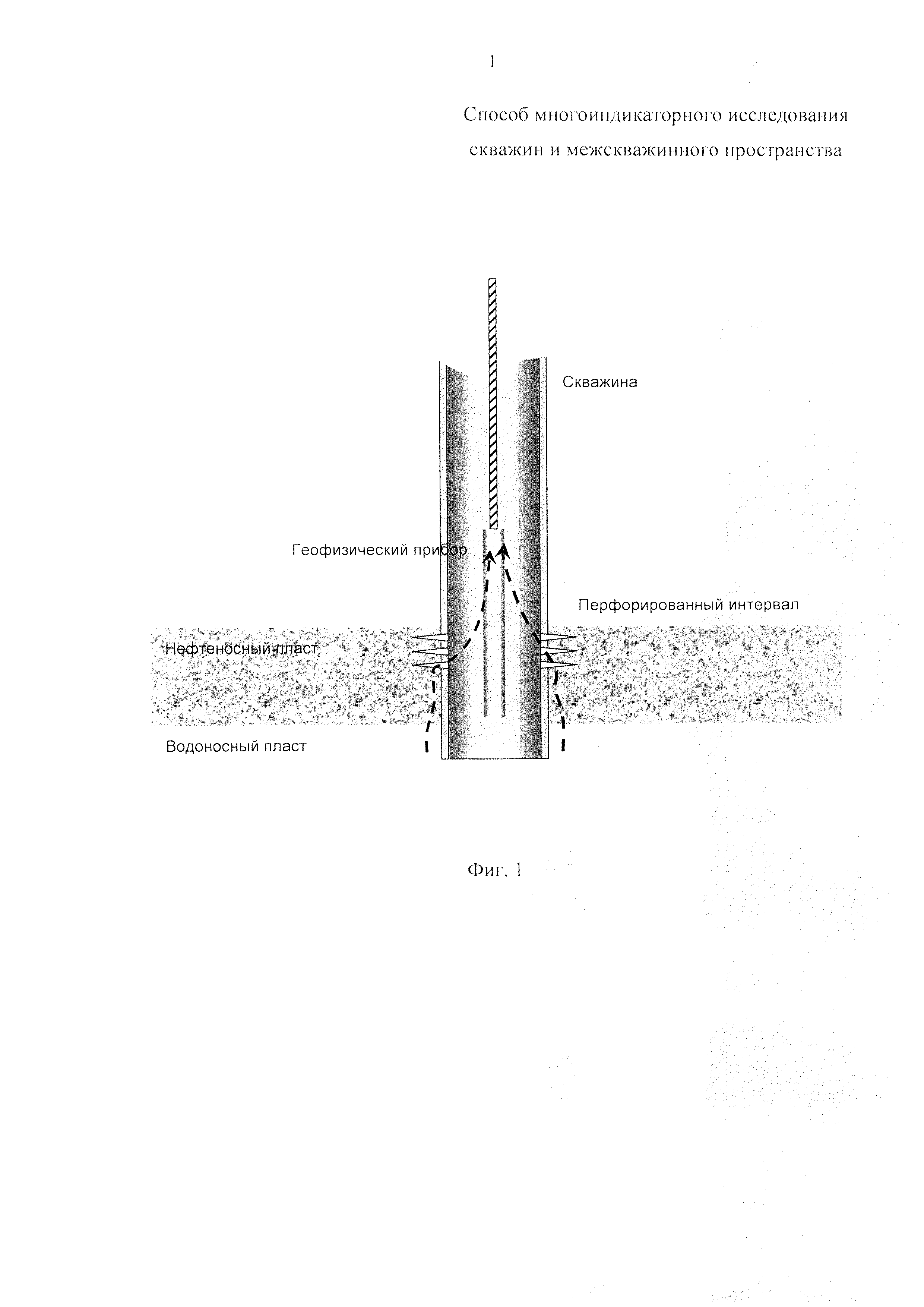 1. Способ индикаторного исследования скважин и межскважинного пространства, содержащий этапы, на которых: 2. Способ по п. 1, отличающийся тем, что осуществляют первичную обработку результатов анализа проб воды на содержание индикатора следующим образом: 3. Способ по п. 2, отличающийся тем, что по виду графической зависимости «концентрация индикатора - время» определяют тип коллектора и наличие трещиноватости. 4. Способ по п. 2, отличающийся тем, что на графике «концентрация индикатора - время» с помощью сглаживания значений изменения концентрации и массы индикатора объединяют пики концентраций индикатора в объемные пути фильтрации, и определяют сглаженное значение концентрации индикатора Ciсгл. выражением 5. Способ по п. 1, отличающийся тем, что осуществляют первичную обработку результатов измерений для каждого из используемых индикаторов, а именно: 6. Способ по п. 5, отличающийся тем, что массовую долю Mi каждого из индикаторов, поступившую из i-й добывающей скважины на поверхность за j-е сутки, определяют по формуле 7. Способ по п. 1, отличающийся тем, что проводят количественную интерпретацию данных индикаторных исследований. 8. Способ по п. 1, отличающийся тем, что по наличию в продукции контрольных добывающих скважин индикатора гидродинамическую связь между скважинами, пластами считают установленной. 9. Способ по п. 8, отличающийся тем, что в случае отсутствия индикатора в течение расчетного времени подхода основного фронта меченой жидкости производят контрольный отбор проб в течение 90-120 суток с периодичностью один раз в 15-20 суток. 10. Способ по п. 8, отличающийся тем, что в случае отсутствия индикатора в контрольном отборе проб делают вывод об отсутствии гидродинамической связи между контрольными нагнетательными и добывающими скважинами и пластами. 11. Способ по п. 1, отличающийся тем, что 12. Способ по п. 1, отличающийся тем, что по регистрации индикатора в продукции скважин через несколько суток после закачки и высокой концентрации индикатора в попутно добываемой воде, разбавление которой составляет порядка 103 г/л и выше от исходного значения, судят о наличии высокопроницаемых путей фильтрации. 13. Способ по п. 1, отличающийся тем, что по результатам исследований определяют суммарную массовую долю индикатора Mi, поступившую в данную i-ю добывающую скважину с высокими скоростями. 14. Способ по пп. 11 и 13, отличающийся тем, что по коэффициенту Кi для ВПФ добывающей скважины определяют ее производительность, а по величине массовой доли индикатора судят об обводненности скважины. 15. Способ по п. 1, отличающийся тем, что определяют динамическую проницаемость каждого ВПФ для каждой контрольной добывающей скважины ki, м2: 16. Способ по п. 1, отличающийся тем, что определяют эффективный объем каждого ВПФ для каждой контрольной добывающей скважины Vj,i, м3: 17. Способ по п. 1, отличающийся тем, что значения проницаемости ВПФ и их производительность для закачиваемой воды используют при создании гидродинамической модели для разработки нефтяного месторождения. 18. Способ по п. 1, отличающийся тем, что определяют поровый объем пласта, охваченного активной фильтрацией закачиваемой воды, с помощью выражения 19. Способ по п. 1, отличающийся тем, что определение текущего заводненного объема скважины зависит от определения объемов закачки и отборов попутно добываемо