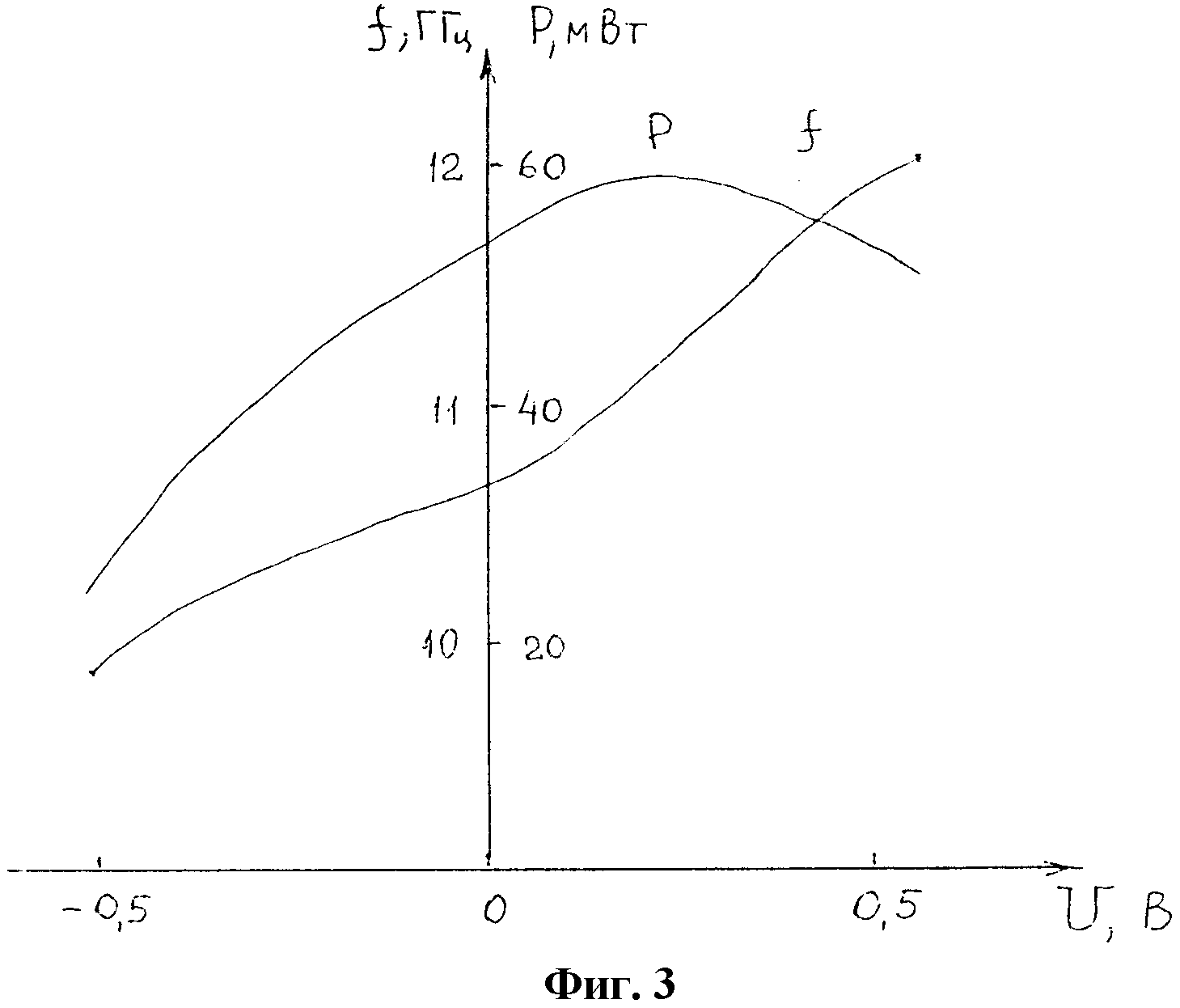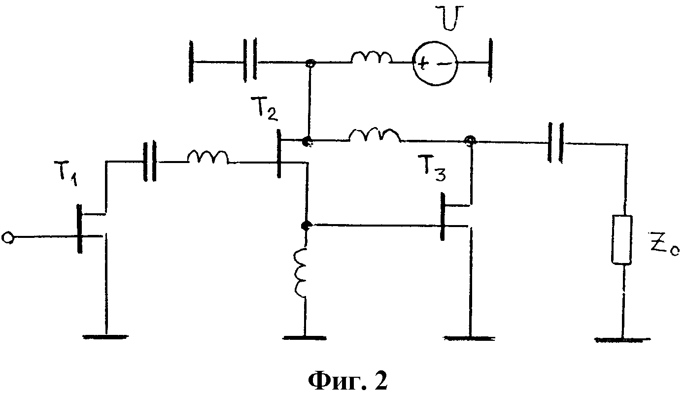 Генератор управляемый напряжением, содержащий линию передачи на выходе, два полевых транзистора с барьером Шотки, колебательную систему в виде последовательно соединенных индуктивности и емкости, при этом один конец колебательной системы соединен с затвором второго полевого транзистора с барьером Шотки, а другой - со стоком первого полевого транзистора с барьером Шотки, исток которого заземлен, на его затвор подают управляющее напряжение, на сток второго полевого транзистора с барьером Шотки подают постоянное напряжение положительной полярности, отличающийся тем, что в генератор дополнительно введены полевой транзистор с барьером Шотки - третий, две индуктивности - вторая и третья, разделительный конденсатор и низкочастотный фильтр питания, при этом сток третьего полевого транзистора с барьером Шотки соединен с линией передачи на выходе через разделительный конденсатор и одновременно - со стоком второго полевого транзистора с барьером Шотки через вторую индуктивность, затвор третьего полевого транзистора с барьером Шотки соединен с истоком второго полевого транзистора с барьером Шотки, и их общая точка соединения заземлена через третью индуктивность, исток третьего полевого транзистора с барьером Шотки заземлен, а на сток второго полевого транзистора с барьером Шотки подают постоянное напряжение положительной полярности через низкочастотный фильтр питания, при этом величина третьей индуктивности в пять раз меньше величины второй индуктивности, а величину емкости разделительного конденсатора определяют из выражения: