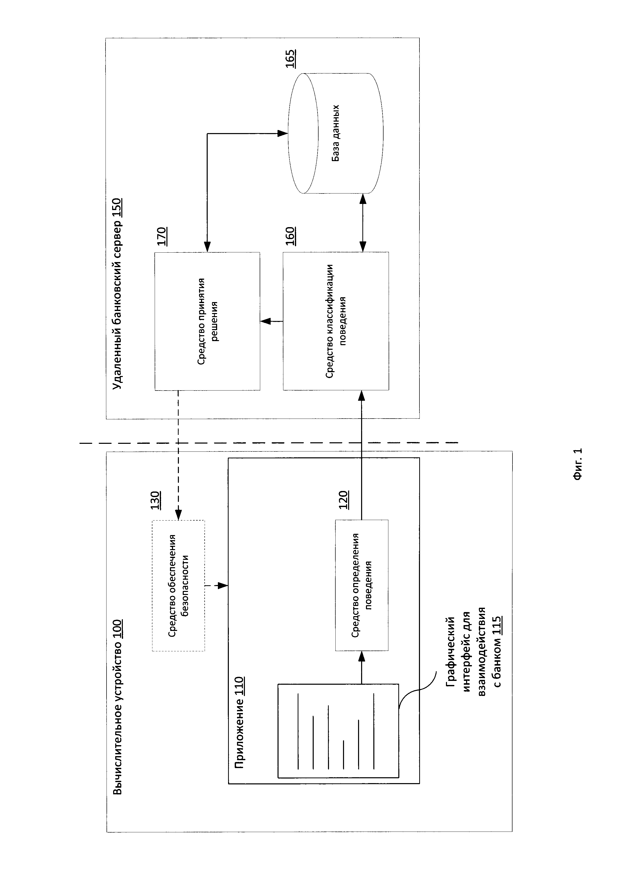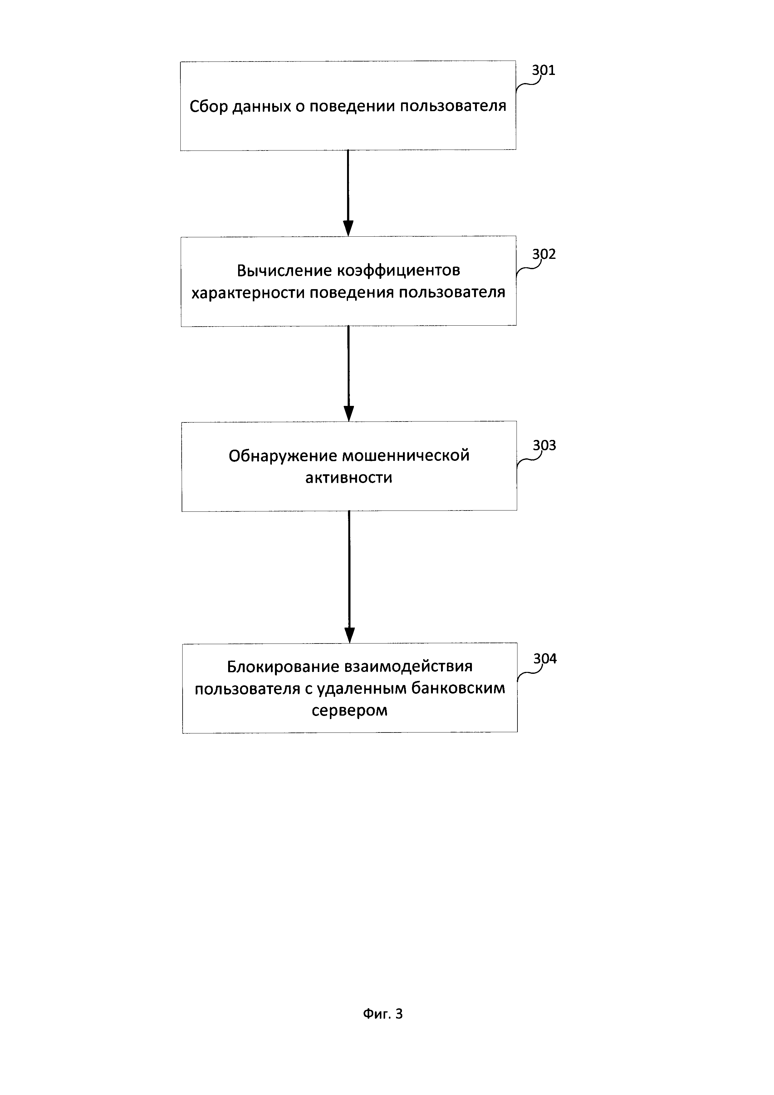 1. Способ обнаружения вредоносного приложения на устройстве пользователя при взаимодействии вычислительного устройства пользователя с удаленным банковским сервером, в котором: собирают при помощи средства определения поведения данные о поведении пользователя во время взаимодействия пользователя с по меньшей мере одной группой элементов графического интерфейса приложения, которые используются для взаимодействия с удаленным банковским сервером; при этом целью взаимодействия с удаленным банковским сервером является осуществление транзакции с участием удаленного банковского сервера; при этом данными о поведении пользователя является информация, которую получают при помощи по меньшей мере устройств ввода вычислительного устройства; собирают при помощи средства обеспечения безопасности информацию о том, какие приложения вычислительного устройства осуществляют доступ к данным о поведении пользователя при взаимодействии пользователя с каждой группой элементов графического интерфейса для взаимодействия с удаленным банковским сервером, для которой на этапе ранее собирают данные о поведении пользователя; вычисляют при помощи средства классификации поведения коэффициент аномальности поведения пользователя для каждой группы элементов графического интерфейса, данные о поведении пользователя во время взаимодействия с которой были собраны на этапе ранее; при этом коэффициент аномальности поведения пользователя представляет собой численное значение, чем больше которое, тем менее характерно поведение, данные о котором были собраны на этапе ранее, упомянутому пользователю; обнаруживают при помощи средства принятия решения мошенническую активность при взаимодействии устройства пользователя с удаленным банковским сервером, если комбинация коэффициентов аномальности поведения пользователя, вычисленных на этапе ранее, превышает установленное пороговое значение; при этом при вычислении комбинации коэффициентов аномальности поведения пользователя используется следующая информация: для группы элементов графического интерфейса: число обращений пользователей к группе элементов графического интерфейса; количество групп элементов графического интерфейса, при взаимодействии с которыми пользователь может получить доступ к упомянутой группе элементов графического интерфейса; количество элементарных действий пользователя, необходимых для осуществления транзакции с участием удаленного банковского сервера, при условии взаимодействия пользователя с упомянутой группой элементов графического интерфейса; количество заведомо известных случаев мошеннической активности, осуществляемой от лица пользователя за установленный промежуток времени; при этом под элементарным действием понимают по меньшей мере: перемещение указателя мыши, нажатие клавиши устройства ввода, движение пальца человека или стилуса по экрану вычислительного устройства без отрыва от поверхности экрана, прикосновение пальца человека или стилуса к экрану вычислительного устройства; при этом под мошеннической активностью понимают взаимодействие с удаленным банковским сервером, осуществляемое с использованием устройства пользователя или учетной записи для осуществления упомянутого взаимодействия, принадлежащей пользователю