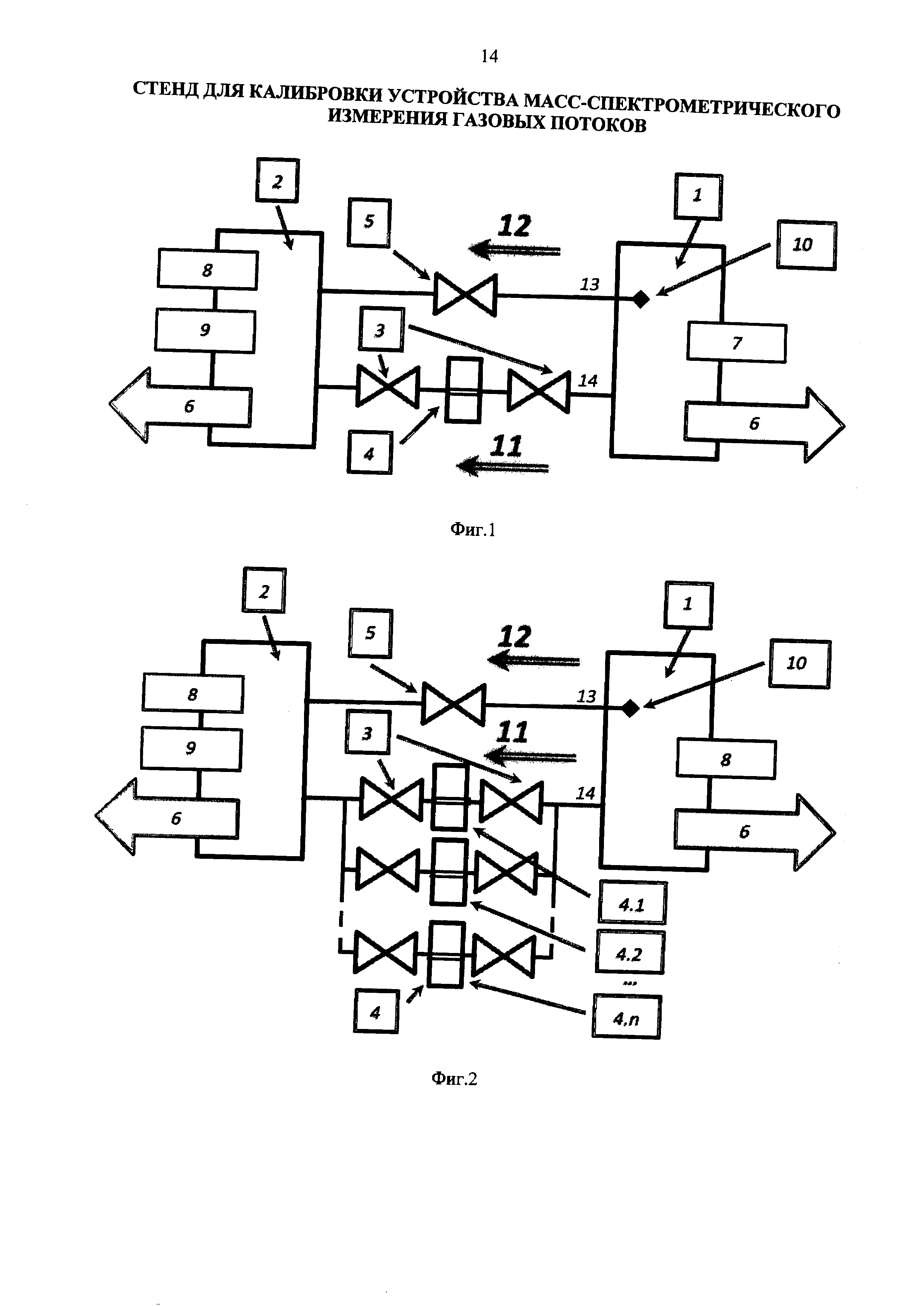 1. Стенд для калибровки устройства масс-спектрометрического измерения газовых потоков, содержащего камеру напуска газа, соединенную с датчиком давления, не чувствительным к роду газа, камеру регистрации газового потока, соединенную с масс-спектрометром и комбинированным полнодиапазонным датчиком давления газа, системы вакуумной откачки камер, камеры напуска газа и регистрации газового потока соединены магистралью с вентилем, при этом на конце магистрали, введенном в камеру напуска газа, установлена газопроницаемая мембрана, кроме того, камеры напуска газа и регистрации газового потока соединены по крайней мере одной магистралью с двумя вентилями, между которыми установлена калиброванная течь, проходное сечение d которой обеспечивает молекулярный режим течения газового потока. 2. Стенд по п. 1, отличающийся тем, что число магистралей с калиброванными течами равно n, при этом dn/dn-1 лежит в диапазоне 10-30.
