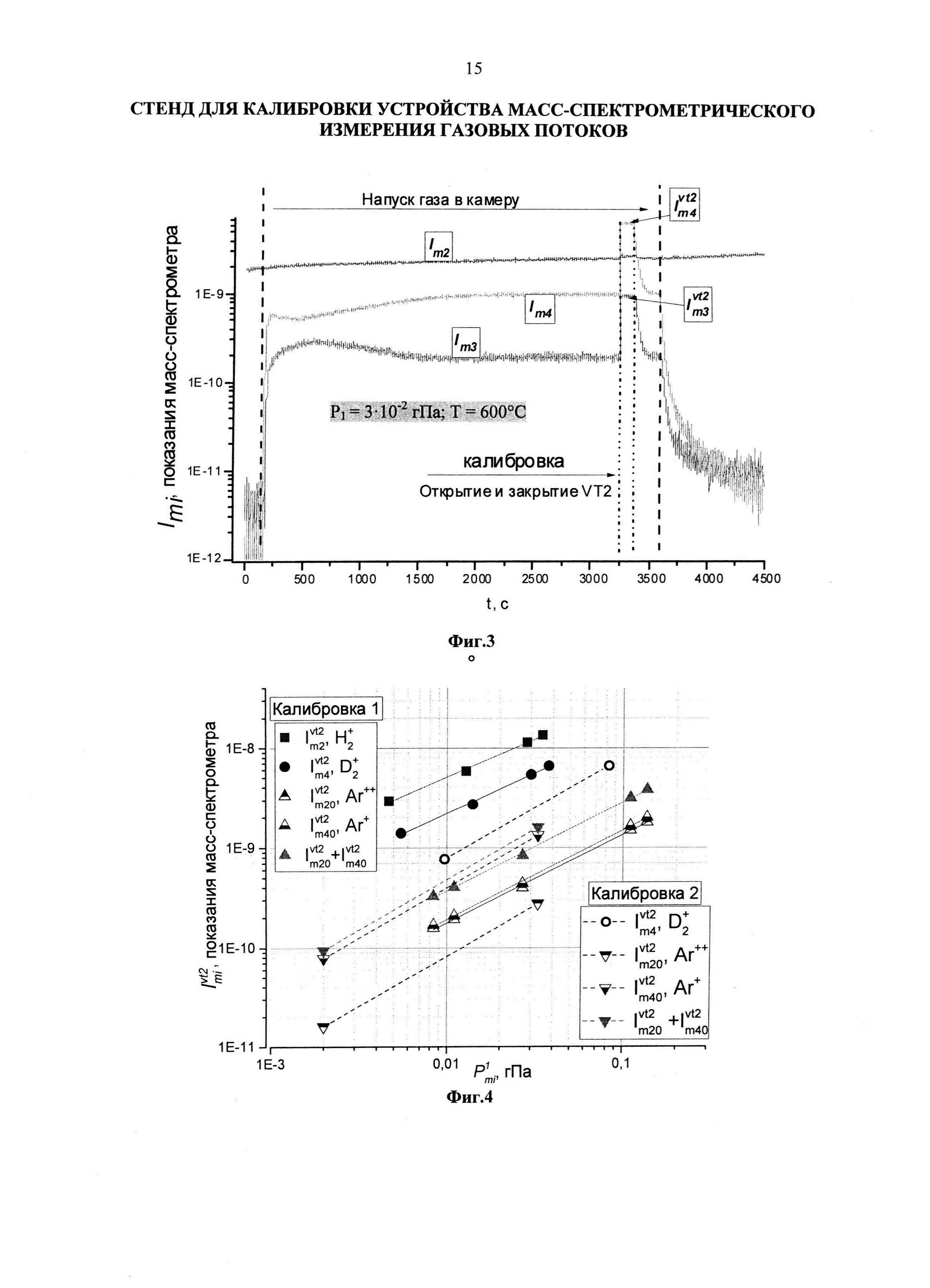 Изобретение относится к вакуумной технике, масс-спектрометрической технике и может быть использовано в области исследования газовой проницаемости материалов и задач, сопряженных с точным измерением газовых потоков. Стенд для калибровки устройства масс-спектрометрического измерения газовых потоков содержит камеру напуска газа, соединенную с датчиком давления, не чувствительным к роду газа, камеру регистрации газового потока, соединенную с масс-спектрометром и комбинированным полнодиапазонным датчиком давления газа, системы вакуумной откачки камер, камеры напуска газа и регистрации газового потока соединены магистралью с вентилем, при этом на конце магистрали, введенном в камеру напуска газа, установлена газопроницаемая мембрана, кроме того, камеры напуска газа и регистрации газового потока соединены магистралью с двумя вентилями, между которыми установлена калиброванная течь с молекулярным режимом течения газового потока. Изобретение обеспечивает калибровку масс-спектрометрометрического устройства в широком диапазоне измеряемых газовых потоков. 1 з.п. ф-лы, 4 ил.