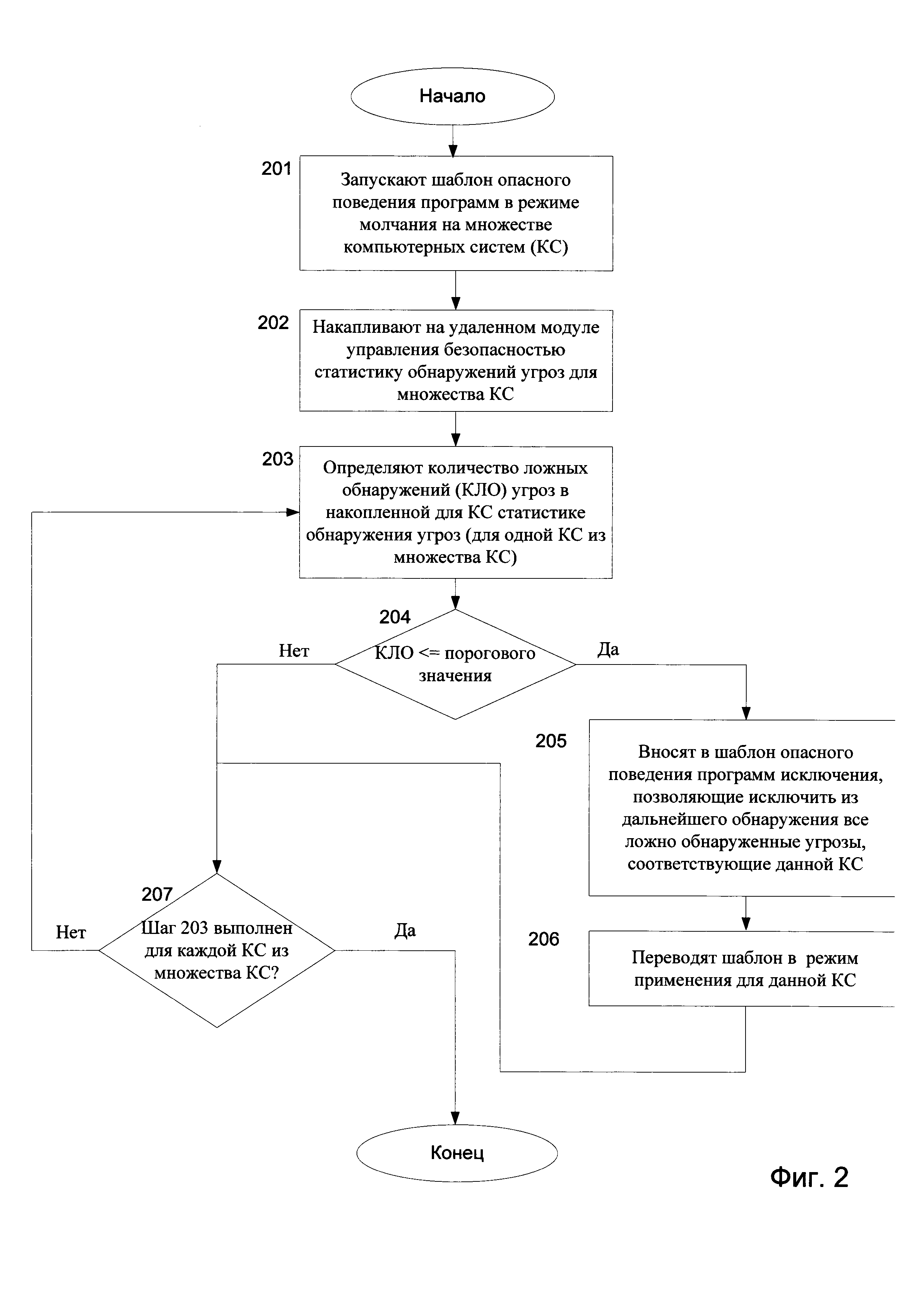1. Способ избирательного использования шаблона опасного поведения программ на компьютерных системах, по которому: а) запускают на множестве компьютерных систем при помощи удаленного модуля управления безопасностью шаблон опасного поведения программ в первом режиме, при котором антивирусное приложение, запущенное на компьютерной системе, обнаруживает угрозы, соответствующие упомянутому шаблону, но не выполняет действий для их устранения; б) накапливают на удаленном модуле управления безопасностью статистику обнаружений угроз, соответствующих упомянутому шаблону, для каждой компьютерной системы из упомянутого множества в течение установленного периода времени; в) для каждой компьютерной системы, для которой количество ложных обнаружений угроз в накопленной для данной компьютерной системы статистике обнаружения угроз не превышает установленного порогового значения, при помощи удаленного модуля управления безопасности осуществляют: внесение в шаблон опасного поведения программ всех ложно обнаруженных угроз, соответствующих конкретной компьютерной системе, в качестве исключений и перевод шаблона опасного поведения программ во второй режим, при котором антивирусное приложение, запущенное на компьютерной системе, обнаруживает угрозы, соответствующие упомянутому шаблону, и выполняет действия для их устранения. 2. Способ по п. 1, где угрозами являются вредоносные программы. 3. Способ по п. 1, где ложно обнаруженными угрозами являются доверенные программы. 4. Способ по п. 1, где определение того, что обнаруженная угроза является ложно обнаруженной угрозой, осуществляется при помощи удаленного модуля управления безопасностью, проверкой программ, соответствующих выявленным угрозам, по базам доверенных программ после истечения упомянутого установленного периода времени. 5. Способ по п. 4, где базы доверенных программ, по которым осуществляется упомянутая проверка, расположены локально по отношению к каждой компьютерной системе и/или удаленно. 6. Способ по п. 1, где действиями для устранения угроз являются: - удаление вредоносной программы; - восстановление компьютерной системы; - запрос действий у пользователя; - помещение вредоносной программы на карантин.
