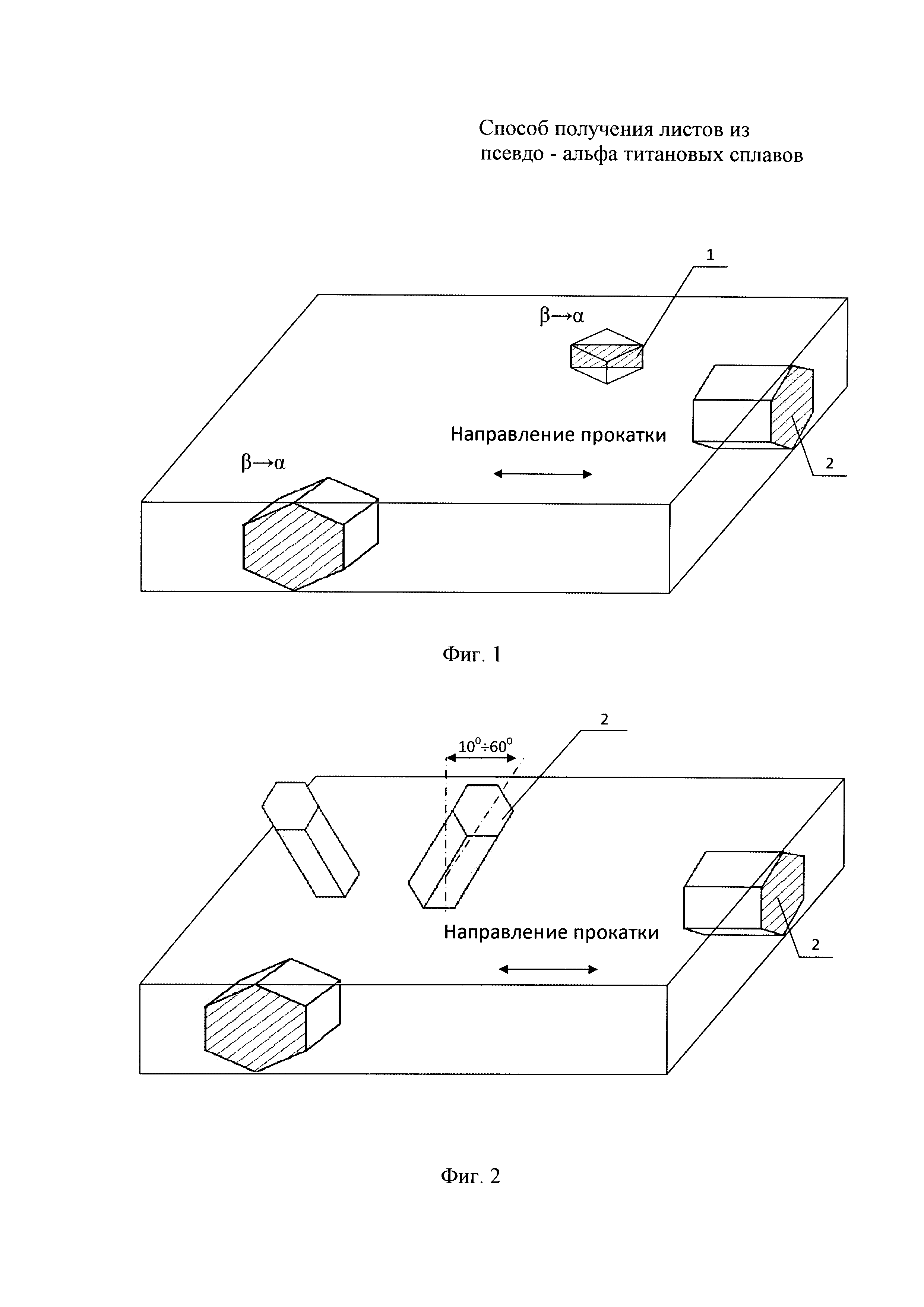 Способ получения листов из псевдо-альфа титановых сплавов, включающий деформацию слитка в сляб, механическую обработку сляба, многопроходную прокатку сляба на подкат, резку подката на листовые заготовки, многопроходную горячую прокатку заготовок, холодную прокатку, отжиг и адъюстажную обработку листов, отличающийся тем, что многопроходную прокатку сляба на подкат проводят в β-области, с суммарной степенью деформации не менее 50%, горячую прокатку листовых заготовок проводят в два этапа, причем на первом этапе проводят продольную прокатку в (α+β)-области в интервале температур ниже температуры полиморфного превращения (ТПП) на 70-200°С, а на втором этапе проводят поперечную горячую прокатку с изменением направления прокатки на 90° в (α+β)-области в интервале температур ниже ТПП на 70-200°С с последующей холодной прокаткой с получением листов, при этом суммарная степень деформации при горячей и холодной прокатках на втором этапе составляет 60-90% при соотношении степеней деформации горячей к холодной прокатке от 0,8 до 1,2, отжиг листов производят при температуре 700-820°С в течение 0,5-1 часа, а затем осуществляют теплую прогладку при температуре 600±50°С.